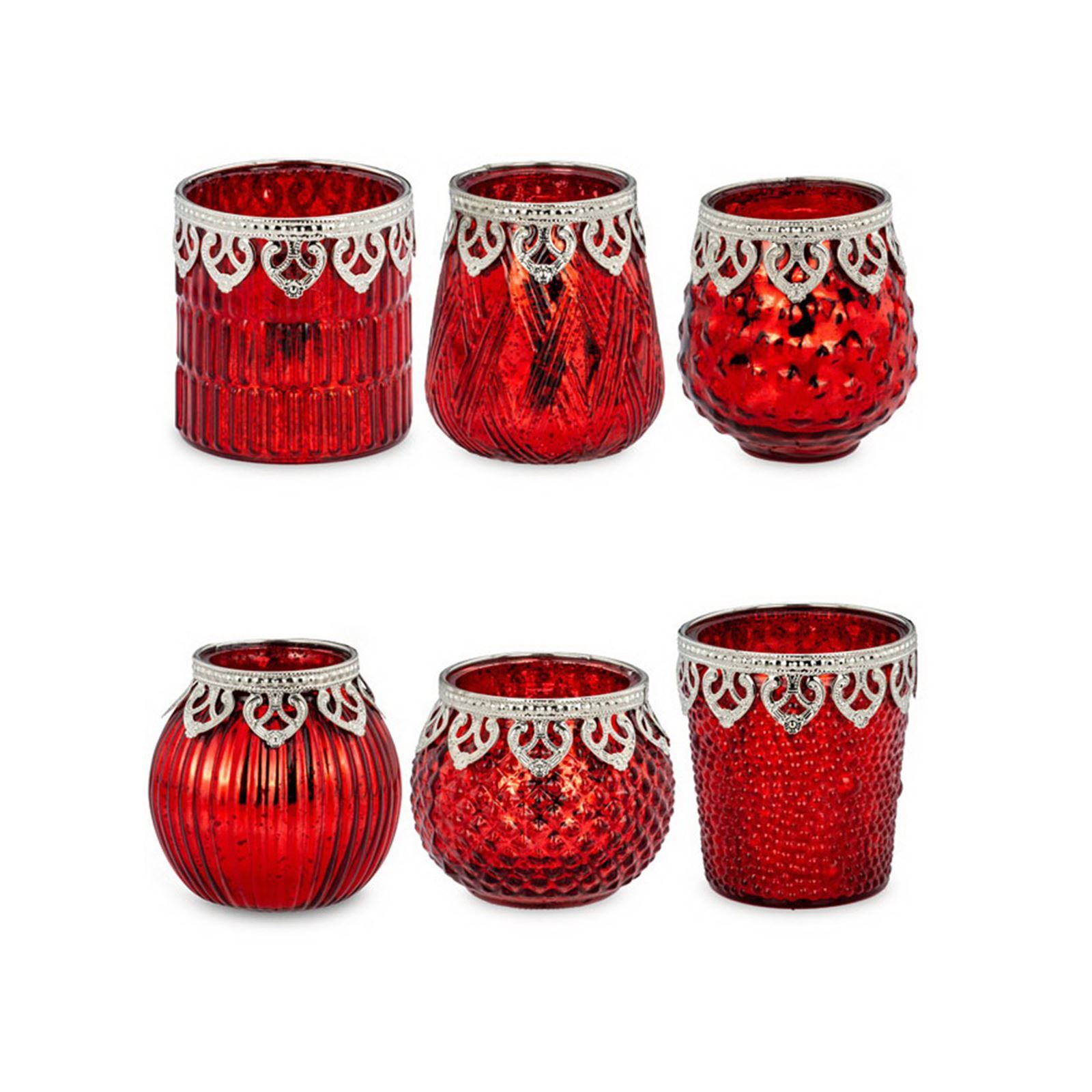 • Detailmaß ca.: Höhe: 9 - 10,5 cm, Ø: 8,5 - 10 cm • Material: Glas • Material 1: Metall • Oberfläche Details: mit Perlrand • spülmaschinengeeignet: nein • Farbe: rot • Funktionalität: Zum Halten von Teelichtern • Platzierungsart: zum Aufstellen • Form: rund, bauchig /gerade & konisch • Dimension: groß • Symbolik: Symbol für stilvolles Lichtdesign & warme Wohnakzente • Look & Stil: Elegant, stimmungsvoll, dekorativ, facettenreich, harmonisch • Setumfang: 6-teilig • Umgebungsnutzung: Für Innenbereich und geschützten Außenbereich • Anlass: Für Entspannung, Gemütlichkeit, Dekoration, Geschenk, Stil • Nutzungsbereich: Tisch, Sideboard, Balkon, Garten, Terrasse, Empfangsbereich • Nutzungsmöglichkeit: Teelicht einsetzen, Licht gestalten, Atmosphäre erzeugen • Besonderheit: Kerze/Teelicht nicht im Lieferumfang enthalten! • Gewicht ca.: 2,064 Kg