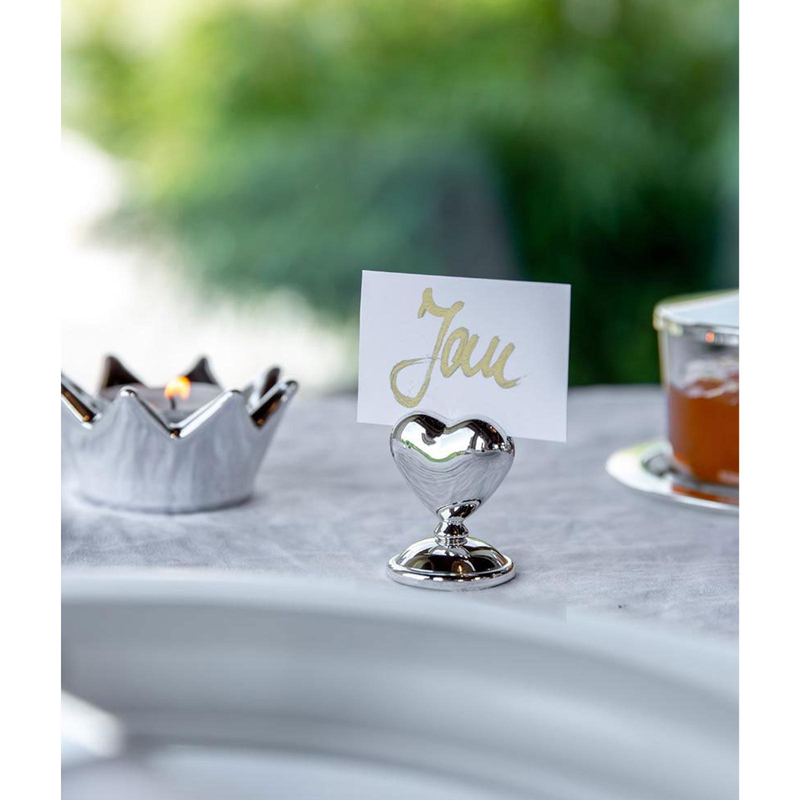 • Breite ca.: 1 cm • Höhe ca.: 4 cm • Durchmesser ca.: 3 cm • Material: Metall • Beschichtung: versilbert • Veredelung: anlaufgeschützt • Oberfläche: glatt poliert • spülmaschinengeeignet: nein • Farbe: silber • Ausstattung: kleine runde Standfüßen • Funktionalität: Zum Platzieren von Namens- und Tischkarten • Platzierungsart: Zum Aufstellen auf dem Tisch • Form: herzförmig • Dimension: klein • Motiv: Herzen • Motiv-Design: Halter in Herzform • Symbolik: Symbol für Verbundenheit, Wertschätzung & liebevolle Ordnung • Look & Stil: Liebevoll inszeniert, formklar & stilistisch fein abgestimmt • Setumfang: 6-teilig • Umgebungsnutzung: Für Innenbereich und geschützten Außenbereich • Anlass: Für Feier, Event, Hochzeit, Konferenz, Tischorganisation • Nutzungsbereich: Tafel, Bankett, Festtafel, Seminarraum, Gastronomie • Nutzungsmöglichkeit: Karten aufstellen, Plätze kennzeichnen, Tischnamen anzeigen • Gewicht ca.: 0,327 Kg