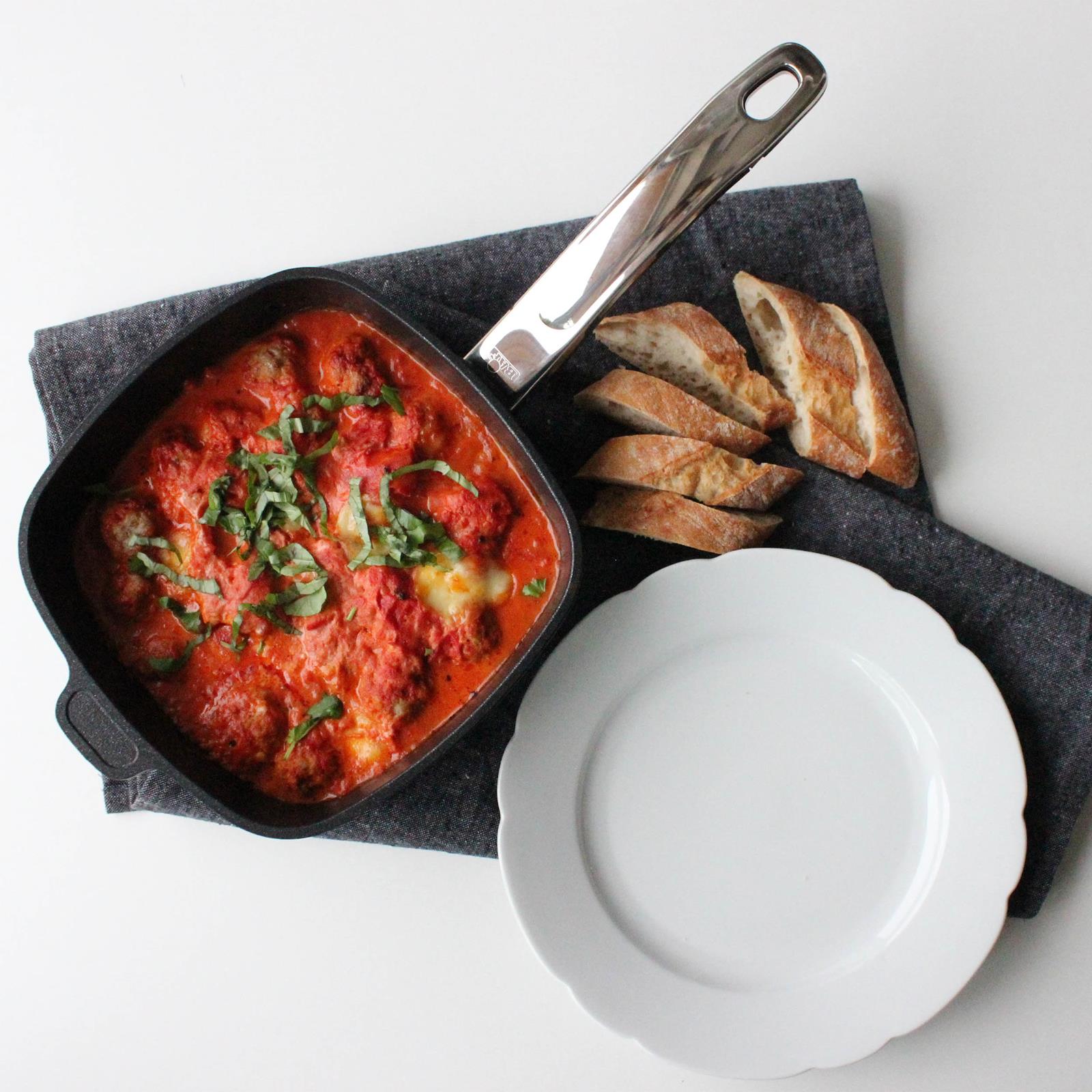 Die kleine, hohe induktionsgeeignete Aluguss Viereck-Bratpfanne mit einer Größe von 20x20 cm und 1.8 Liter Fassungsvermögen ist die perfekte Ergänzung für Ihre Küche und wird beim täglichen Kochen, Braten oder Schmoren einen guten Eindruck hinterlassen. Diese klassische Eck-Schmorpfanne ermöglicht mit ihrer hohen Form beim Schmoren und Anbraten ein müheloses Hinzufügen von Flüssigkeiten z.B. zum Ziehen von Soßen.