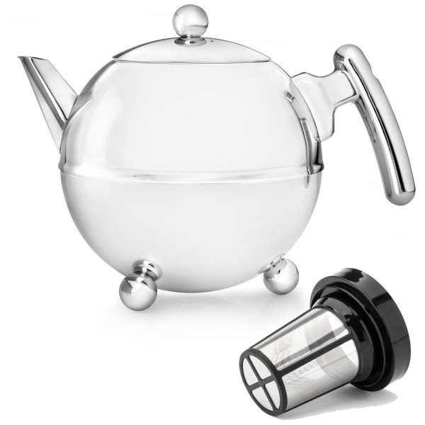 Der Vorteil dieses doppelwandigen chromfarbenen Edelstahlteekannen Sets ist seine isolierende Eigenschaft. Dank der doppelten Wand der praktischen breiten Teekanne mit 1.5 Liter Fassungsvermögen bleibt Ihr Tee, je nach Füllungsgrad, bis zu einer Stunde warm und geschmackvoll. Die funktionelle Kanne für Tee sorgt für einen idealen Temperaturverlauf und hält auch danach Ihr Heißgetränk langanhaltend warm! Durch den komfortablen Griff der außergewöhnlichen molligen Teekanne lässt sie sich auch befüllt gut handhaben. Der gutsitzende Teekannen-Deckel bleibt beim Eingießen auf der kugelrunden modernen Teekanne - selbst wenn Sie das in dem Tee-Set enthaltene feine Teesieb nutzen. Über Teekannenflecken brauchen Sie sich bei der hellen kugeligen Teekanne nicht zu sorgen, denn diese isolierende Teekanne mit Deckel verfügt über drei stabile Kunststoff-Füße. Das langlebige Filter-Sieb erleichtert zudem Ihre Teezubereitung enorm. Das feinporige Teesieb aus Kunststoff und Edelstahl bietet neben der Nachhaltigkeit auch ein optimales Aroma des Tees: Ganze Teeblätter haben genug Platz, um ihren Geschmack voll entfalten zu können und klein gemahlene Teeblätter bleiben in dem feingliedrigen Teesieb dieser Kugelkanne. Dazu bezaubert das optisch glänzende und edle Design der stilvollen Edelstahl-Teekanne jeden Teeliebhaber.