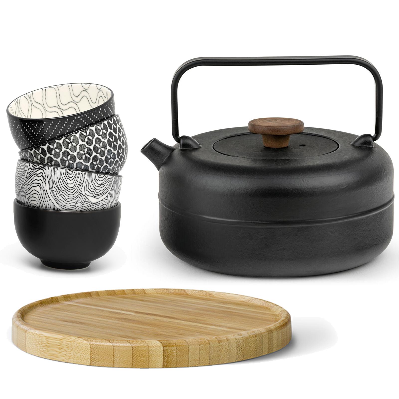 ✓ Kompakte Gusseisen-Teekanne mit Teefilter Sieb aus Edelstahl, 4 Teebecher und geradem Handgriff