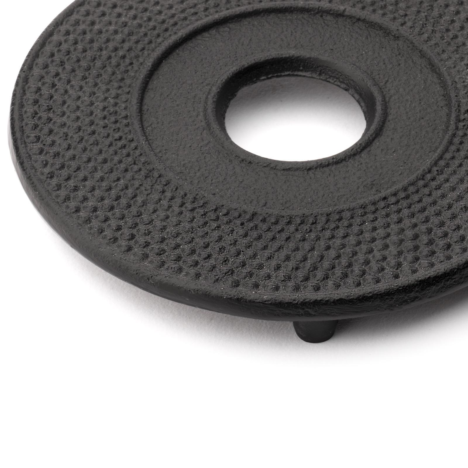 Der zum Set gehörende Gusseisen Untersetzer mit 3 rutschfesten Gummifüßchen schützt Ihre Tisch- oder Arbeitsflächen zuverlässig vor Hitze und Kratzern. Stellen Sie die Teekanne stets auf den Untersetzer, sobald sie mit heißem Wasser gefüllt ist. Durch die 3 Gummifüßchen bleibt der Untersetzer stabil stehen und verhindert ein Verrutschen. Nutzen Sie den Untersetzer ausschließlich für hitzebeständige Oberflächen.