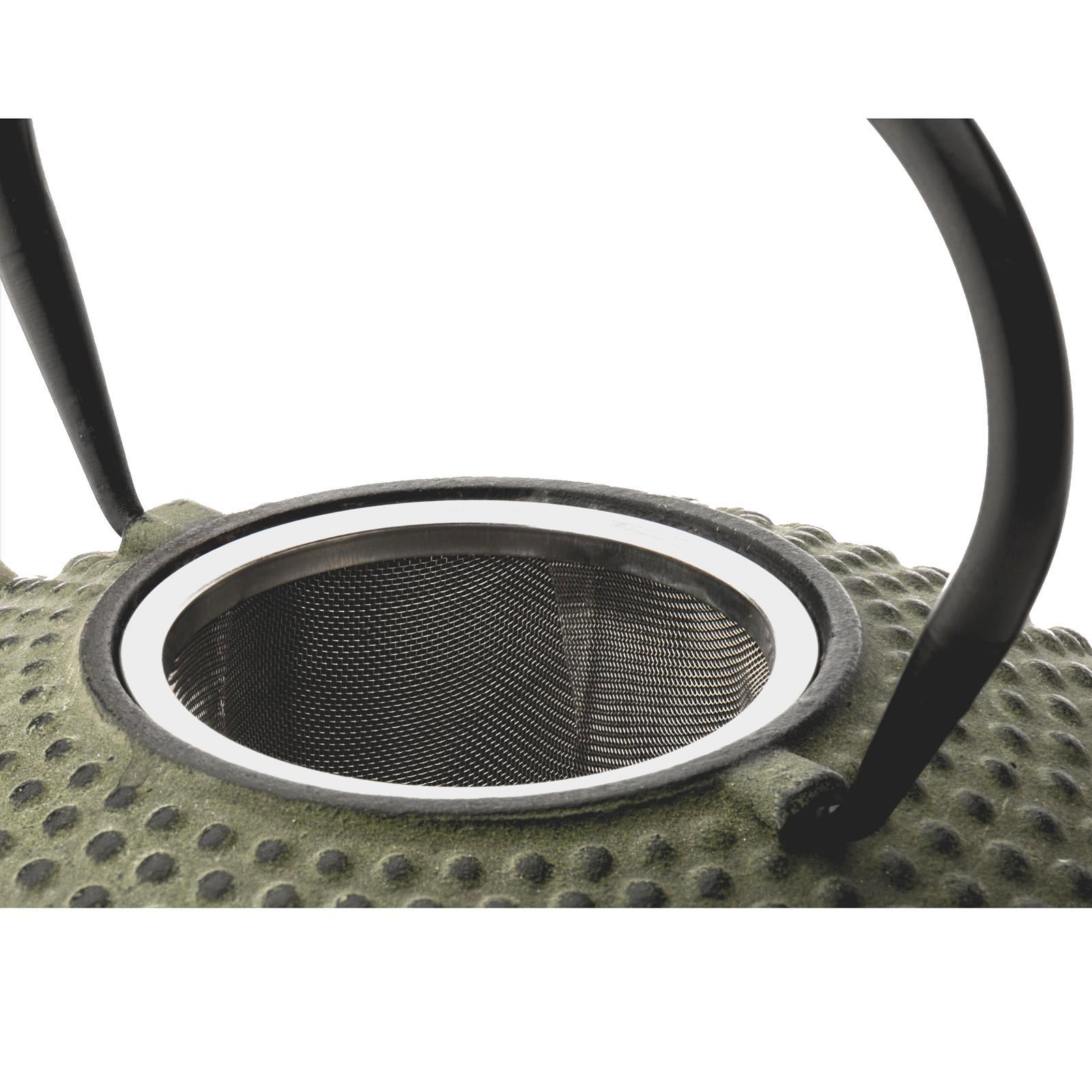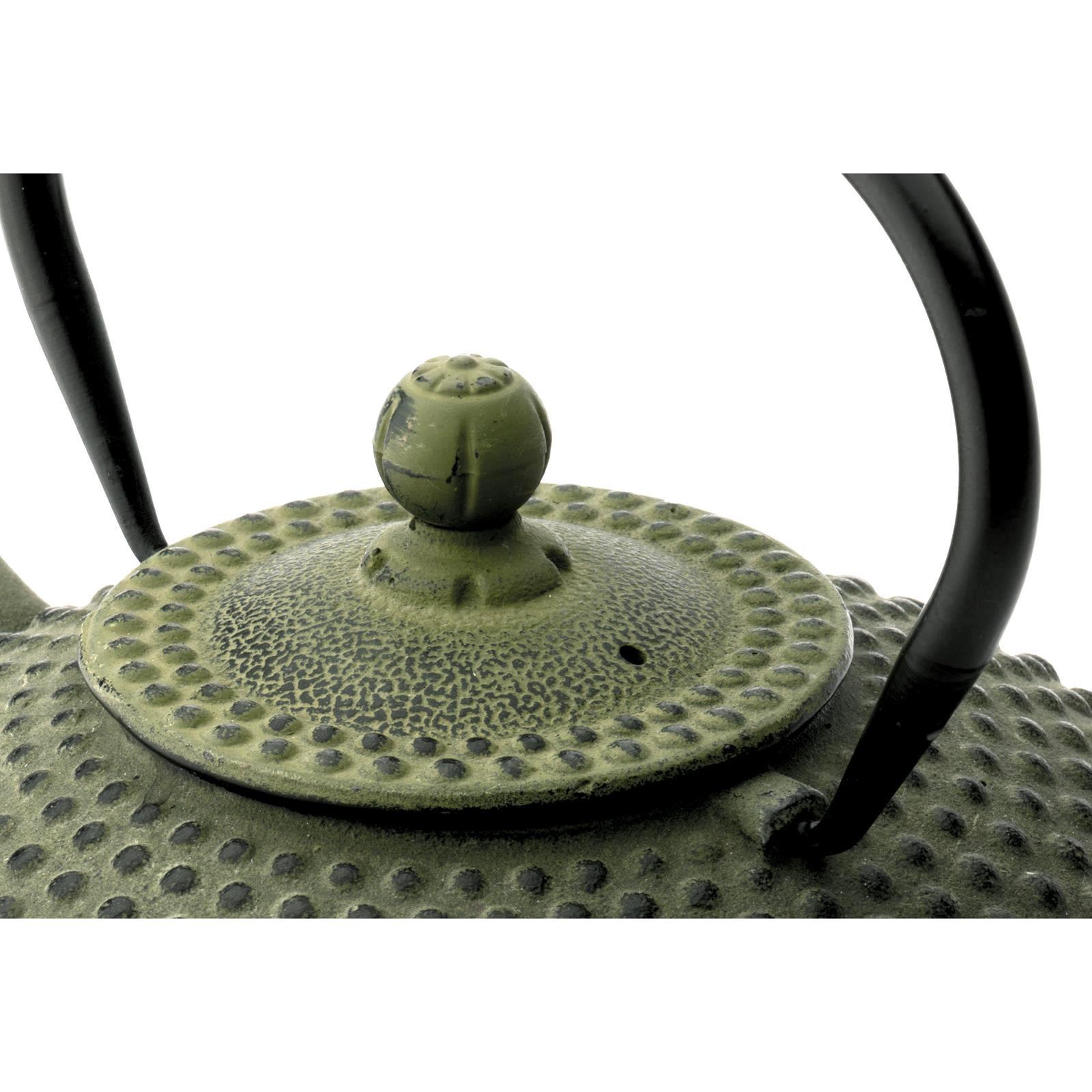 • Länge: 21.6 cm • Breite: 18.1 cm • Höhe: 14.9 cm • Inhalt: 0.8 Liter • Material: Gusseisen • Innen-Material: emailliert • Griff-Material: Gusseisen • Oberfläche: genoppt • Farbe: grün • Teekannenfarbe: grün • Deckelfarbe: grün • Griff-Farbe: schwarz • Finish: matt • Form: robust • Ausführung: flach • Produktdimension: klein • Teefilter-Sieb: inklusive (Edelstahl) • Beschaffenheit: nicht spülmaschinengeeignet • Besonderheit: für alle Teesorten geeignet • Eigenschaft: mit Noppenstruktur • Design: asiatisch • Stil: traditionell • Anlass: gedeckter Tisch, Kaffee- und Teetafel • Serie: Asia Xilin • Isolierung: Tee bleibt länger warm • Modell: G001GR • Gewicht ca.: 1,8 Kg