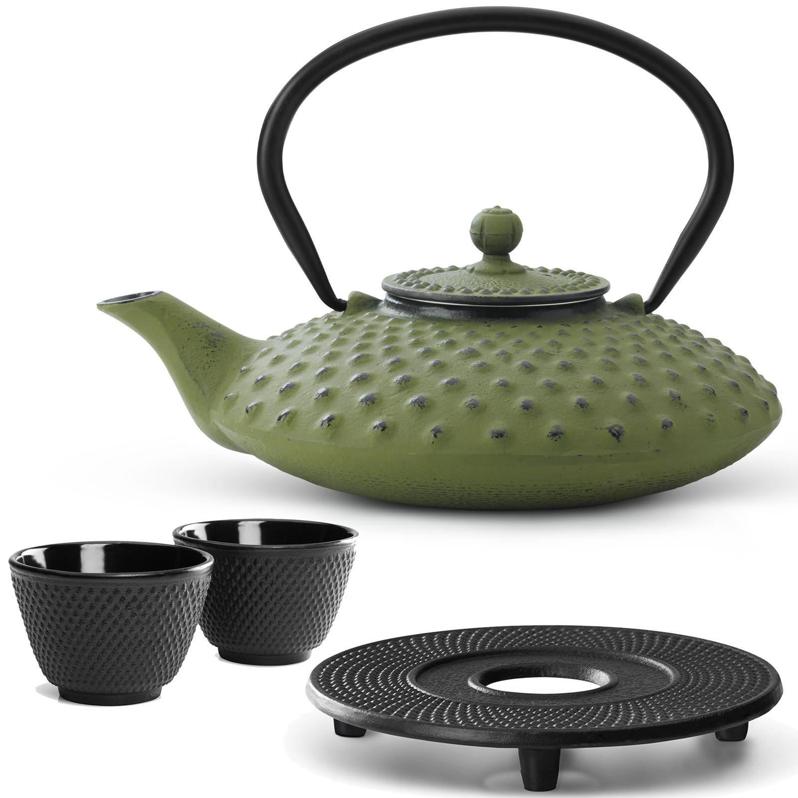 Genießen Sie stilvollen Teegenuss mit dieser gusseisernen Teekanne (800 ml) in elegantem, frischen Grün, die dank ihrer emaillierten Innenfläche das volle Aroma von losem Tee bewahrt und die Wärme besonders lange speichert. Im Set enthalten ist ein passender schwarzer Untersetzer aus Gusseisen mit drei rutschfesten Gummifüßchen, der empfindliche Oberflächen zuverlässig schützt und zugleich für sicheren Stand sorgt. Zwei passende Becher ohne Henkel runden das Ensemble ab und machen es ideal für gemütliche Teestunden zu zweit. Die robuste Teekanne überzeugt durch ihre langlebige Verarbeitung und gleichmäßige Wärmeverteilung, sodass Ihr Tee länger heiß bleibt. Das feinmaschige, wiederverwendbare Edelstahl-Teesieb ermöglicht eine unkomplizierte Zubereitung verschiedenster Teesorten - von Oolong über Weißtee bis hin zu aromatischem Früchtetee. Das grüne Design mit dezenten, asiatisch inspirierten Details macht die Kanne zu einem echten Blickfang auf dem Tisch und passt gleichermaßen in moderne wie klassische Einrichtungen. Mit einem Fassungsvermögen von 0.8 Liter ist die Teekanne optimal für 2-3 Portionen Tee geeignet und damit perfekt für kleine Runden, entspannte Nachmittage oder besondere Momente der Ruhe. Dieses hochwertige Teeset vereint Funktionalität, Ästhetik und Komfort in einem Produkt - ein stilvolles Geschenk für Teeliebhaber oder eine Bereicherung für Ihr eigenes Zuhause.