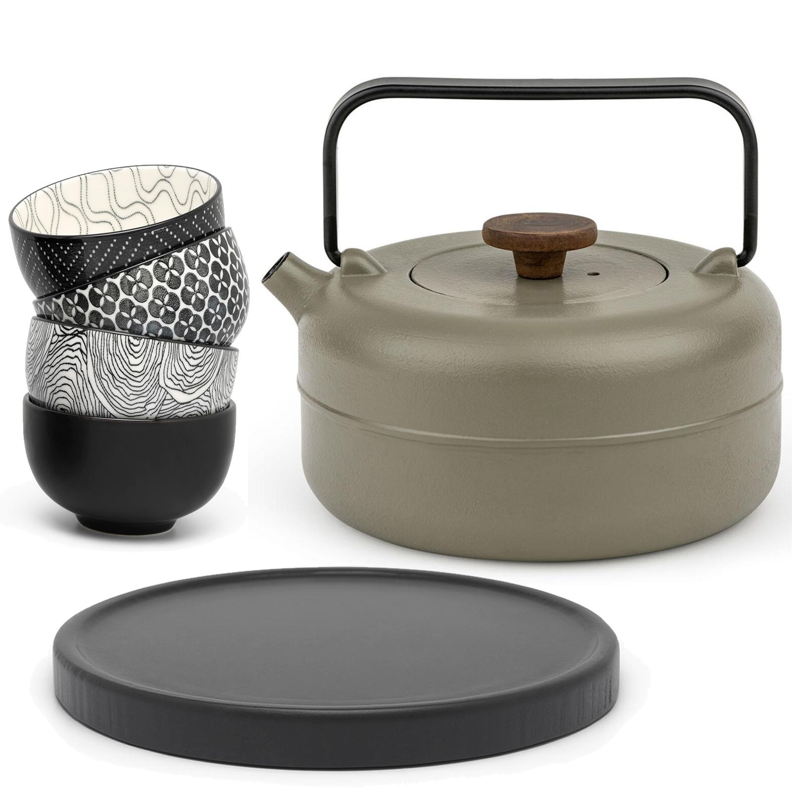 Produkt-Eigenschaften ✓ Die Guss-Teekanne in Khaki mit 0,75 Liter & schwarzem Untersetzer hält Tee besonders lange warm