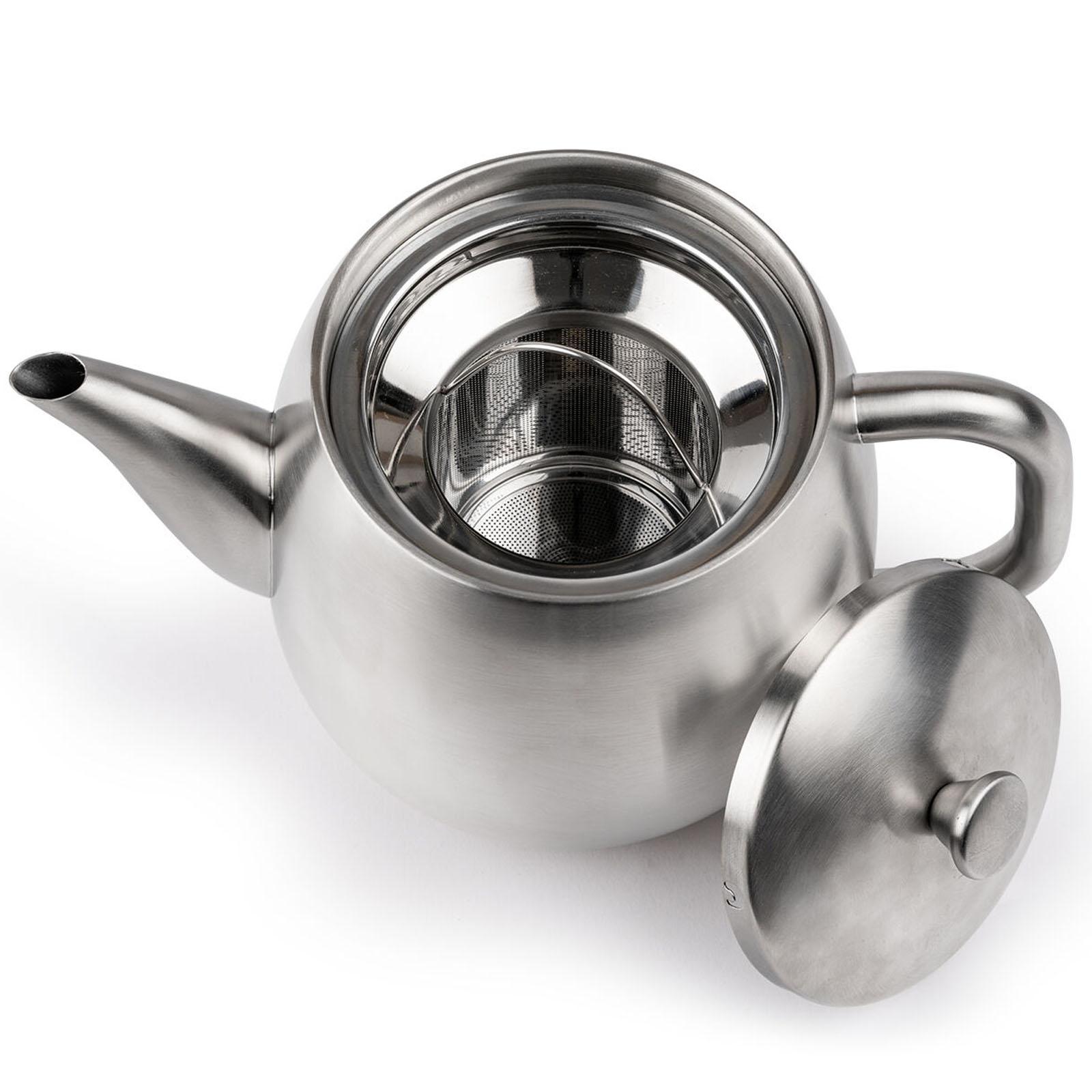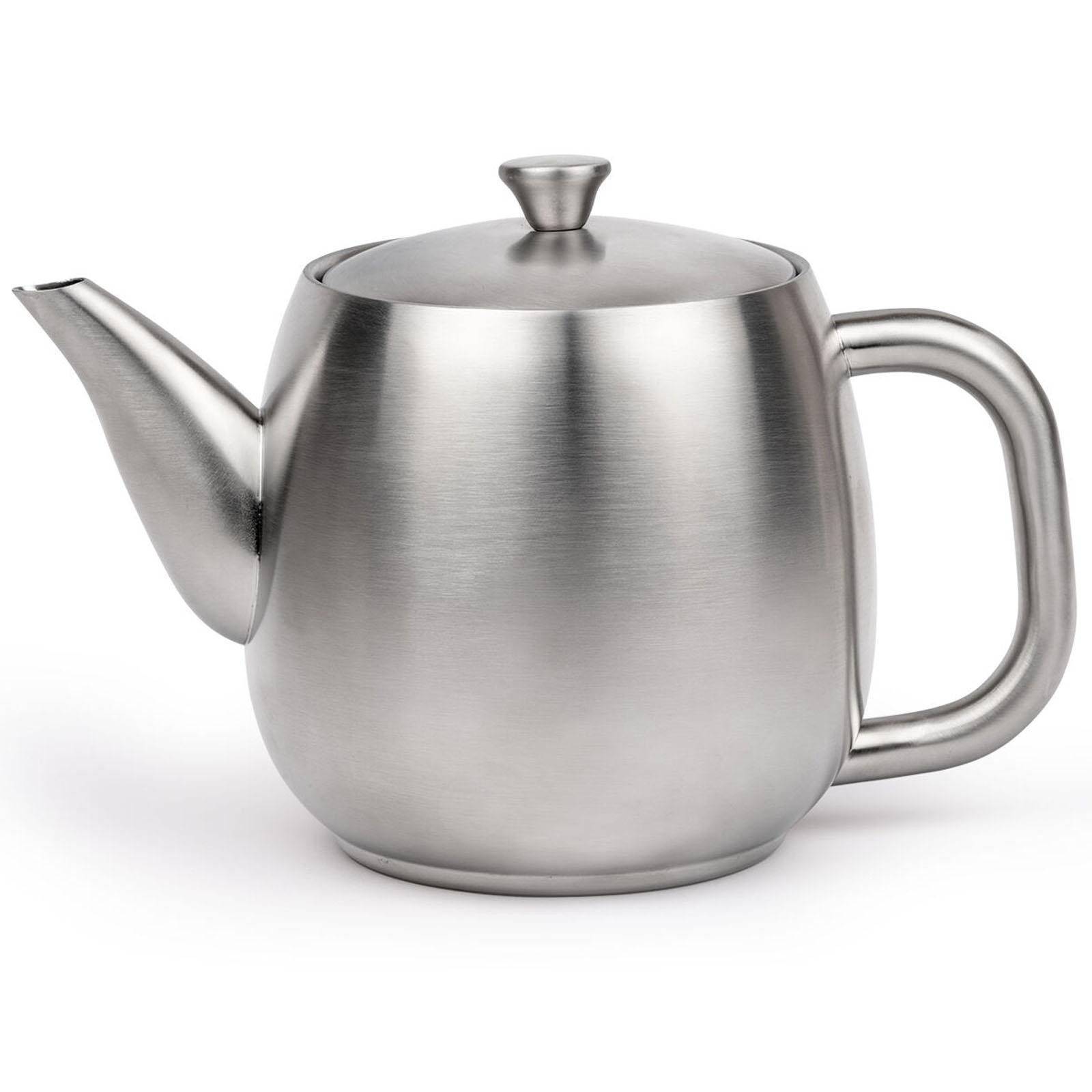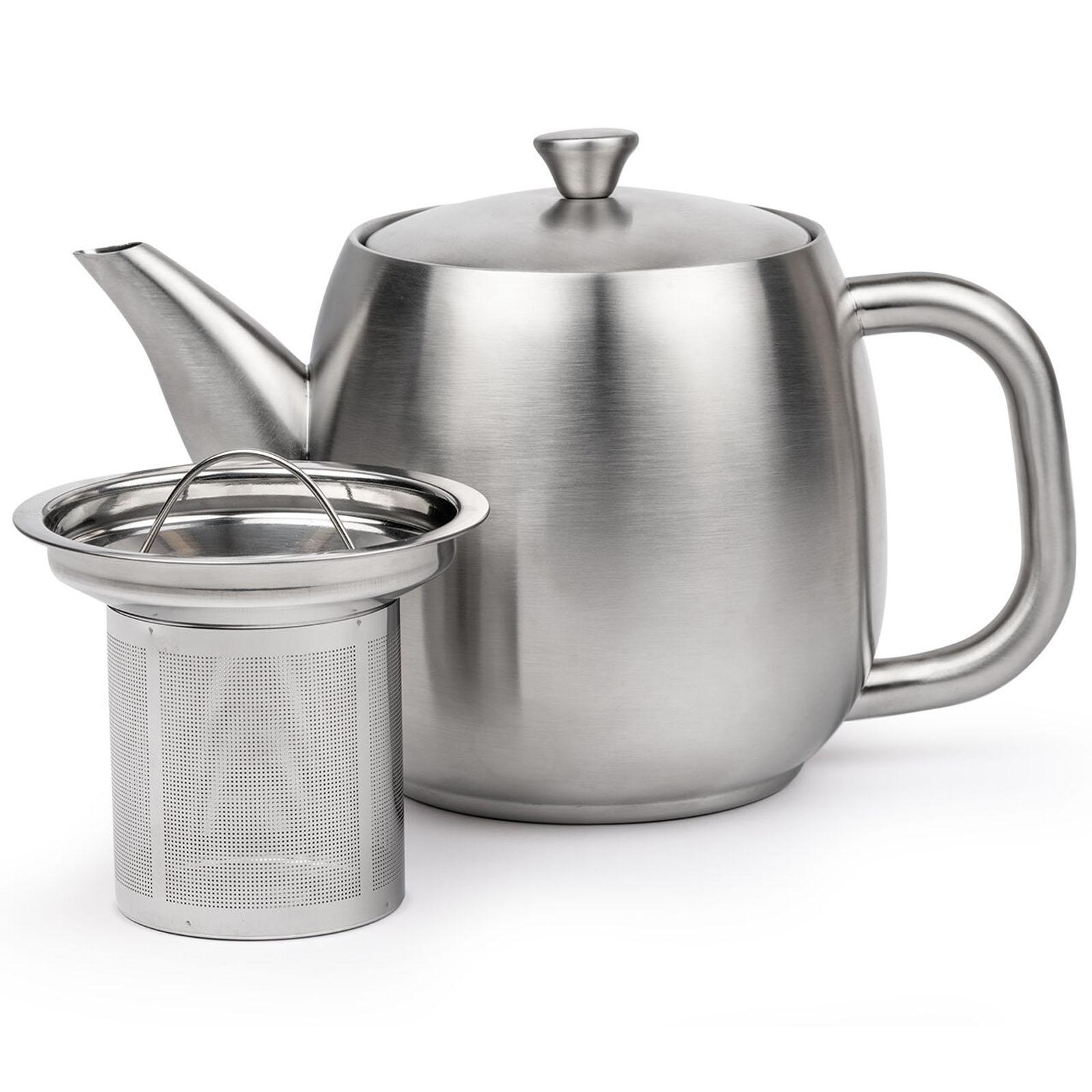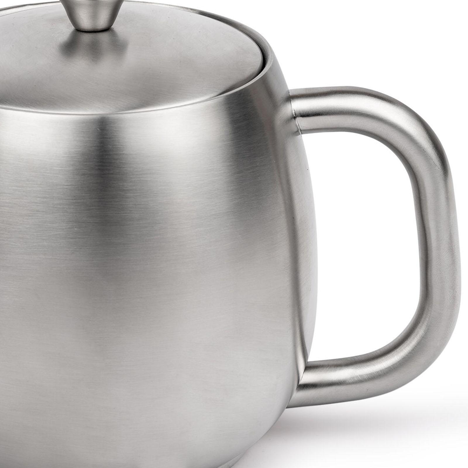 ✓ Die Teekanne aus Edelstahl ist doppelwandig, fasst 0.9 Liter & hält Ihren Tee bis zu 1 Stunde warm ✓ Aufgrund der isolierten Innenkonstruktion der Edelstahlkanne genießen Sie den Tee noch länger ✓ Die speziell geformte Ausgießtülle der Edelstahlteekanne ermöglicht ein tropffreies Einschenken ✓ Mit einem Fassungsvermögen von 900 ml bietet die Kanne zusätzlich einen Teefilter aus Edelstahl ✓ Kleine, bauchige Teekanne in mattem Silber - Der Griff sowie der Knopf bleiben einzig handwarm