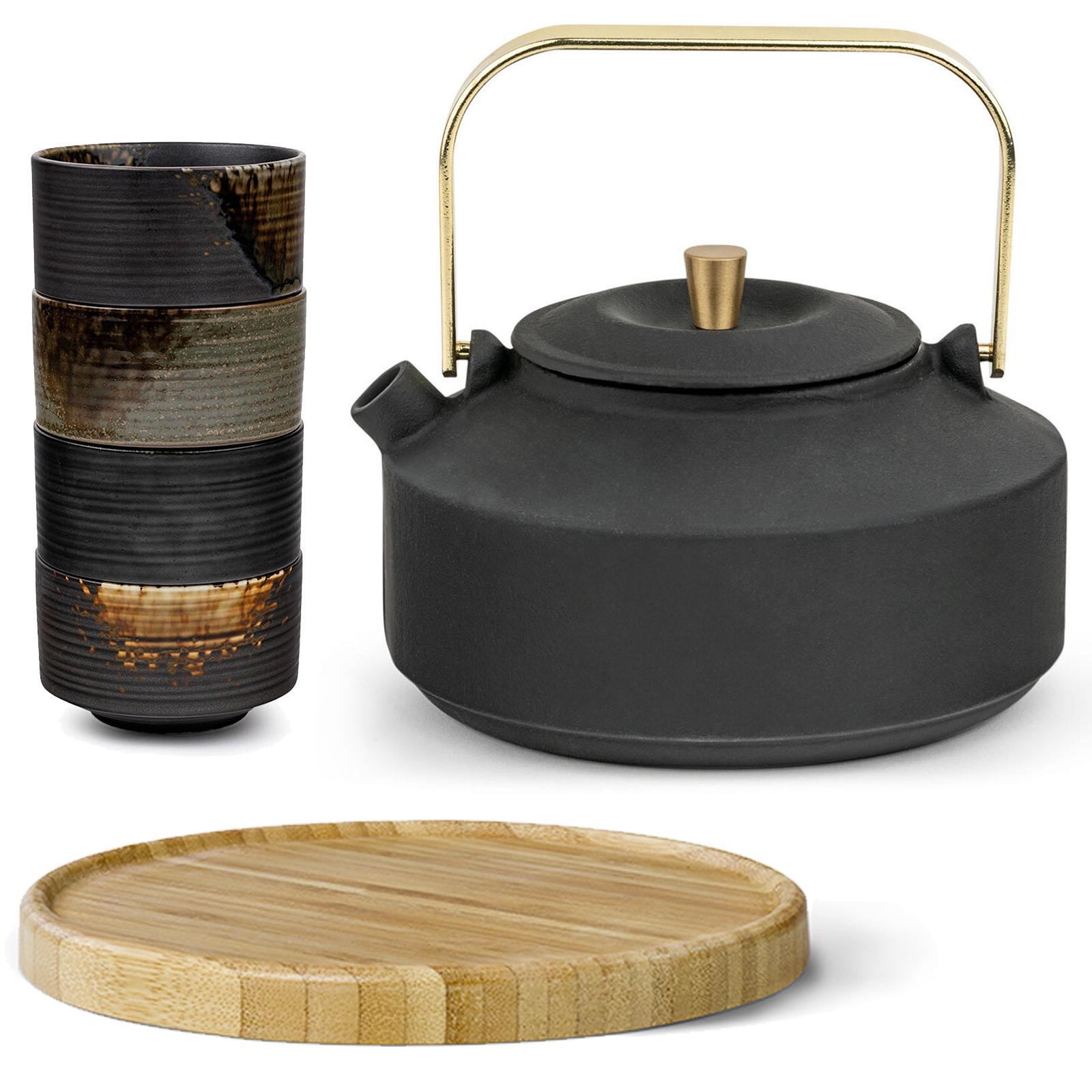 ✓ Matte Gusseisen-Teekanne mit goldfarbenem Teefilter, die vier Keramik-Teebecher runden das Set ab