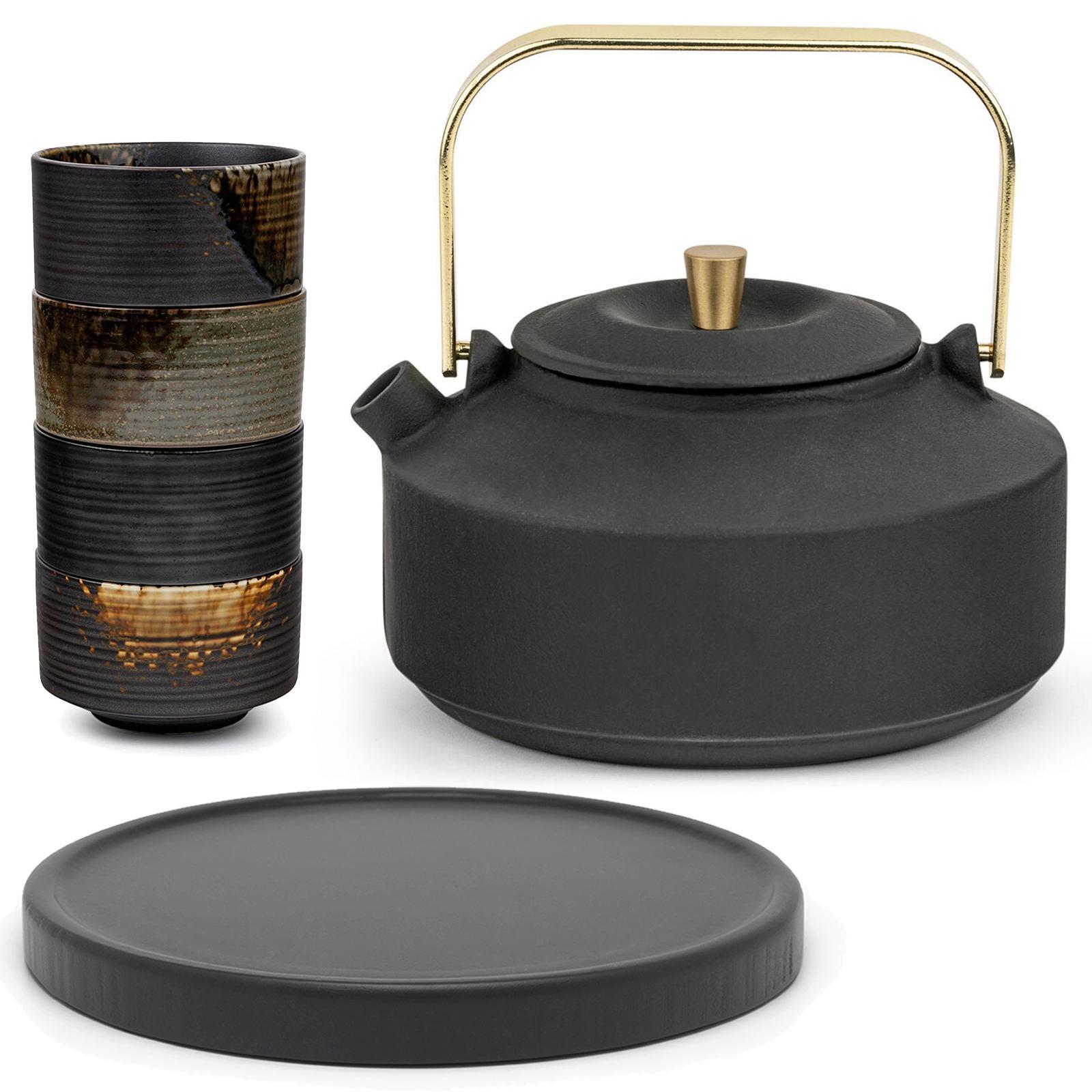 ✓ Matte Gusseisen-Teekanne mit goldfarbenem Teefilter, die vier Keramik-Teebecher runden das Set ab