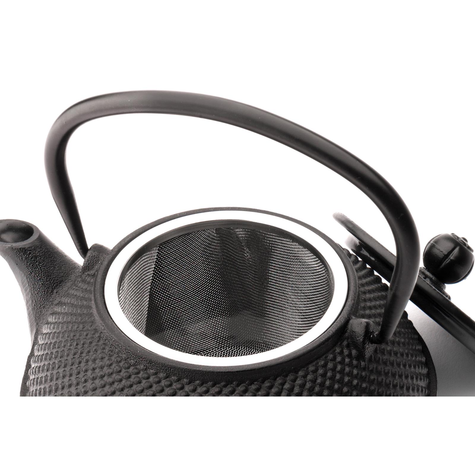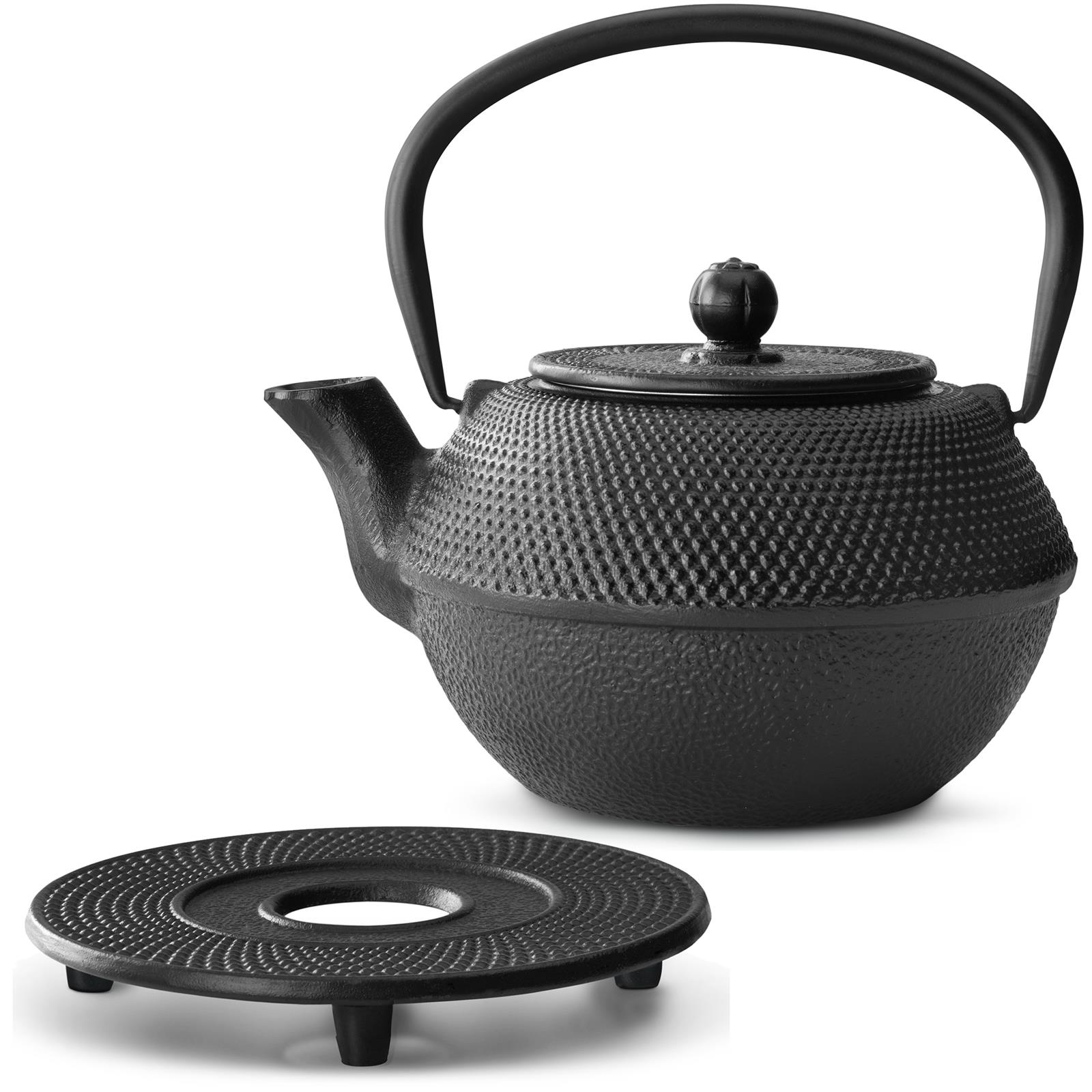 ☛ 1 schwarze Teekanne 0,8 Liter aus Gusseisen ☛ 1 gusseiserner Untersetzer ☛ 1 Teefiltersieb aus Edelstahl