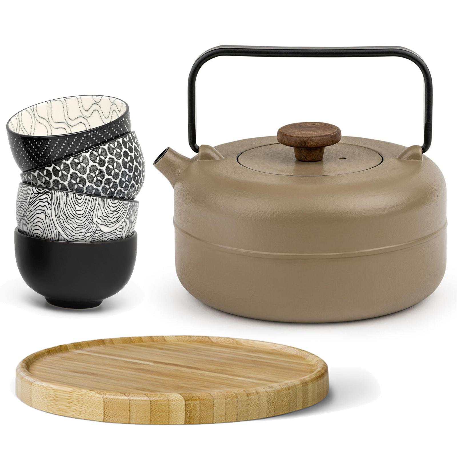 ✓ Kompakte Gusseisen-Teekanne mit Teefilter Sieb aus Edelstahl, 4 Teebecher und geradem Handgriff