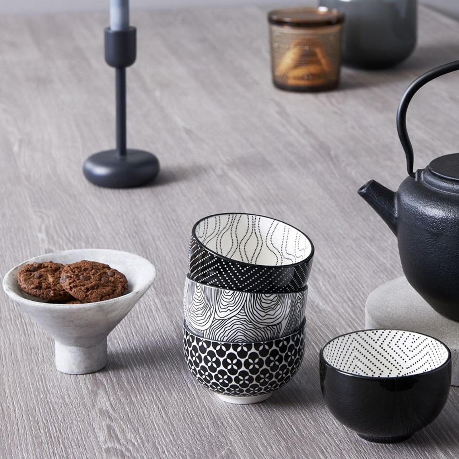 • Höhe: 6 cm • Durchmesser: 9.5 cm • Inhalt: 0.2 Liter • Material: Porzellan • Innen-Material: Porzellan • Oberfläche: glatt • Farbe: schwarz weiss • Finish: matt • Form: rund • Ausführung: flach • Produktdimension: klein • Beschaffenheit: spülmaschinengeeignet • Besonderheit: je Becher 20 cl Fassungsvermögen • Umfang: 4-teilig • Design: asiatisch • Stil: traditionell • Anlass: gedeckter Tisch, Kaffee- und Teetafel • Serie: Asia Pucheng • Modell: 152004 • Gewicht ca.: 0,9 Kg