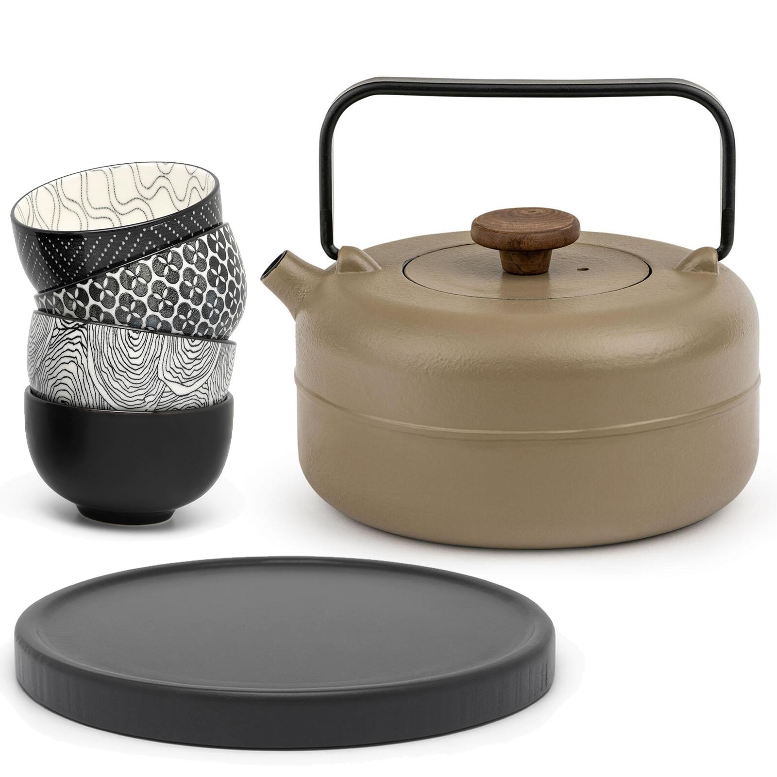 ✓ Kompakte Gusseisen-Teekanne mit Teefilter Sieb aus Edelstahl, 4 Teebecher und geradem Handgriff
