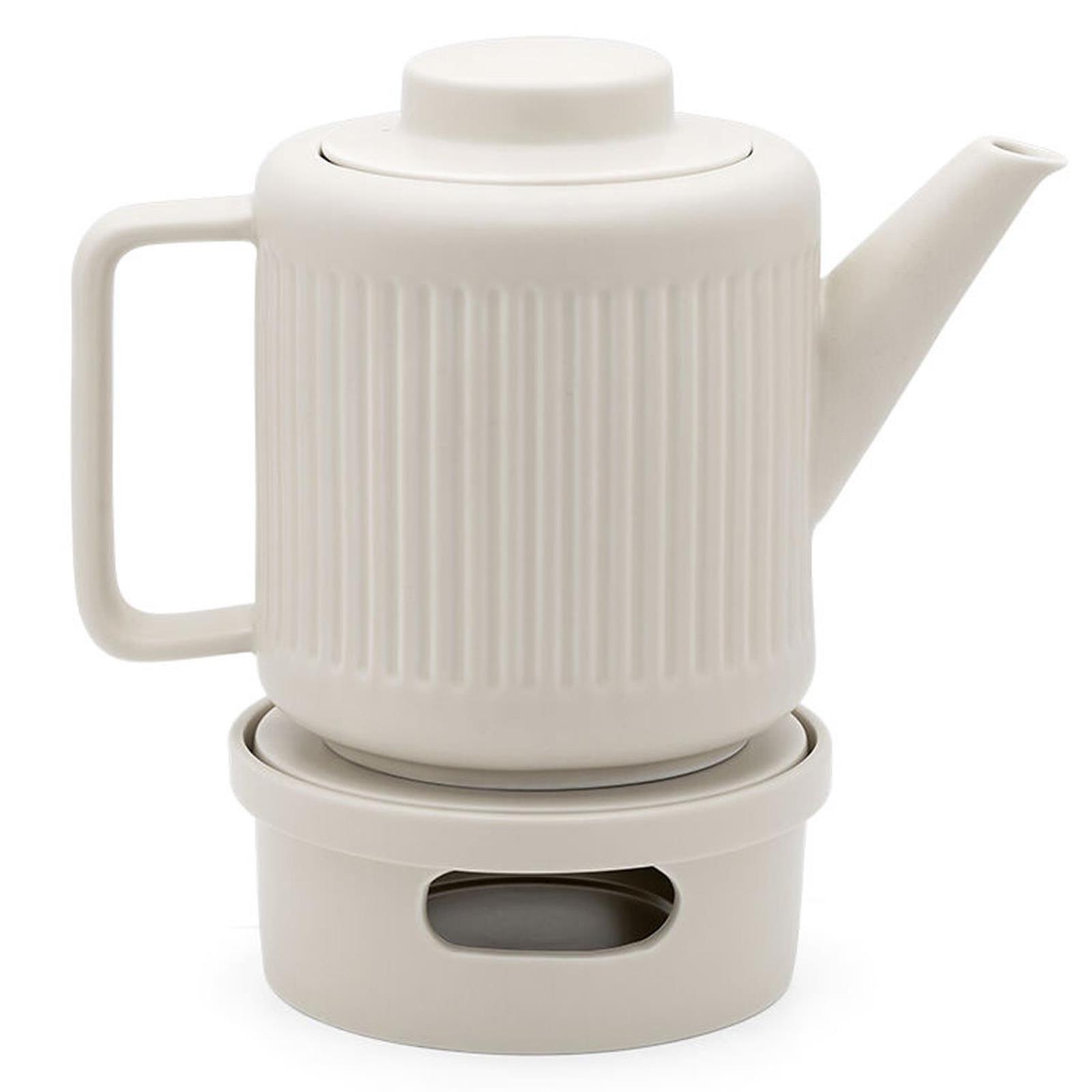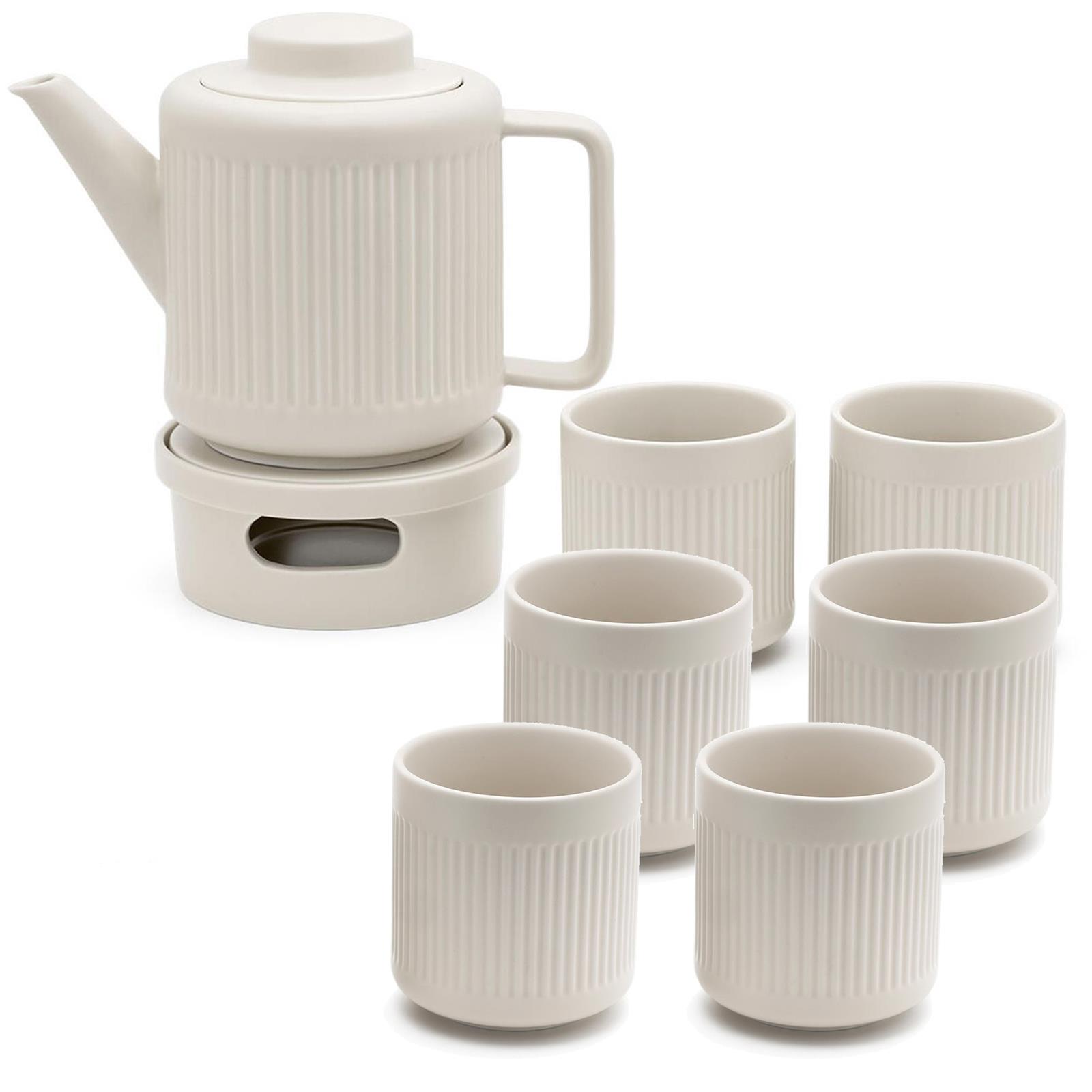 Die helle Teekanne aus Porzellan mit feinem Streifen-Dekor hält Ihren Tee souverän geschmackvoll und vollmundig. So können Sie Ihren losen Früchtetee, Pfefferminztee, Kräutertee, Kamillentee oder Ihren aromatischen Ostfriesentee ganz bequem mit dem innenliegendem Tee-Filter-Sieb zubereiten und direkt servieren. Die hochwertige Porzellan-Teekanne ermöglicht Ihnen ein entspanntes Tee-Vergnügen - ob English Breakfast Tea, heißer Apfel oder aromatischer Sencha. Die Porzellan-Becher mit je 300 ml Fassungsvermögen sind grifflos und auf einem gedeckten Tisch ein dekorativer Hingucker. Das Kerzenlicht des weißen Teekessel-Wärmers sorgt zusätzlich für eine gemütliche Atmosphäre.