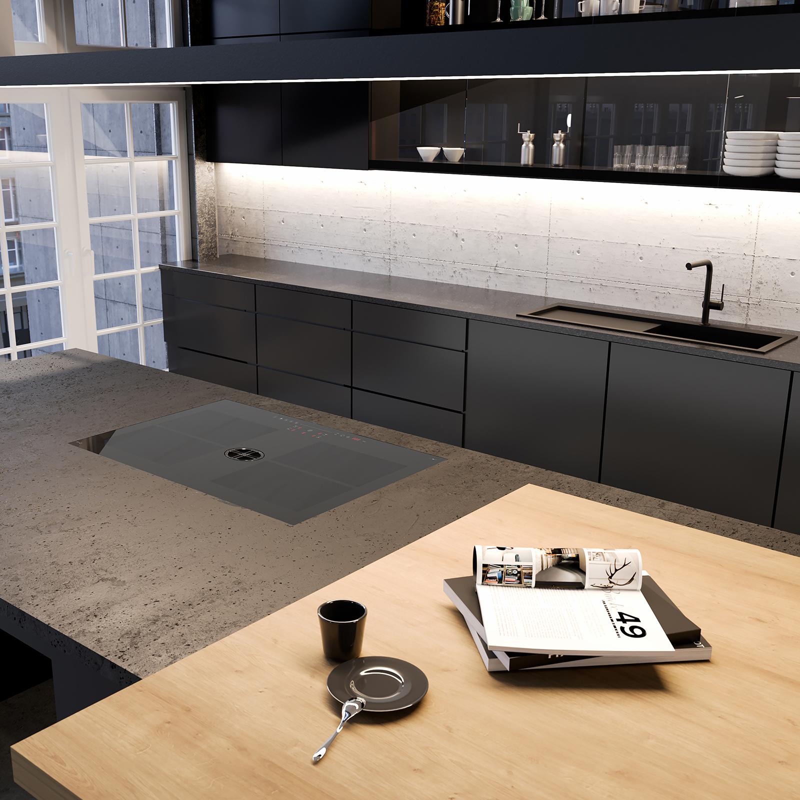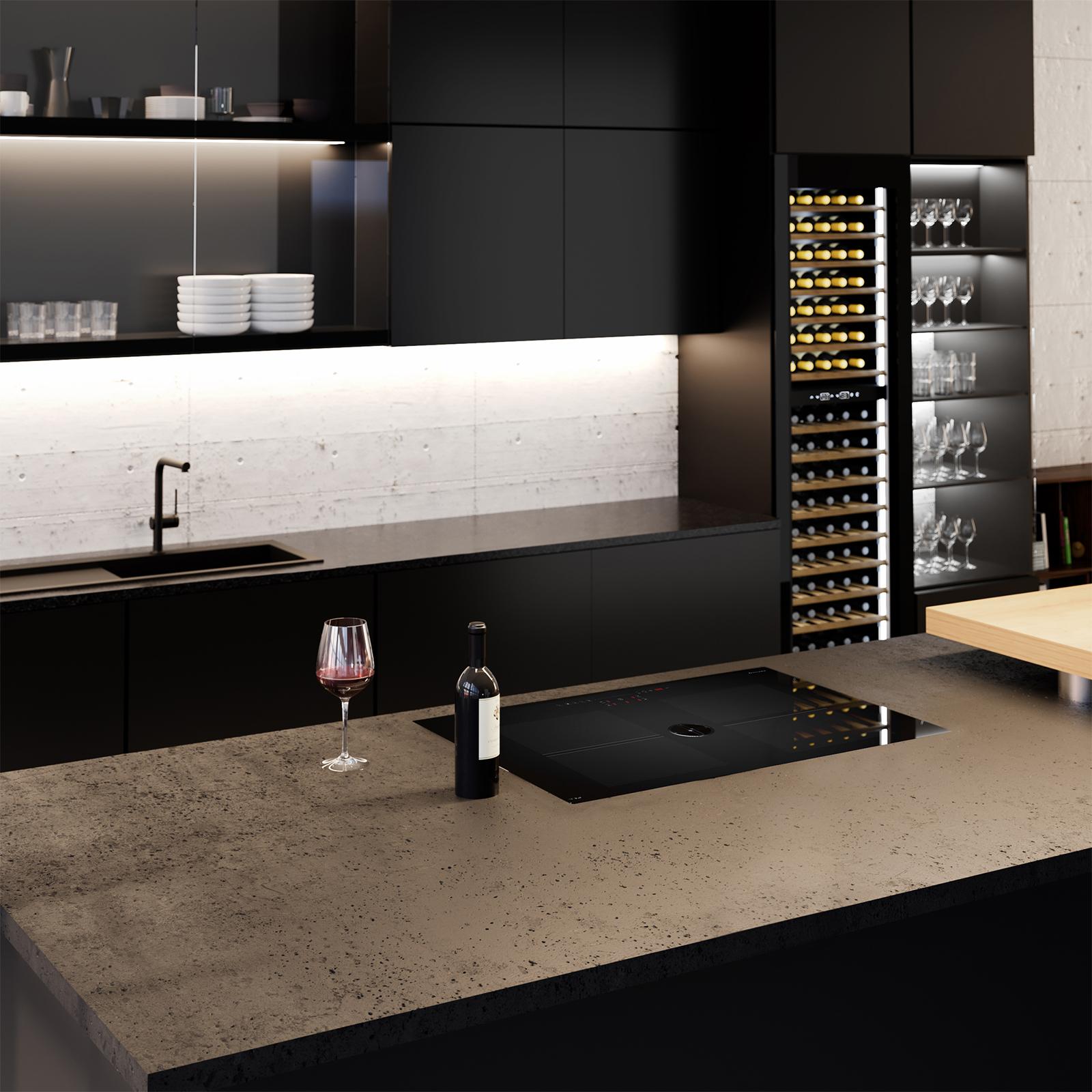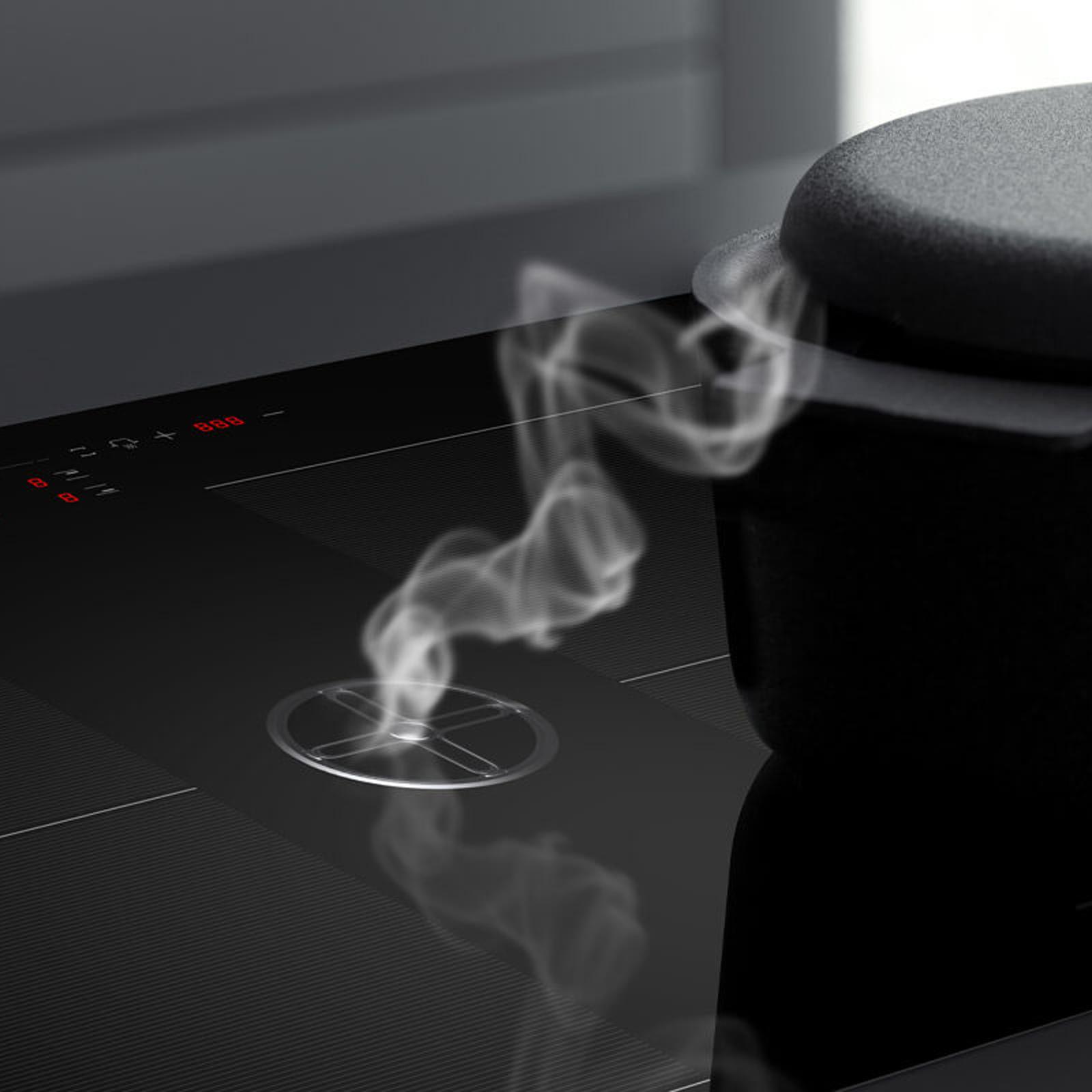 Ein besonders platzsparender Lüfterkern für den Umluftbetrieb ist zentral im Kochfeld integriert. Durch seine flache, kompakte Bauweise beansprucht er lediglich rund ein Drittel des Stauraums im Unterschrank und lässt damit ausreichend Platz für weitere Küchenelemente. Das leistungsstarke und zugleich geräuscharme, neunstufige Umluftsystem arbeitet wie ein klassischer Dunstabzug: Es entfernt zuverlässig Gerüche, Feuchtigkeit und unerwünschte Kochdünste, bevor diese sich im Raum ausbreiten, und sorgt so für eine angenehm neutrale Küchenatmosphäre.