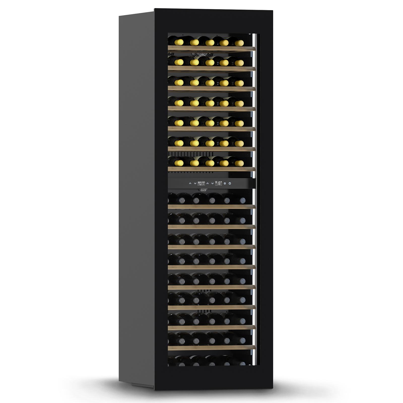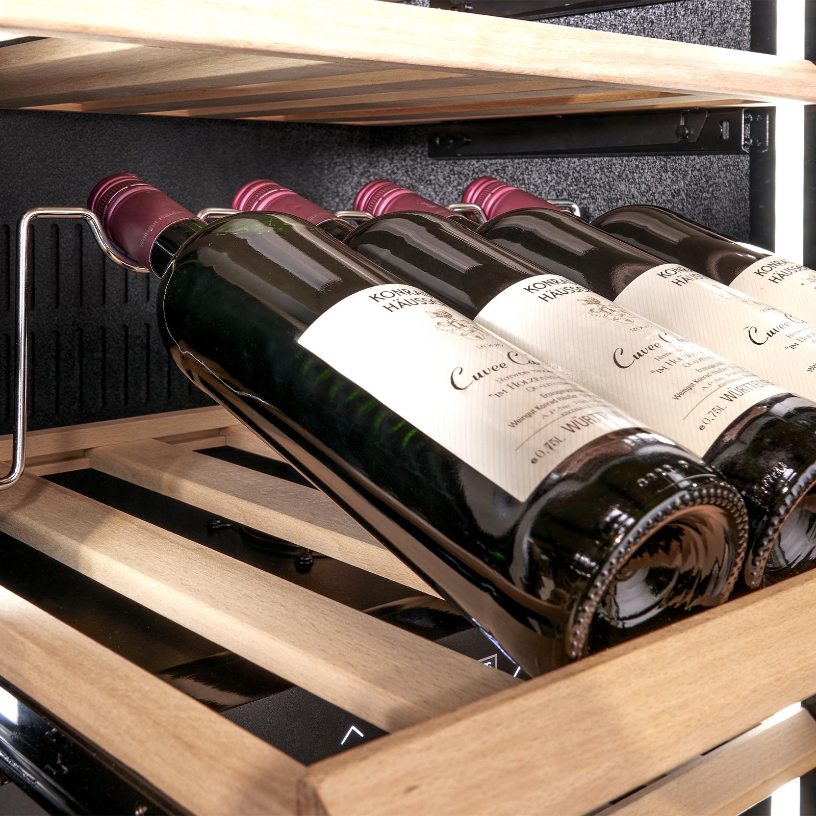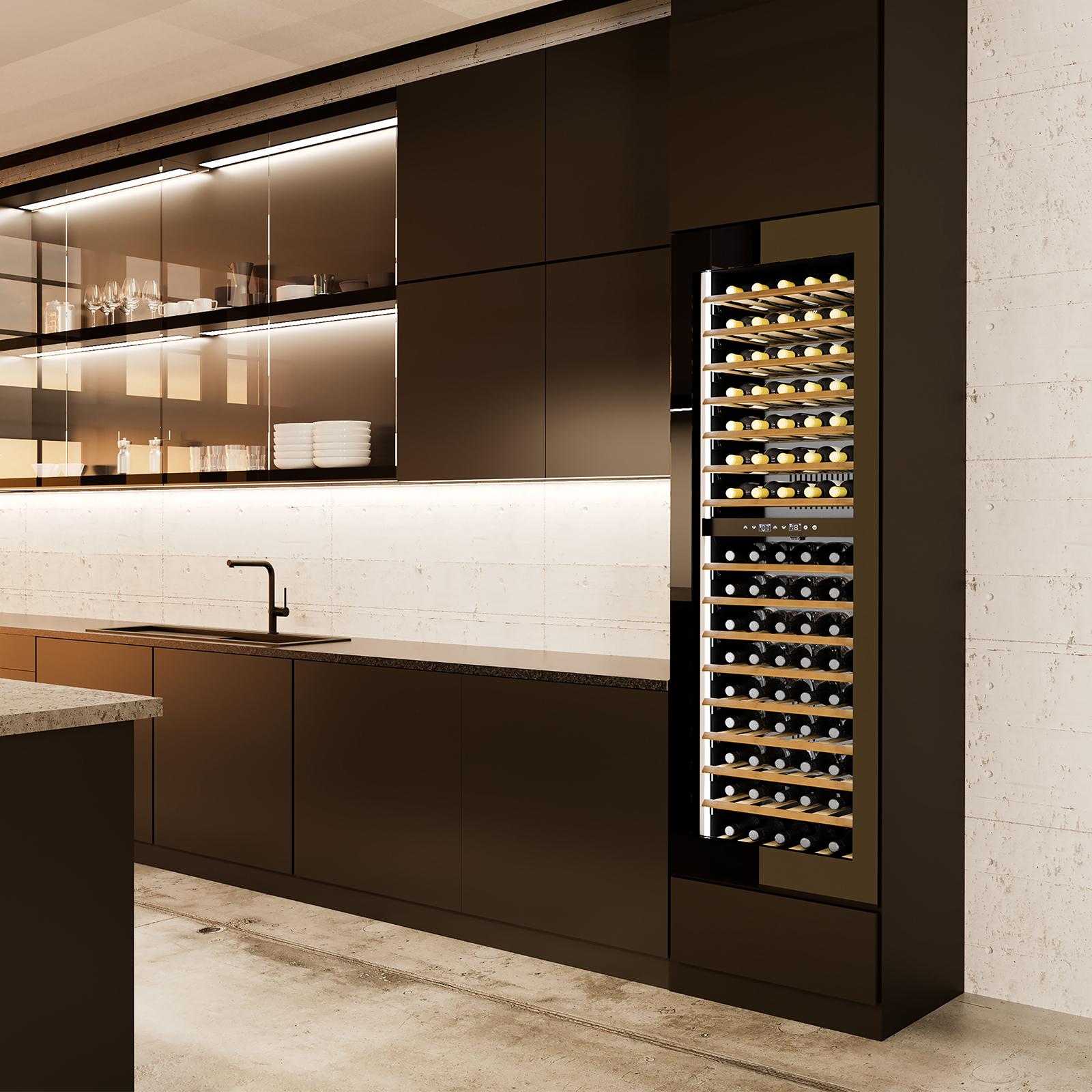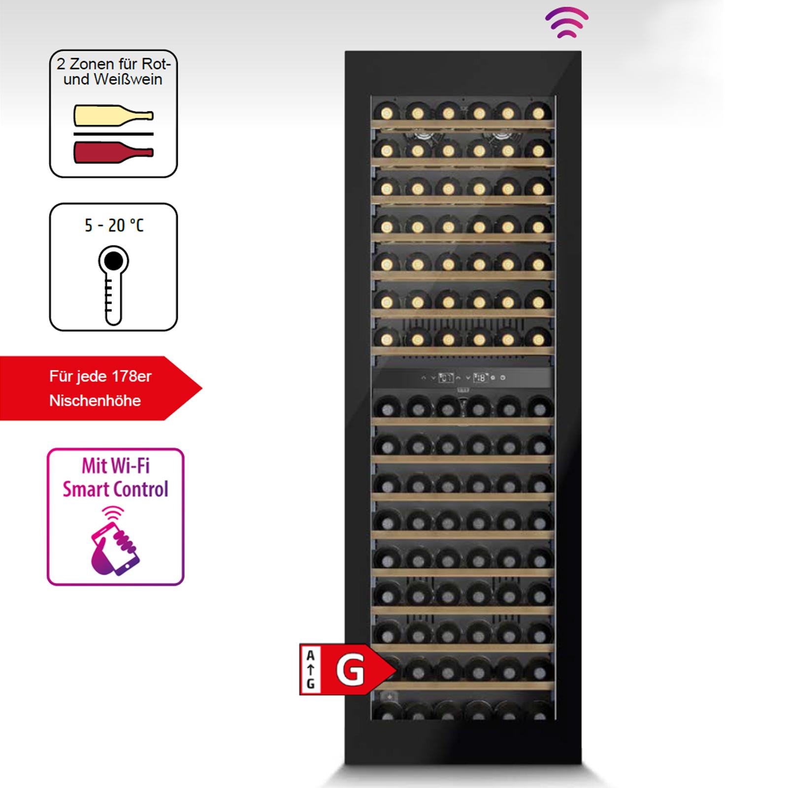 Dieser großformatige Design-Einbau-Weinkühlschrank bietet außergewöhnlich viel Stauraum für bis zu 96 Flaschen und ist damit die ideale Lösung für ambitionierte Sammler, Gastronomiekonzepte oder repräsentative Wohnbereiche. Die elegante, grifflose Push-to-open-Tür in Kombination mit hochwertigen Soft-Close-Scharnieren sorgt für eine komfortable und leise Bedienung, selbst bei häufiger Nutzung. Dank der integrierten WLAN-Funktion lässt sich der Weinkühlschrank bequem per App steuern und überwachen - unabhängig vom Standort. Zwei getrennte Temperaturzonen ermöglichen eine flexible Organisation verschiedener Weinsorten und sorgen dafür, dass sowohl Lager- als auch Servierweine optimal untergebracht werden können. Die zuschaltbaren Ambiente-LED-Leisten setzen die umfangreiche Sammlung wirkungsvoll in Szene und lassen sich individuell in der Helligkeit anpassen. Holzlagerböden auf kugelgelagerten Teleskopschienen sowie ein integriertes Metallgestell zur Präsentation ermöglichen ein komfortables Handling und eine hochwertige Darstellung der Flaschen. Trotz seiner großen Kapazität arbeitet das Gerät angenehm leise und eignet sich hervorragend für offene Wohn- und Präsentationsbereiche. Der Weintemperierer verbindet großzügige Lagerkapazität, modernes Design und hohen Bedienkomfort zu einer professionellen Weinlagerlösung.
