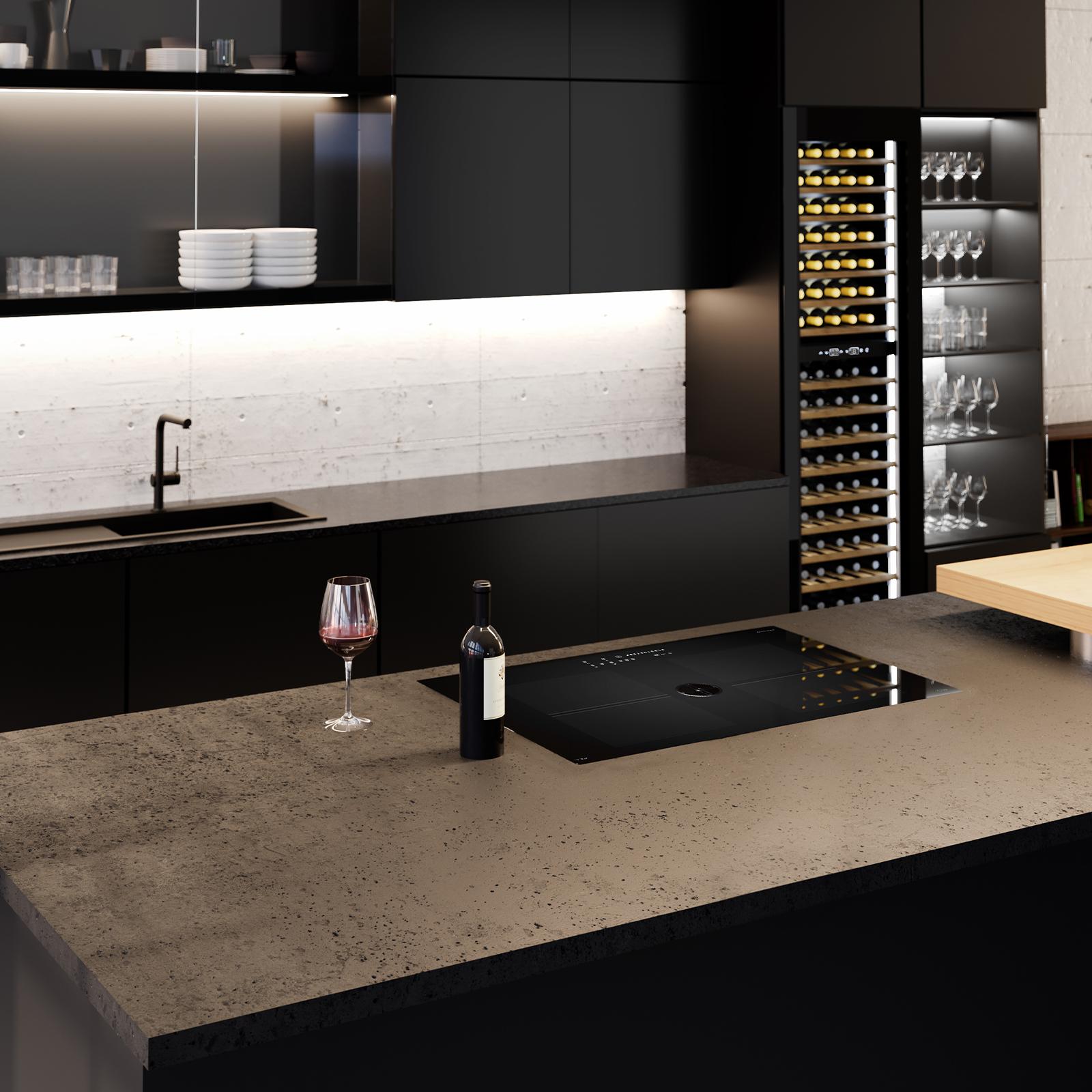 Die aktive Umluftkühlung verteilt die gekühlte Luft gleichmäßig über alle Ebenen und verhindert lokale Temperaturabweichungen innerhalb der einzelnen Lagerbereiche. Das dreifach isolierte Isolierglas mit integriertem UV-Filter reduziert externe Wärmeeinflüsse und schützt die gelagerten Flaschen zuverlässig vor schädlicher Lichteinstrahlung. Der integrierte Aktivkohlefilter sorgt für eine kontinuierliche Reinigung der Innenluft und verhindert die Übertragung von Fremdgerüchen auf die Weine.