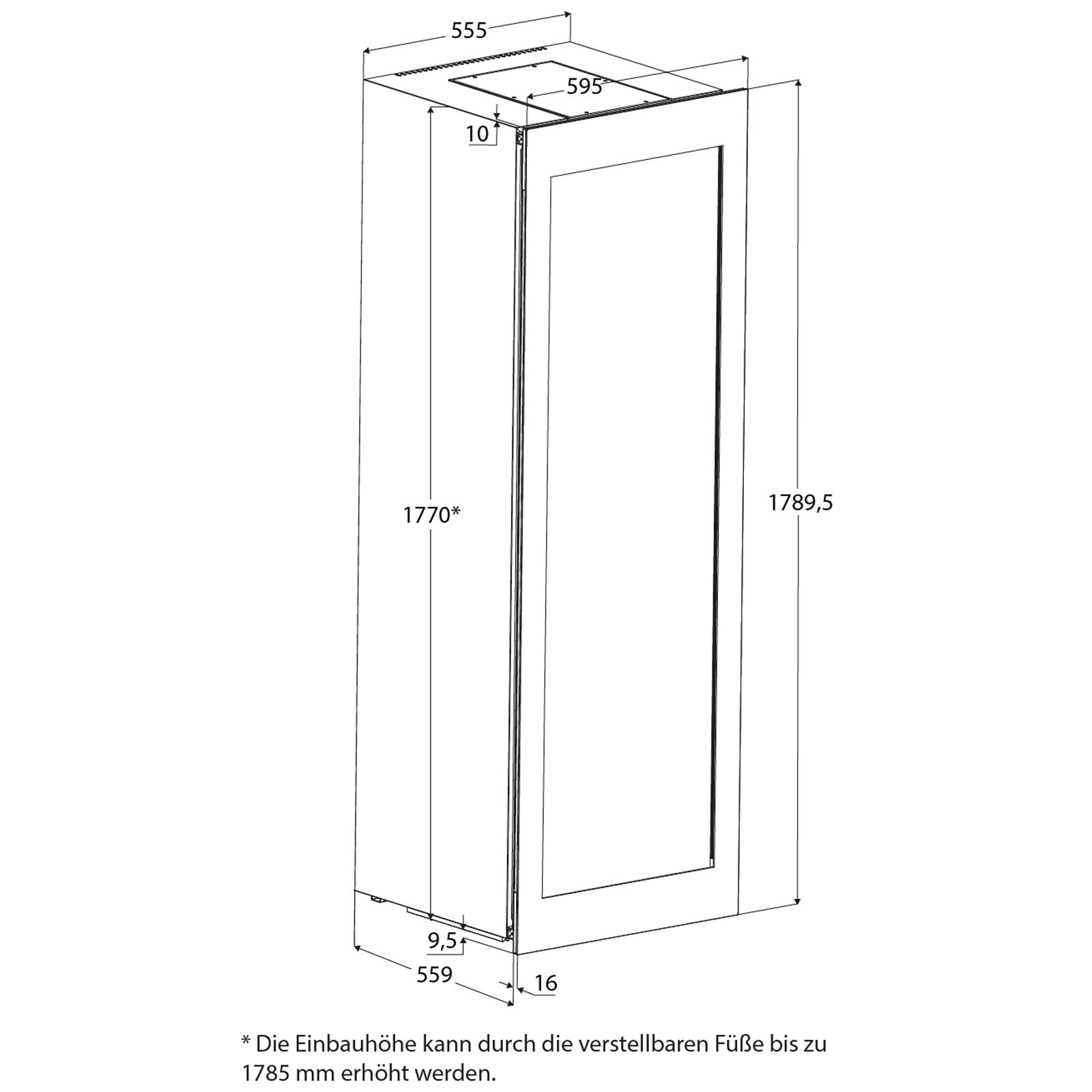 Mit seinen Gerätemaßen von ca. 595 x 1.789,5 x 575 mm (Breite x Höhe x Tiefe) ist das Gerät für den Einbau in eine 178er Nischenhöhe ausgelegt und lässt sich sicher und stabil in standardisierte Hochschranklösungen integrieren. Der wechselbare Türanschlag ermöglicht eine flexible Anpassung an unterschiedliche Raum- und Nutzungssituationen und unterstützt eine ergonomische Bedienung.