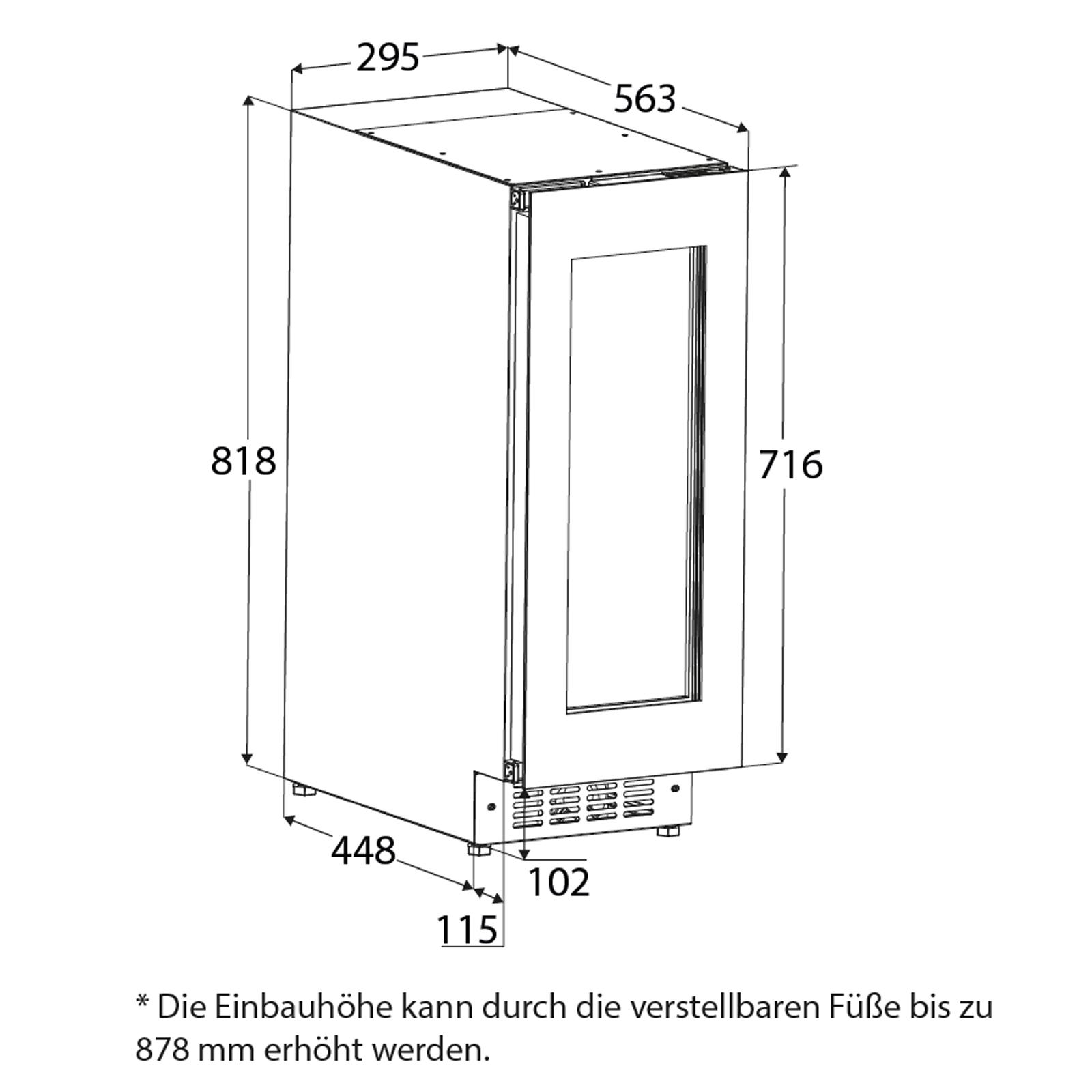 • Energieeffiziensklasse: G • Energieeffizienzbereich: A-G • Gerätebreite: 30 cm • Länge: 562 mm • Breite: 295 mm • Höhe: 818 mm • Tiefe: 562 mm • Farbe: schwarz • Material: Edelstahl/Glas • Material Oberfläche: Glasfront • Bedienung: Sensor-Touch Steuerung • Betrieb: Kompressor-Technik • Ausführung: für bis zu 18 Flaschen • Installationsart: Unterbau • Form: rechteckig • Leistung: 120 W • Anschluss: 220 - 240 / 50 / 1,2 V / Hz / A • Kabel und Anschluss: 1.5 m • Besonderheit: grifflos mit Push to Open Türsteuerung • Besonderheit I: für 30 cm Nischenbreite • Gewicht: 35.3 kg