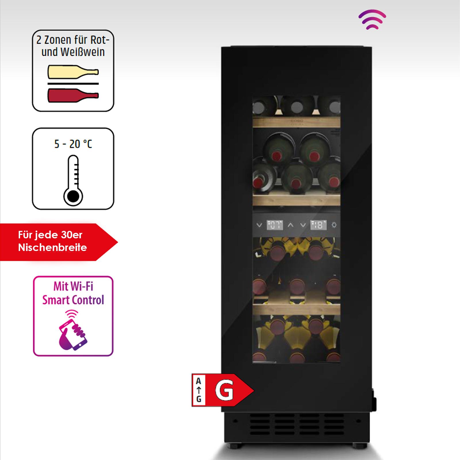 ✓ 80 cm hoher Unterbau-Weinkühlschrank mit 2 Temperaturzonen, 3 Holzböden sowie Push-To-Open Tür ✓ Design Weintemperierer mit Kompressor-Technik, Sensor-Touch Steuerung und Soft-Close Scharnieren ✓ Getränkekühlschrank mit 3-facher Glastür, für eine 30 cm Nische & zuschaltbaren Ambiente LED Leisten ✓ Unterbau-Kühlschrank mit Türalarm und Platz für bis zu 18 Flaschen Wein, Sekt, Bier & andere Getränke ✓ Griffloser Weinkühler mit wechselbarem Anschlag und Lüftung für einheitliche Temperatur-Verteilung