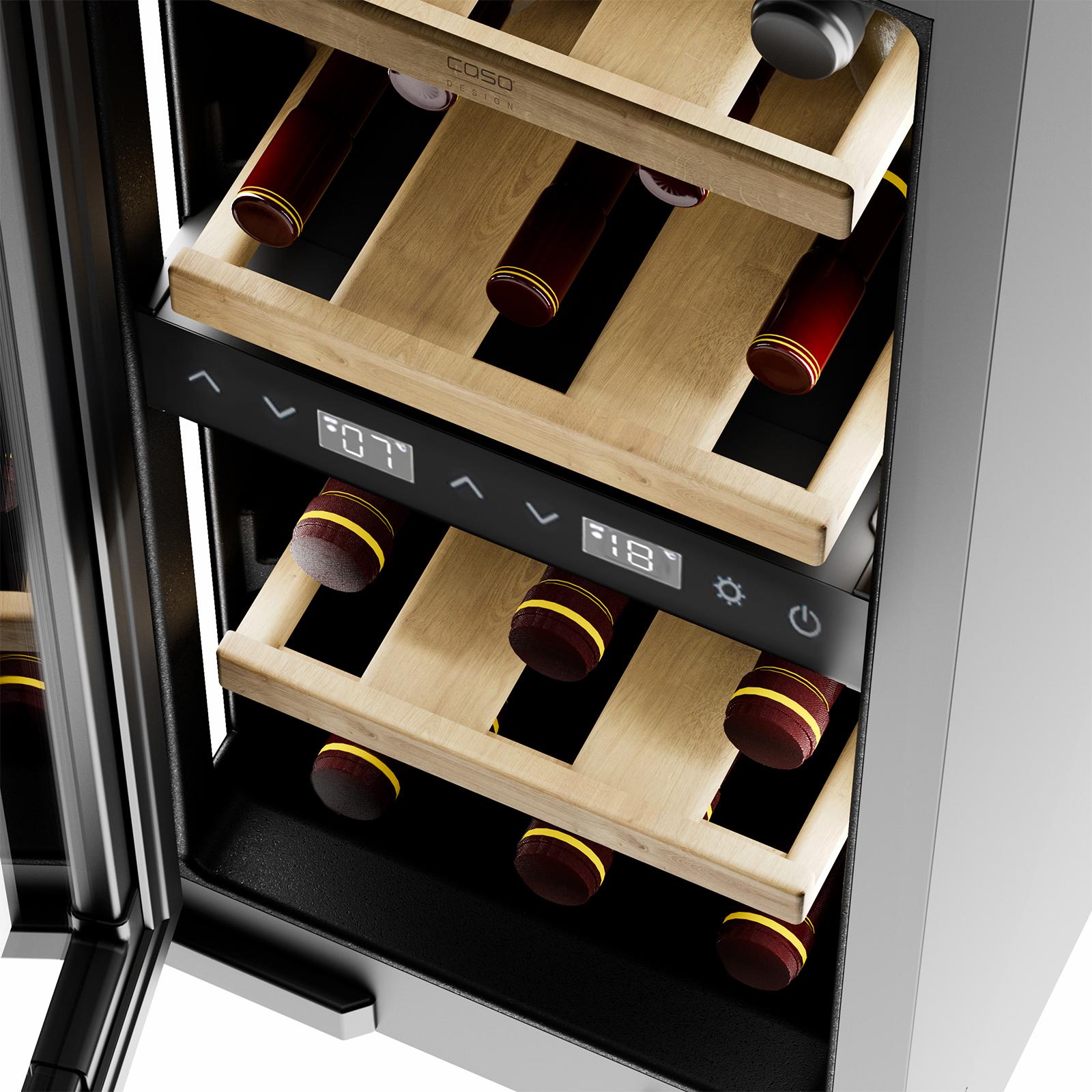 ☛ Innen-Ausstattung Zuschaltbare, weiße LED Ambiente-LED-Leisten Stufe 1 (25%), Stufe 2 (50%), Stufe 3 (75%) & Stufe 4 (100%) 2 Temperaturzonen elektronisch von 5-20 °C einstellbar (41-68 °F) 3 Holzlagerböden Zonen zum Lagern von bis zu 18 Flaschen (bis zu 76 mm Ø) Flaschenlänge bis 400 & 310 mm laufruhiger Kompressor für ruhige Weinlagerung aktive Lüftung für gleichmäßige Temperaturverteilung ☛ Leistungsdaten Geräuschemission 38 dB Ø Täglicher Energieverbrauch 0.266 kW.h/24h Tägl. Energieverbrauch (16°C Umgebungstemperatur) 0.108 kW.h/24h Tägl. Energieverbrauch (32°C Umgebungstemperatur) 0.424 kW.h/24h ☛ Geräte-Tür Push-To-Open Türöffnung Soft-Close Scharniere Türanschlag wechselbar 3-lagiges Isolierglas mit UV-Filter LED Temperaturanzeige jeder Kühlzone Türarlarm durch geöffnete Tür ☛ Abmessungen Einbaumaße 295 x 818 x 562 mm ☛ Besonderheiten vibrationsarm und leise für jede 30er Nischenbreite geeignet verstellbare Füße bis 878 mm Integriertes Wi-Fi Modul - mit der CASO-App von u?berall steuerbar inkl. Aktivkohlefilter für optimale Luftqualität