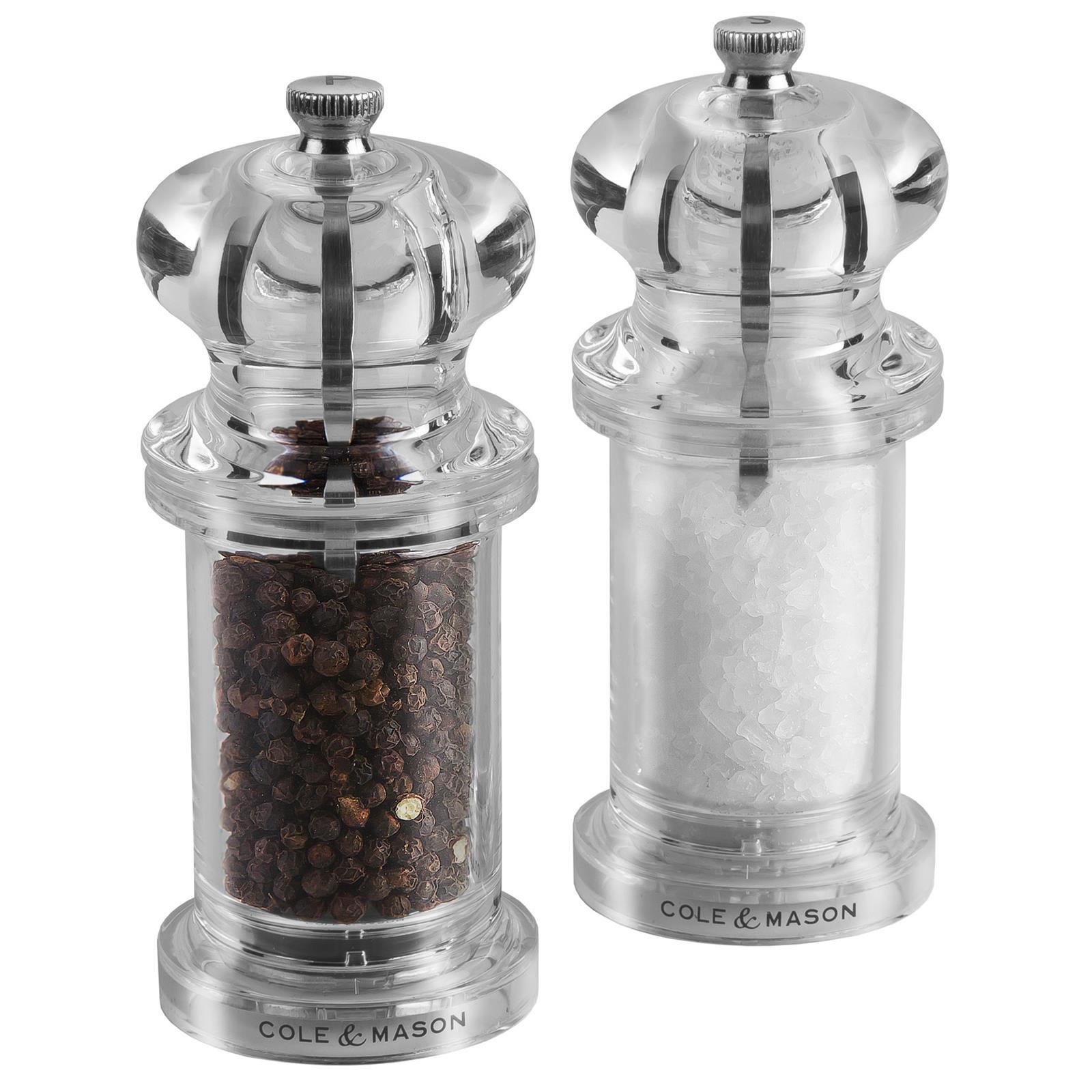 Cole & Mason steht für die Begeisterung, eine fantastische Auswahl an Gewürzutensilien mit passenden geschmacksverbessernden Produkten zu vereinen. Neue und spannende Zutaten verändern zusammen mit hochwertigen Küchenwerkzeugen & Zubehör Ihre Koch- und Esserlebnisse. Ein traditionelles und intuitiv gestaltetes Sortiment kombiniert mit hervorragender Funktionalität und Optik - seien Sie für jedes Würzen, ob in der Küche oder am Tisch, gewappnet. Egal ob eine manuelle oder elektronische Salz- oder Pfeffermühle, funktionale Shaker, Kräutermühlen- und Gewürzmühlen, Stößel & Mörser oder einen Öl- und Essigausgießer - hochwertige Materialen kombinieren sich mit Ihren Kochkünsten in der heimischen Küche. Dieses 14 cm hohe 2-teilige Salz- und Pfeffermühlen Set aus kristallklarem Acryl verleiht jedem Tisch einen harmonischen Look, das klassische Design kombiniert mit zuverlässiger Funktionalität macht die Mühlen zugleich zum alltäglichen Küchenaccessoires, welches wahrhaftig einem anspruchsvollen Koch würdig ist. Stellen Sie Ihren gewünschten Salz- oder Pfeffermahlgrad ein, indem Sie den Knopf am Deckel anziehen bzw. lösen. Dank des diamantgeschliffenen Keramik-Mahlwerks (für Salz) und des maschinengeschliffenen Karbonstahl-Mahlwerks (für Pfeffer), welches die Pfefferkörner schält statt zerdrückt, geben Sie z.B. Soßen, Steaks, Braten, Beilagen oder Pizzen einen wunschgemäßen und intensiveren Geschmack, die voreingestellten Mahlgrade ermöglichen ein Würzen von grobkörnig bis fein. Der vorteilhafte Acrylkörper des manuellen 2er Gewürzmühlen Sets für Pfeffer und Salz erlaubt Ihnen einen besseren Überblick des Füllstandes. Das passende kristallklare kleine Acryl Tablett eignet sich ideal zum Abstellen für dieses Gewürzmühlen Set, der Tisch bleibt krümelfrei und sauber.