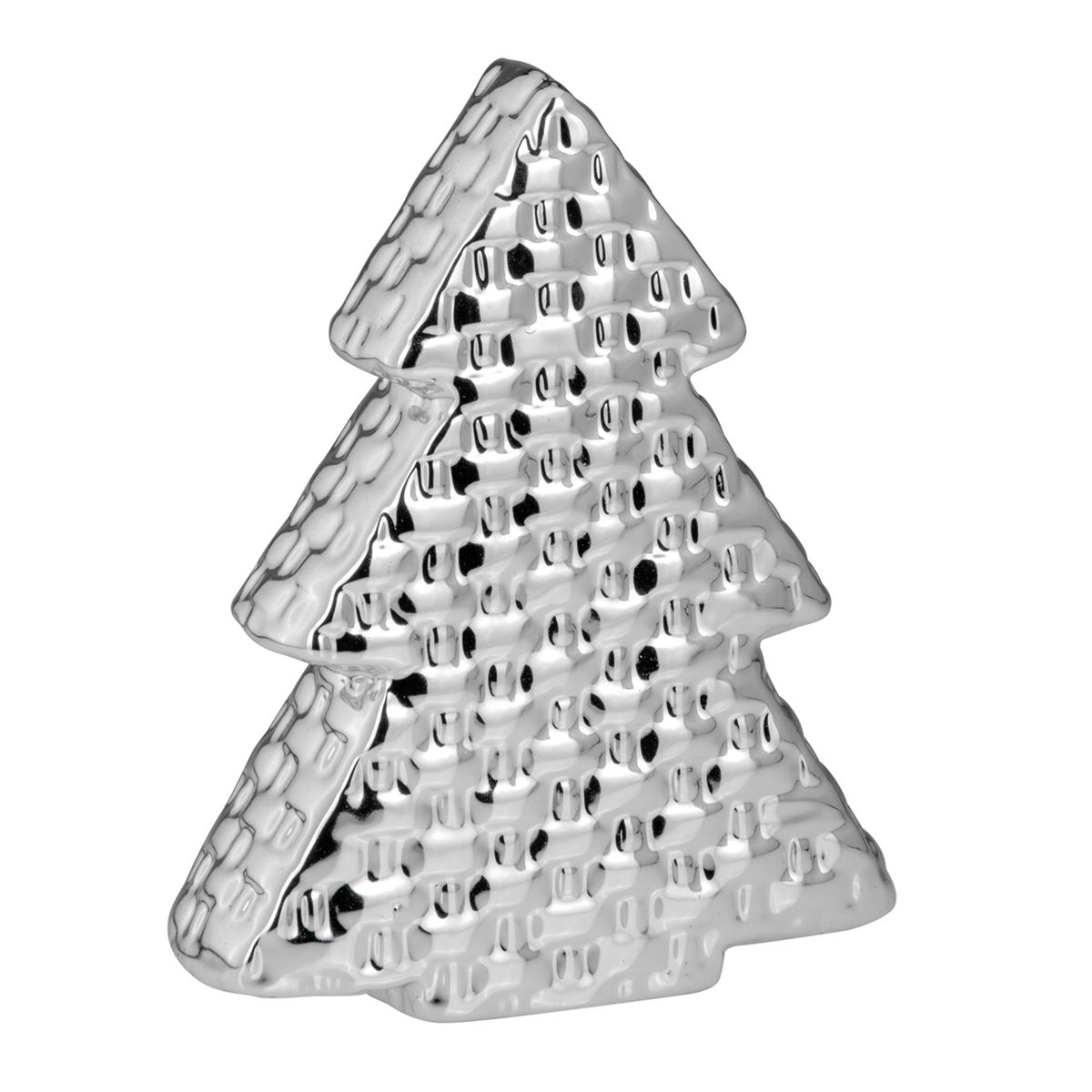 • Länge ca.: 13.5 cm • Breite ca.: 4.5 cm • Höhe ca.: 16.5 cm • Material: Porzellan • Beschichtung: galvanisiert • Oberfläche: glatt poliert, glänzend • Oberfläche Details: strukturiert, Weboptik • spülmaschinengeeignet: nein • Farbe: silber • Funktionalität: Zum Dekorieren von Tisch und Raum • Platzierungsart: Zum Aufstellen • Form: stilisiert • Dimension: groß • Motiv: Tannenbaum • Symbolik: Symbol für Erneuerung, Beständigkeit und festliche Ruhe • Look & Stil: Elegant, ausdrucksstark, modern, dekorativ, symbolträchtig • Umgebungsnutzung: Für Innenbereich und geschützten Außenbereich • Anlass: Für Raumgestaltung, Winterzeit, Saison, Empfang, Dekozweck • Nutzungsbereich: Fensterbank, Kommode, Empfang, Dekotisch, Ausstellung • Nutzungsmöglichkeit: Fläche dekorieren, Atmosphäre schaffen, Jahreszeit zeigen • Gewicht ca.: 0,333 Kg