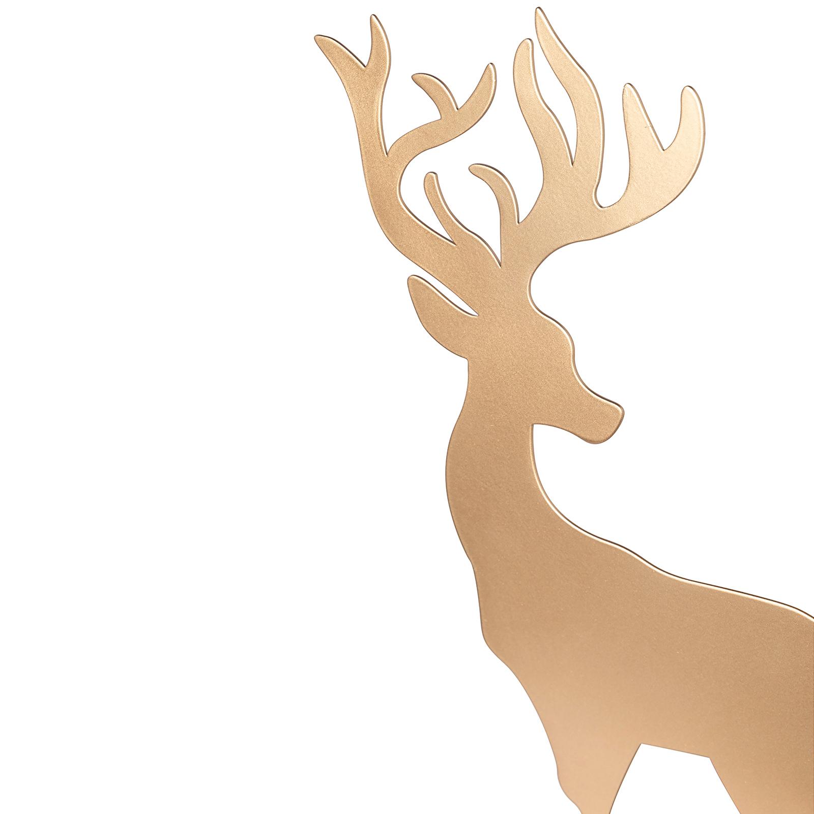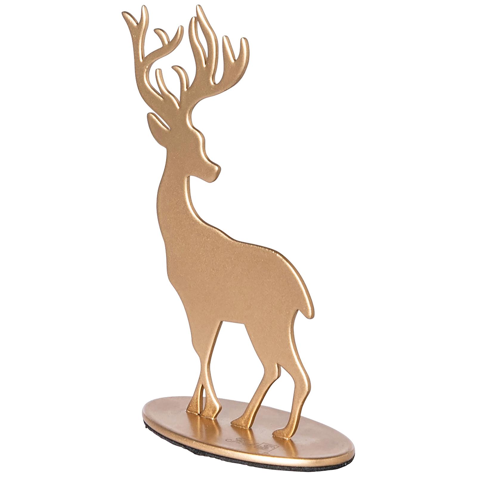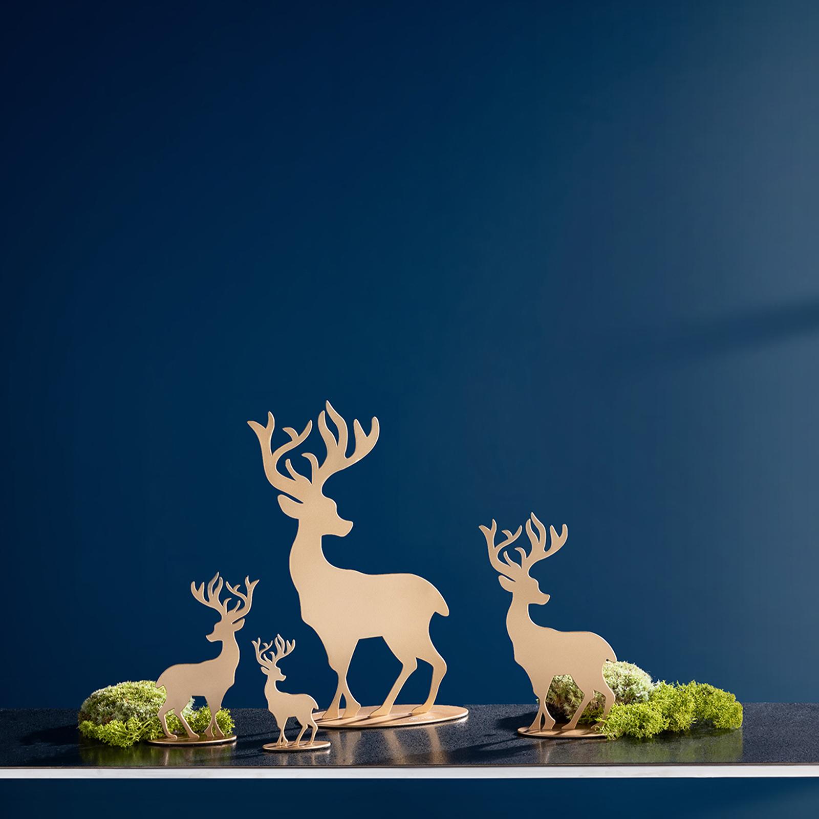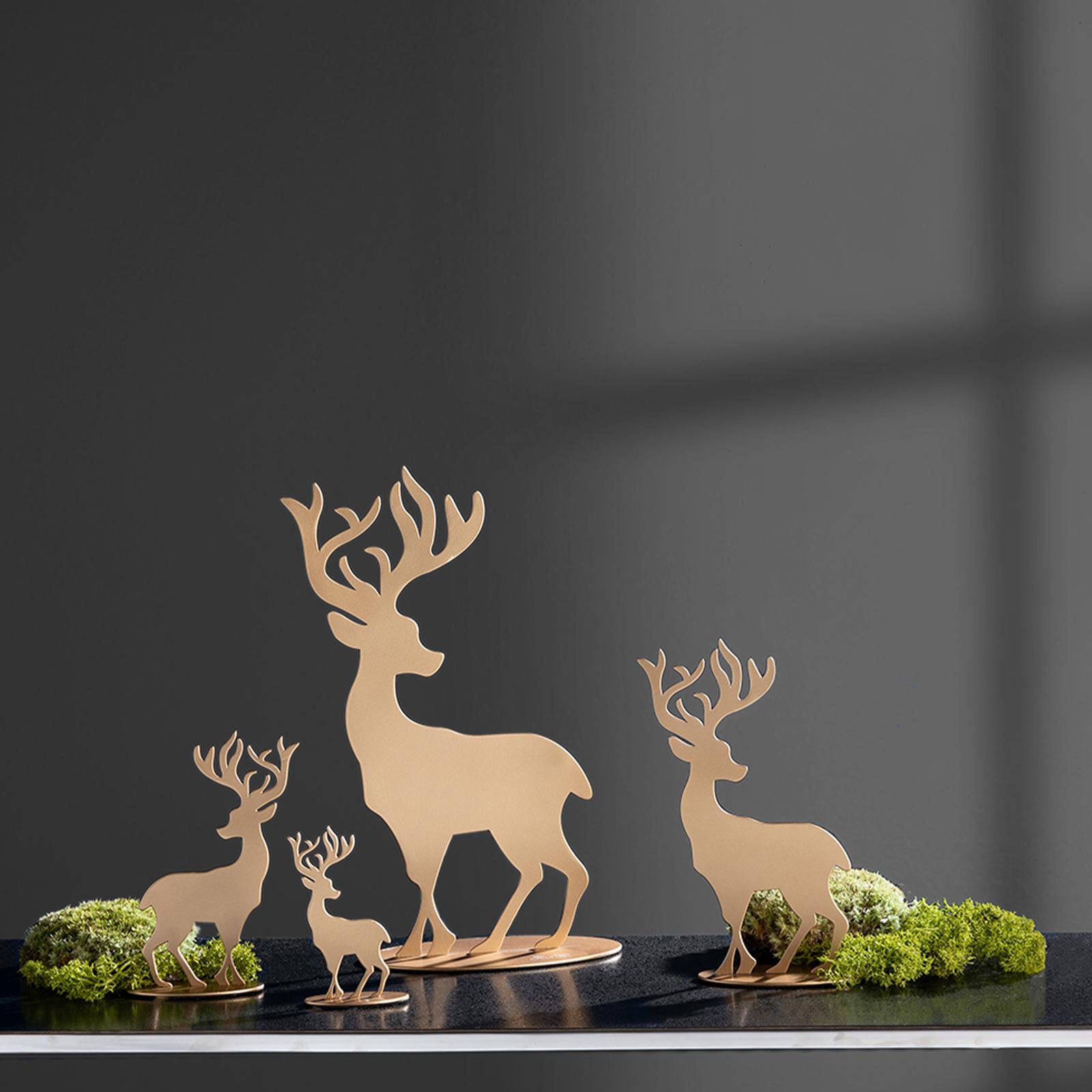 • Länge ca.: 3 cm • Breite ca.: 6 cm • Höhe ca.: 10 cm • Serie: Fink Living • Material: Eisen • Beschichtung: pulverbeschichtet • Oberfläche: matt • Oberfläche Details: glatt • spülmaschinengeeignet: nein • Farbe: goldfarben • Funktionalität: Zum Dekorieren von Tisch und Raum • Platzierungsart: Zum Aufstellen • Form: figürlich • Dimension: klein • Motiv: Hirsch • Umgebungsnutzung: Für Innenbereich • Anlass: Weihnachten, Nikolaus, Adventszeit • Nutzungsbereich: Sideboard, Fensterbank, Tischdekoration, Anrichte • Verwendungshinweis: nur zur Dekoration geeignet - kein Kinderspielzeug