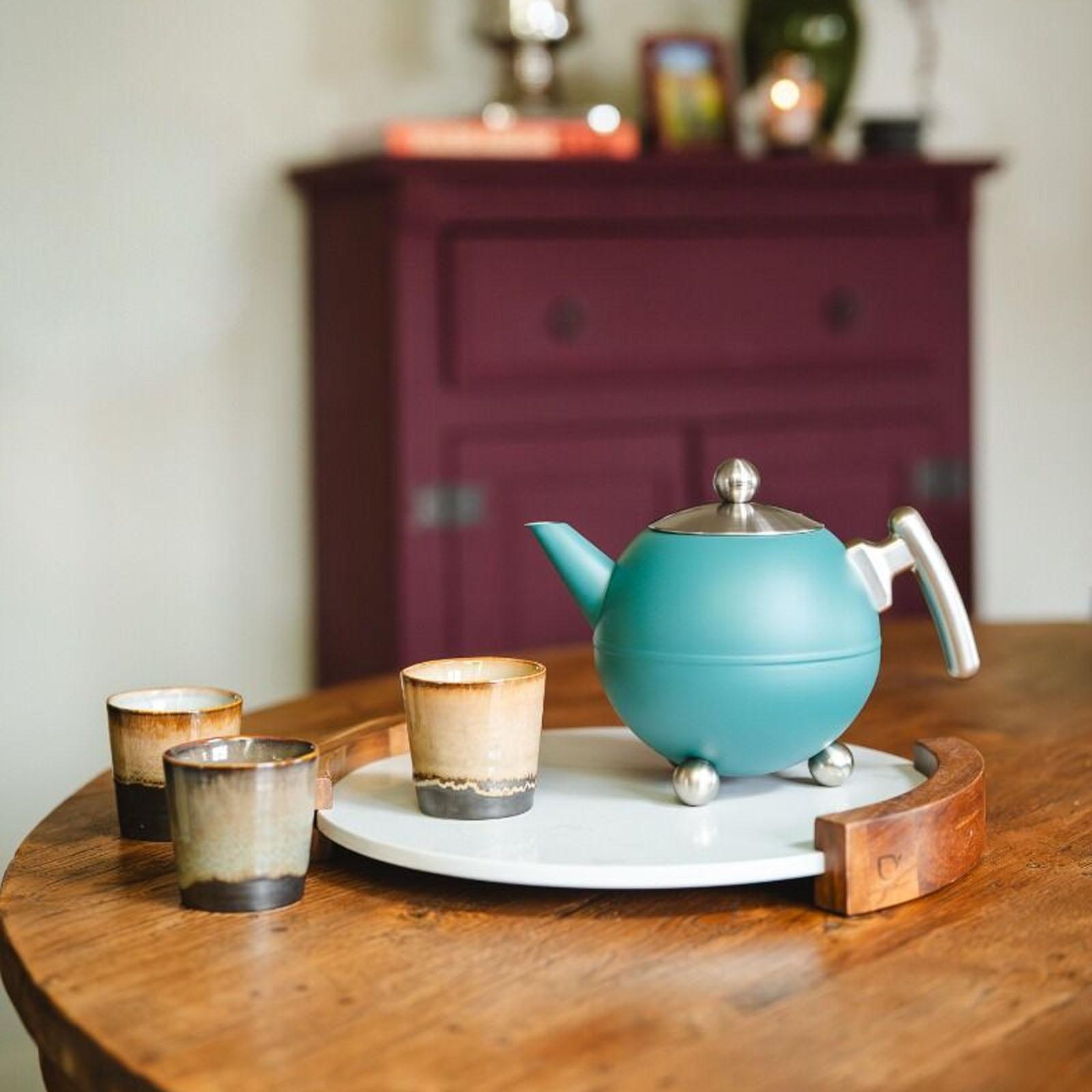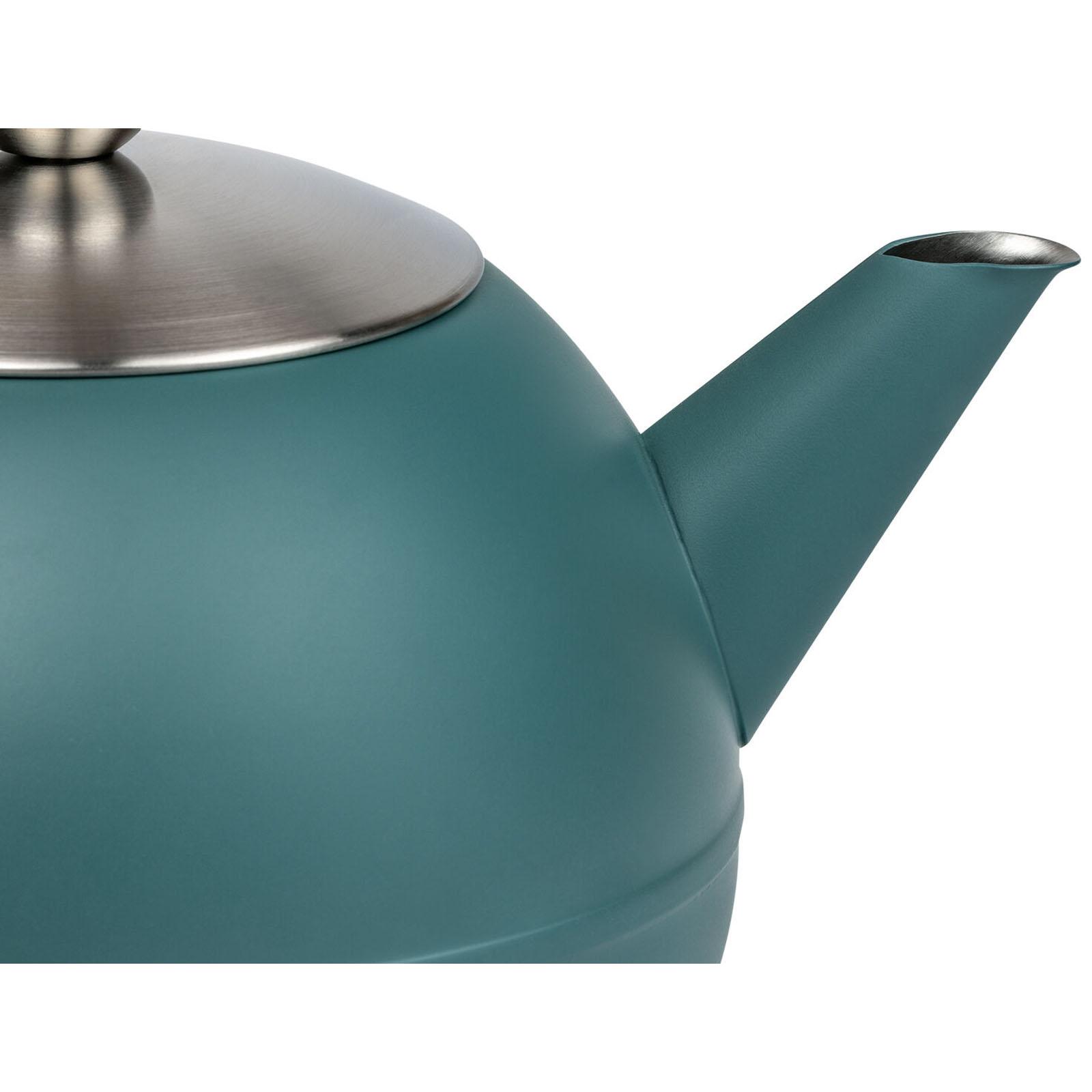 Diese doppelwandige, isolierende Teekanne aus Edelstahl hält Ihren Tee angenehm warm, sodass Sie Ihren Früchtetee, Kräutertee, Kamillentee oder aromatischen Ostfriesentee ganz entspannt genießen können - ganz ohne zusätzliches Zubehör. Diese grün-blaue Teekanne hat ein Volumen von 1200 ml und ist ideal für einen ausgiebigen Genuss, sei es beim Frühstück oder an einem gemütlichen Winterabend. Dank der drei kleinen Kugelfüße steht diese Kugelkanne stabil auf Ihrem Tisch und sorgt dafür, dass sie während der Nutzung nicht verrutscht - für ein sicheres und angenehmes Teetrinken.
