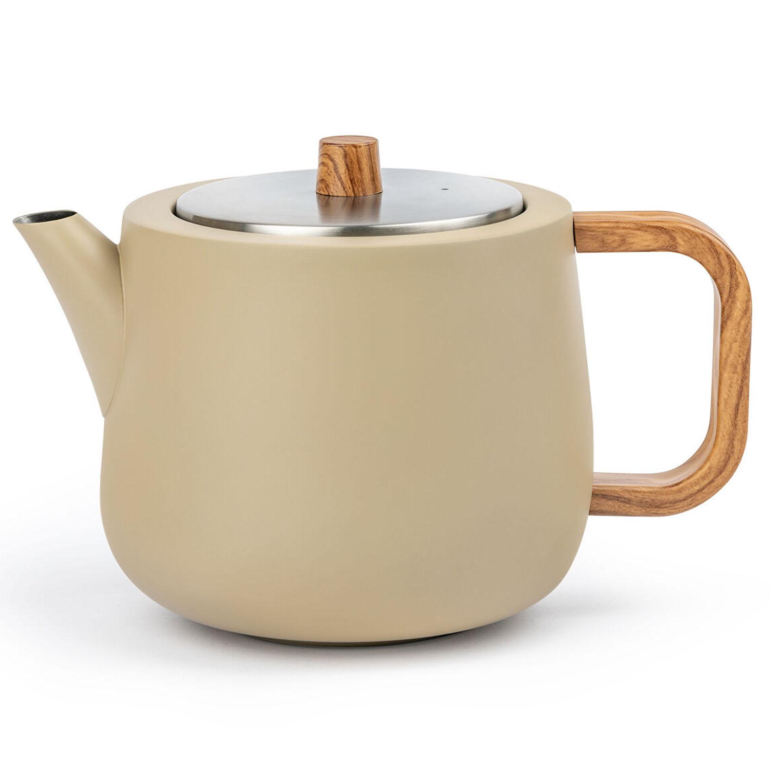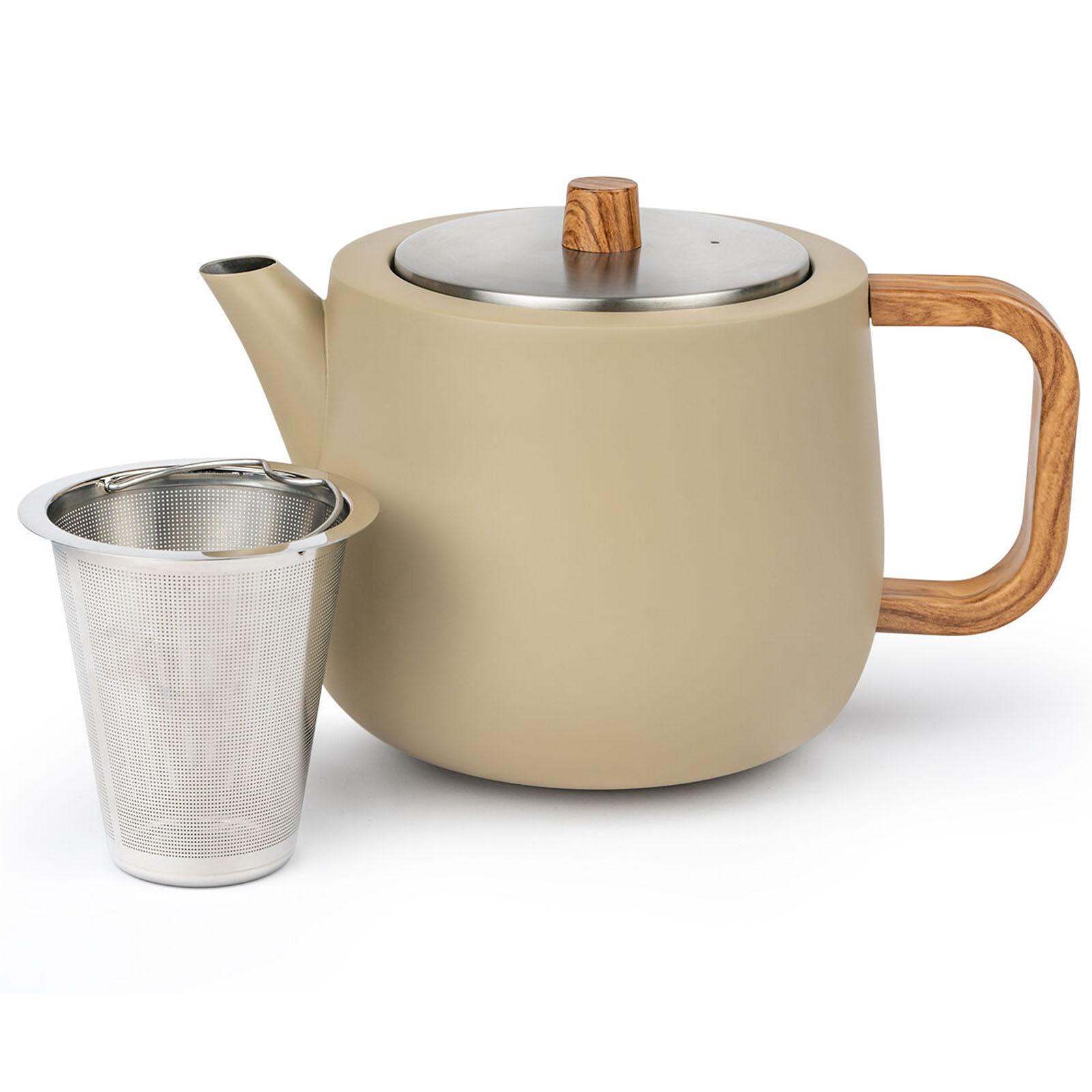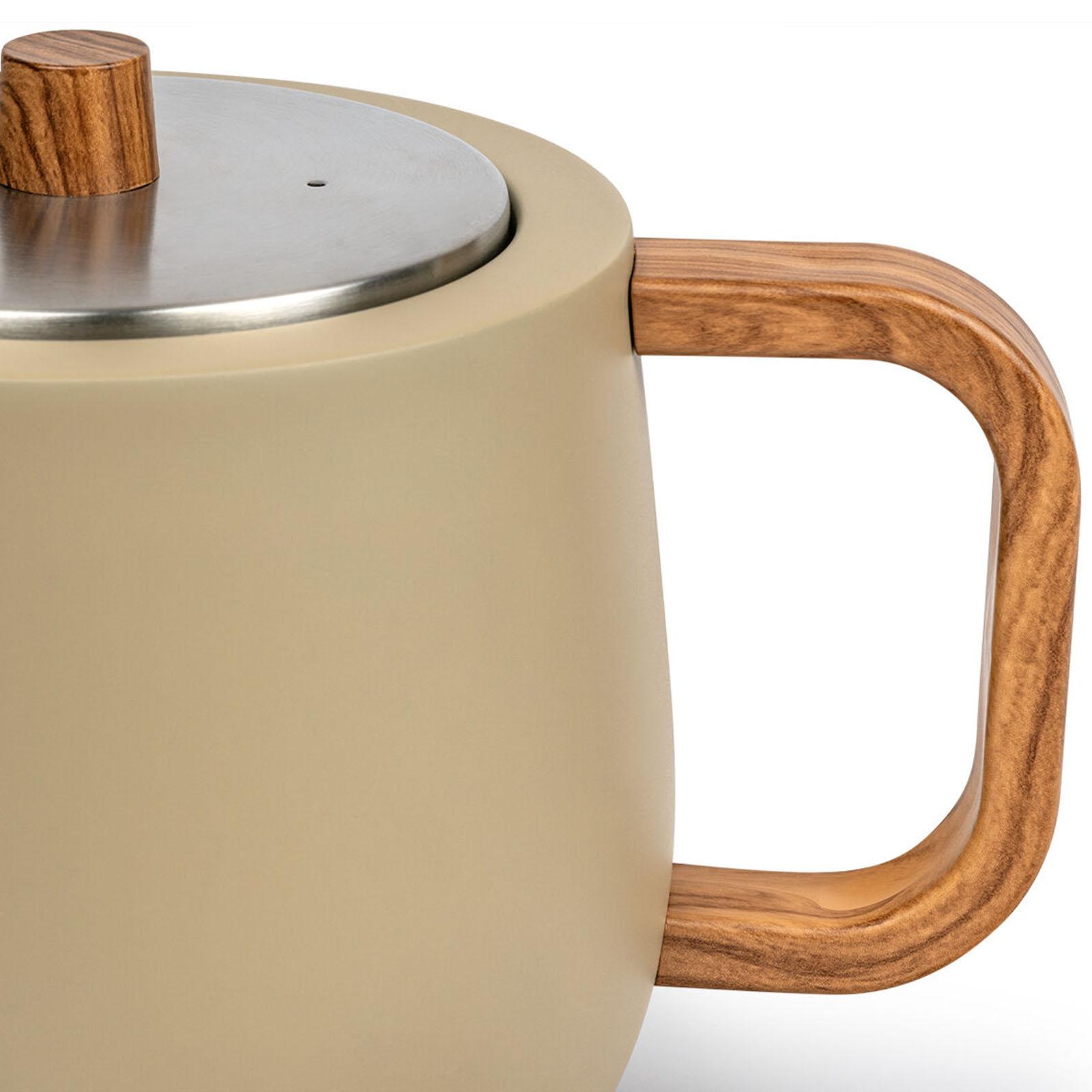 ✓ Diese Edelstahl Teekanne in Beige fasst 1.1 Liter ist doppelwandig und isoliert Ihren Tee optimal ✓ Aufgrund der isolierten Innenkonstruktion der Edelstahlkanne bewahrt der Tee länger die Wärme ✓ Die Ausgießtülle der rundlichen Teekanne gestattet Ihnen ein tropffreies Einschenken Ihres Tees ✓ Mit einem Fassungsvermögen von 1100 ml bietet diese Kanne außerdem einen Edelstahl-Teefilter ✓ Der helle Handgriff und der Deckelknopf in Holzoptik der matten Kanne bleiben einzig handwarm