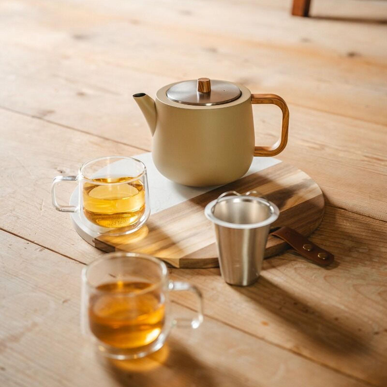 Tee steht für Ruhe, Achtsamkeit und bewussten Genuss - genau diesen Moment begleitet die Teekanne aus Edelstahl in Camel-Farbton mit Einsatz-Teefilter auf besonders stilvolle Weise. Der gedeckte Beige-Ton wirkt harmonisch und zeitlos und fügt sich mühelos in moderne wie natürliche Wohnumgebungen ein. Der Griff in Holzoptik sorgt für einen warmen Kontrast und liegt angenehm in der Hand, sodass sich die Kanne komfortabel ausgießen lässt. Die Kanne selbst verfügt über eine doppelte Isolierwand, die den Tee bis zu einer Stunde lang heiß hält und dabei den vollen Geschmack bewahrt. Um die Isolierfunktion optimal zu nutzen, empfehlen wir, die Kanne mindestens zu 90 % zu füllen. So bleibt der Tee nicht nur heiß, sondern auch aromatisch und frisch, ideal für ausgedehnte Teepausen, alleine oder in Gesellschaft. Im Inneren befindet sich ein passgenauer Einsatz-Teefilter aus Edelstahl, der lose Teeblätter optimal umschließt und ihnen ausreichend Raum zur Entfaltung gibt. So entwickelt sich das Aroma gleichmäßig, während der Tee klar und ohne Rückstände in die Tasse fließt. Die doppelwandige Konstruktion hält den Inhalt zuverlässig warm und unterstützt ein langanhaltendes Geschmackserlebnis - besonders dann, wenn die Kanne nahezu vollständig befüllt wird. Mit einem Fassungsvermögen von 1,1 Litern eignet sich diese Edelstahl-Teekanne ideal für entspannte Teepausen allein oder gesellige Runden mit Familie und Freunden. Der präzise Ausguss ermöglicht ein sauberes Einschenken, während die klare Formensprache die Kanne zu einem stilvollen Blickfang auf Tisch oder Anrichte macht. Ob im Alltag, bei besonderen Anlässen oder als geschmackvolles Geschenk - diese Teekanne verbindet Ästhetik und Funktion zu einem stimmigen Gesamtbild und macht jede Teestunde zu etwas Besonderem.
