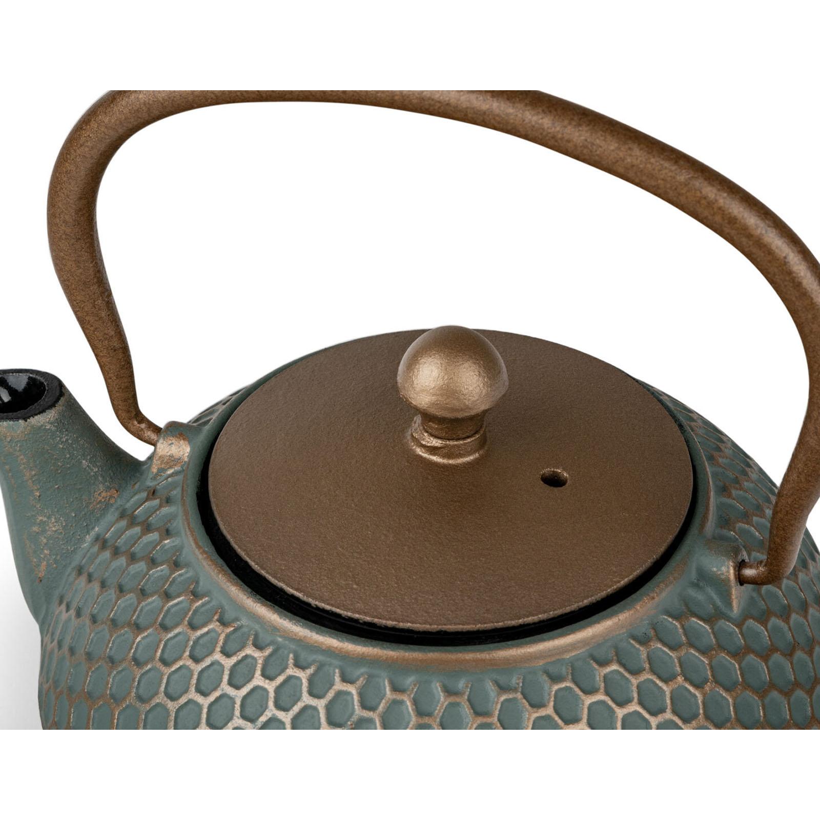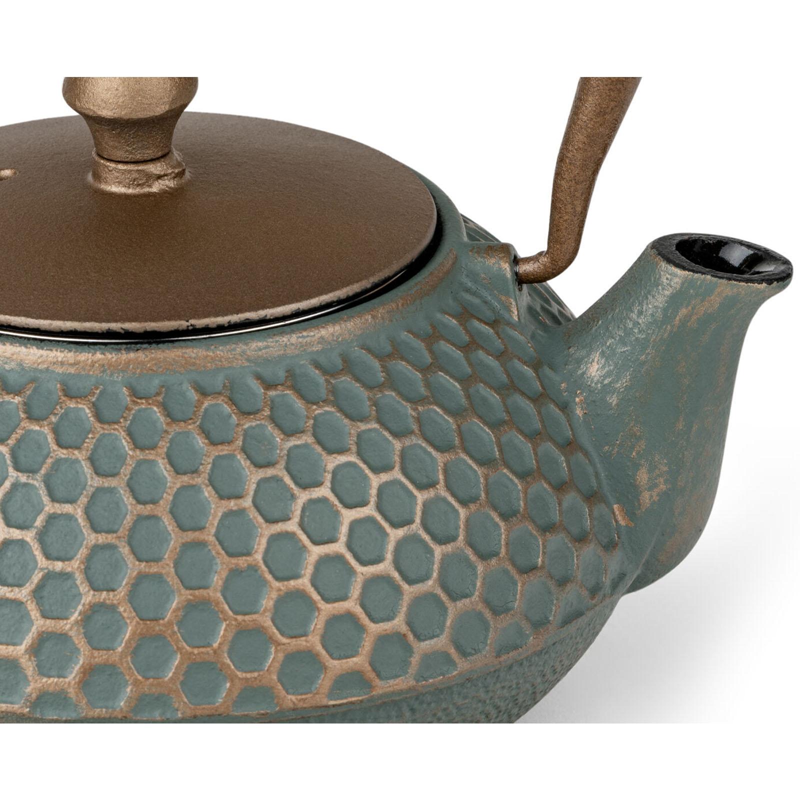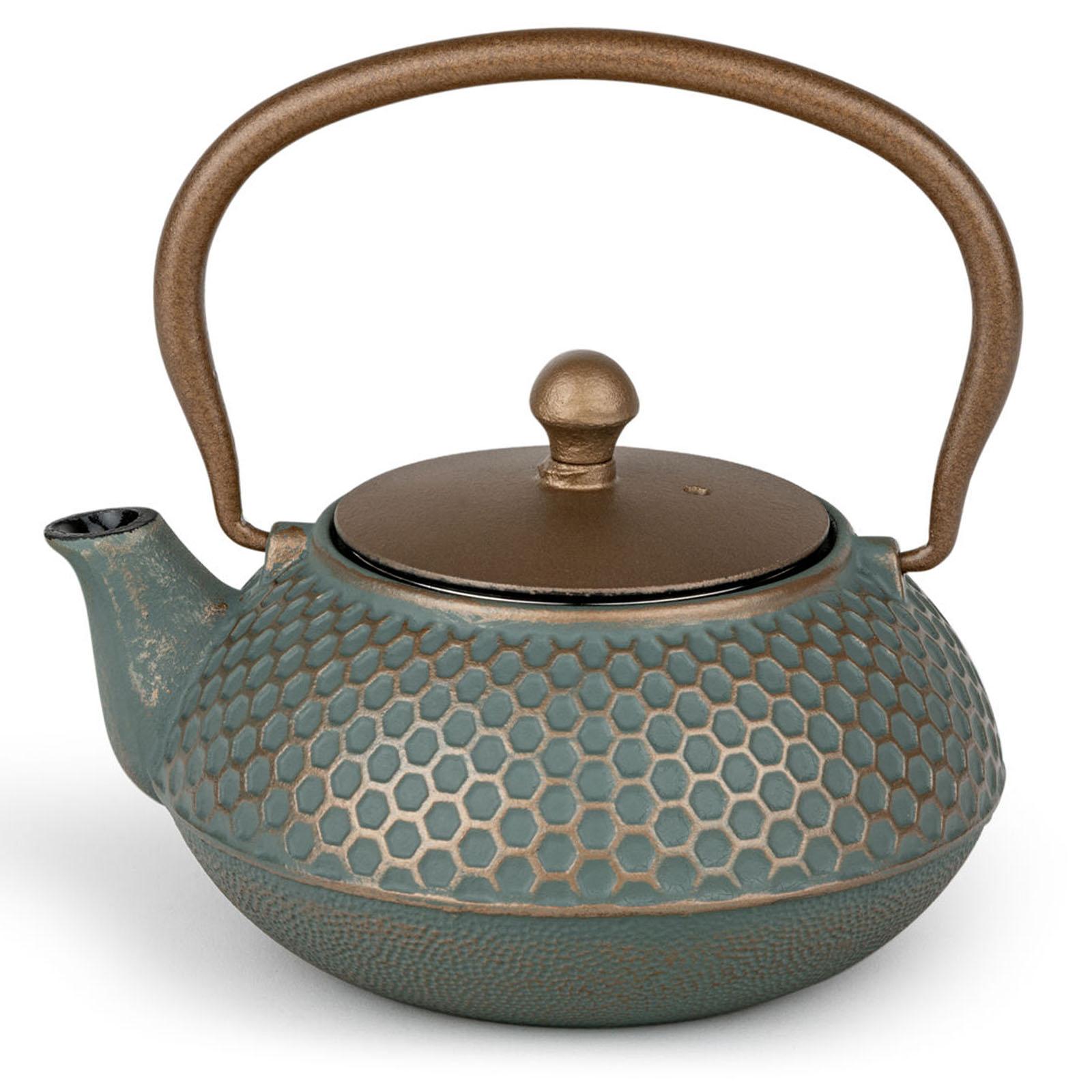 Diese kompakte Gusskanne mit 0.7 Liter Fassungsvermögen ist ideal für alle, die Tee bewusst genießen und kleinere Mengen stilvoll zubereiten möchten. Die warme blaue Farbgebung mit goldfarbenem Wabenmuster verleiht der Kanne eine ruhige, harmonische Ausstrahlung und macht sie zu einem besonderen Blickfang auf Tisch oder Teetablett. Das massive Gusseisen speichert die Wärme zuverlässig und sorgt dafür, dass der Tee länger heiß bleibt und sein Aroma gleichmäßig entfalten kann. Ein passendes Edelstahl-Teesieb ist bereits enthalten.