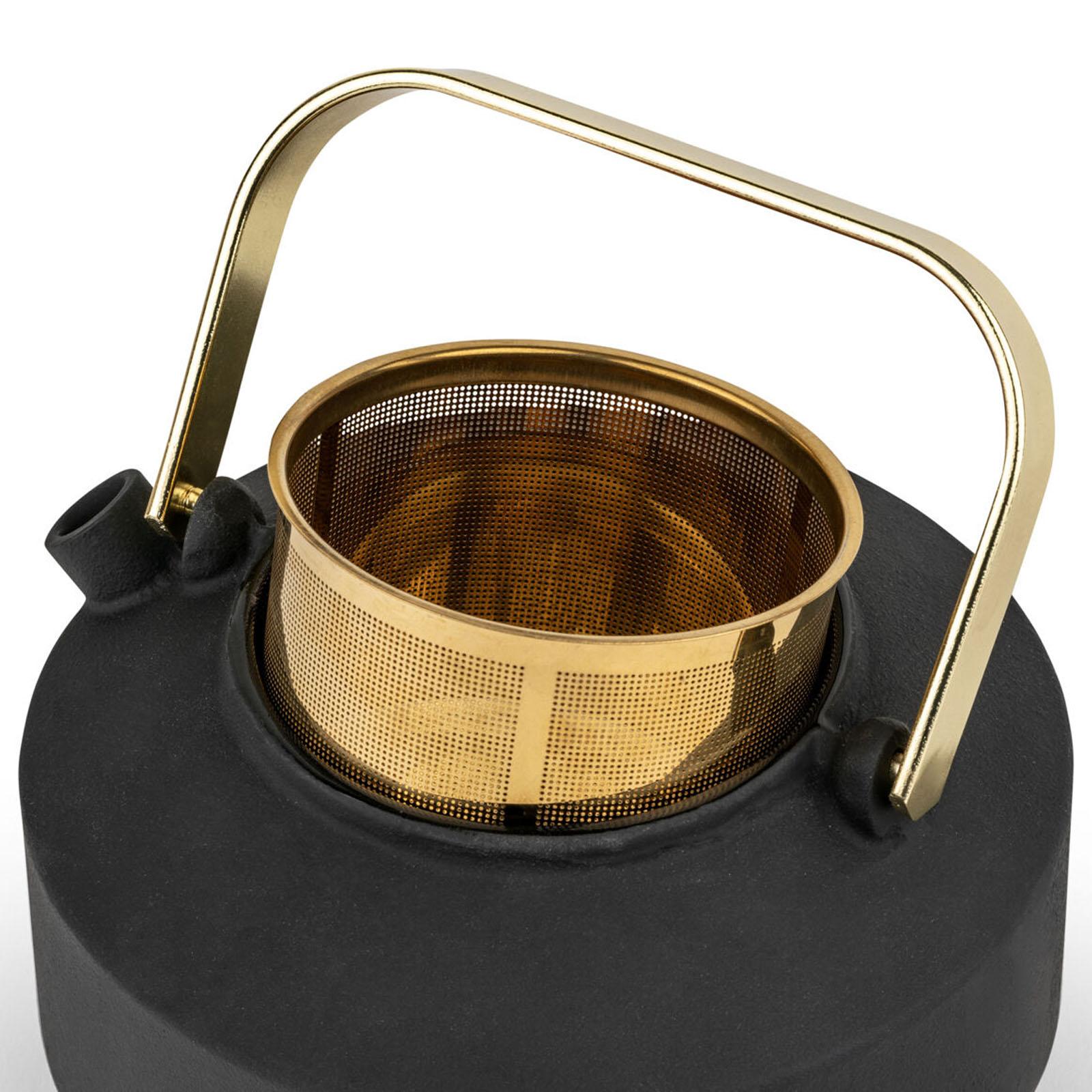 Dank der gläsernen Emaille-Innenbeschichtung bleibt das Gusseisen geschmacksneutral, wodurch sich diese Teekanne besonders gut für aromatisierte Früchtetees oder Gewürztees wie Chai eignet. Die matte schwarze Oberfläche in Kombination mit den goldenen Akzenten verleiht der Kanne eine ruhige Eleganz und macht sie zugleich zu einer stilvollen Geschenkidee - ob zu Weihnachten, zum Geburtstag oder zu anderen besonderen Anlässen.