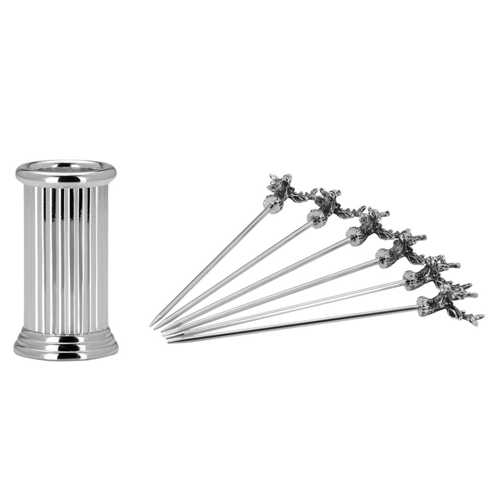 ✓ Silberne Servierspieße mit Hirschmotiven zum Anrichten von Käse, Obst, Oliven & Snacks auf Buffets ✓ Versilberte Metallspieße mit dezentem Glanz zur stilvollen Ergänzung auf dem Tisch und in der Küche ✓ Set aus sechs Partyspießen mit passendem Behälter zur ordentlichen Aufbewahrung & Präsentation ✓ Geeignet für Käseplatten, Antipasti, Fingerfood sowie private Feiern, Events und in geselligen Runden ✓ Dekoratives Tischaccessoire und passende Geschenkidee für Gastgeber, Feinschmecker & Sammler