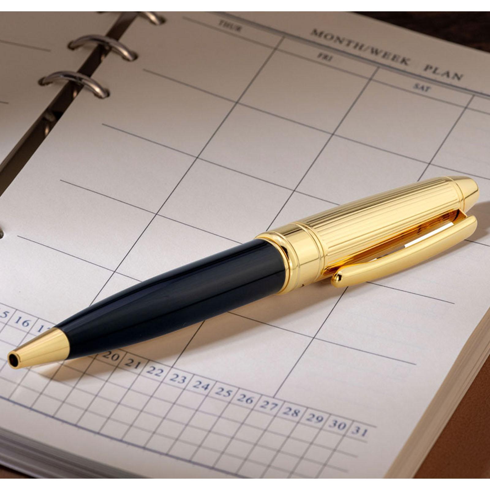 ✓ Schwarzer Kugelschreiber mit goldfarbenen Akzenten und Fadendekor für Notizen und Unterschriften ✓ Schreibstift mit Drehmechanismus für einfaches Ein- & Ausfahren der Mine im täglichen Büroeinsatz ✓ Länge von ca. 14,5 cm für ein komfortables Schreiben bei z.B. Meetings, Terminen & im Arbeitsalltag ✓ Elegant, schwarzer Kuli, geeignet für den Schreibtisch, im Empfangsbereich und in Konferenzräumen ✓ Dekoratives Büroaccessoire und als Geschenkidee für Jubiläen, Einladungen und berufliche Anlässe