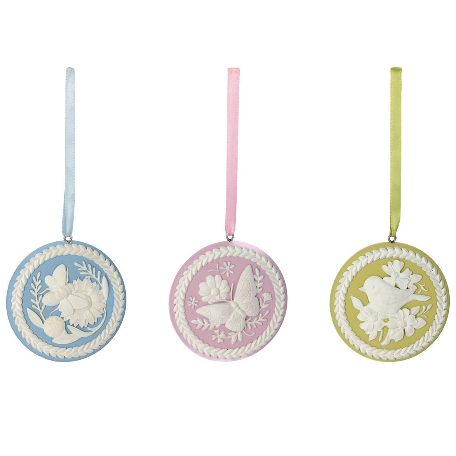 • Länge ca.: 7.5 cm • Breite ca.: 8.2 cm • Höhe ca.: 1.0 cm • Material: Kunststein • Oberfläche Details: verziert • spülmaschinengeeignet: nein • Farbe: blau, rosa, gelb • Eigenschaft: Polyresin • Ausstattung: mit Band zum Aufhängen • Funktionalität: Zum Dekorieren und Verzieren • Platzierungsart: zum Aufhängen • Form: rund • Dimension: klein • Motiv: Wedgwood Style • Motiv-Design: Vögel & Insekten • Setumfang: 3-teilig