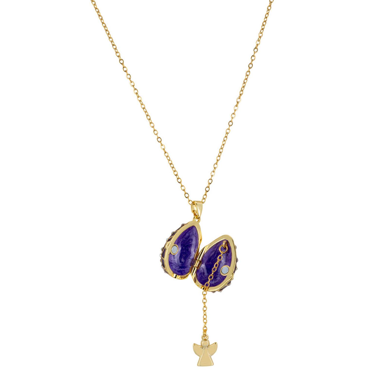 ✓ Aufklappbarer Medaillon Anhänger in Ei-Form in Lila mit einem Schutzengel innen und Strasssteinen ✓ Die vergoldete Oberfläche verleiht dieser Halskette eine elegante sowie harmonische Schmuckoptik ✓ Diese 45 cm Kette lässt sich in der Länge verstellen und eignet sich für Alltag oder besondere Anlässe ✓ Die Scharniere & fein ausgearbeitete Details sorgen für angenehmes Öffnen & Tragen des Anhängers ✓ Ideal als Geschenkidee für Geburtstage & als persönliche Aufmerksamkeit für besondere Menschen