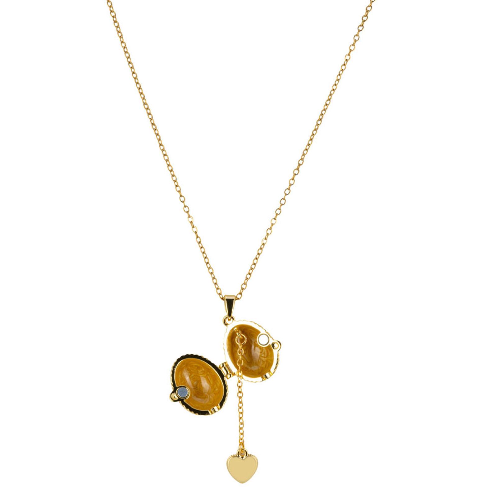 • Länge ca.: 45.0 cm • Detailmaß ca.: Länge mit Ei 50 cm / Ei-Höhe 1.6 cm / Ei-Ø 1.3 cm • Material: Metall • Material 1: Zinkdruckguss • Beschichtung: vergoldet • Oberfläche Details: verziert • spülmaschinengeeignet: nein • Farbe: gelb • Ausstattung: mit Strasssteinen • Ausstattung 1: Anhänger zum Öffnen • Ausstattung 2: Ei-Anhänger mit Herz innen • Funktionalität: Zum Tragen als Schmuckstück am Hals • Platzierungsart: Zum Anlegen am Hals • Dimension: klein • Motiv: Herz