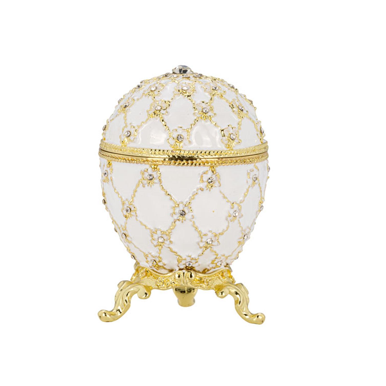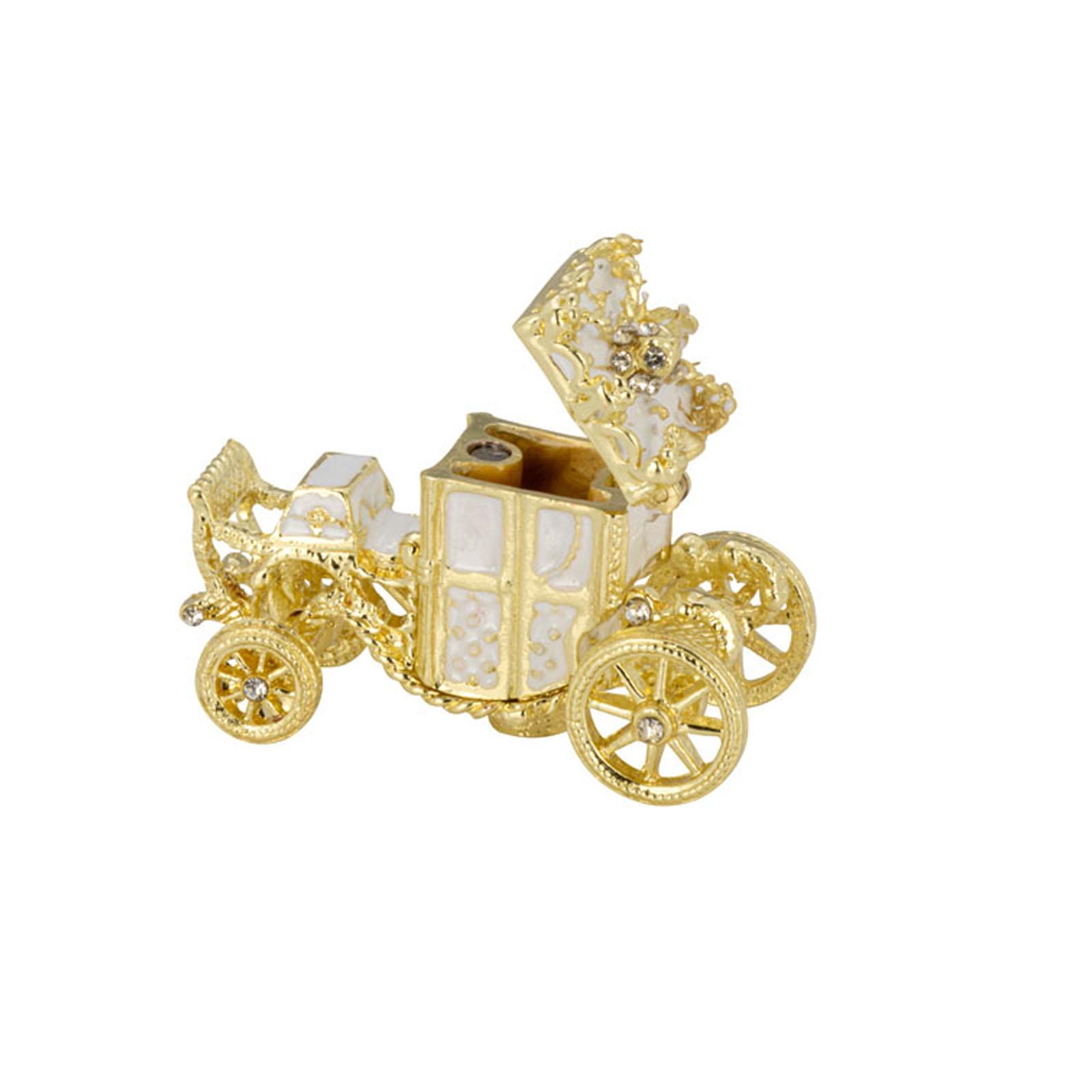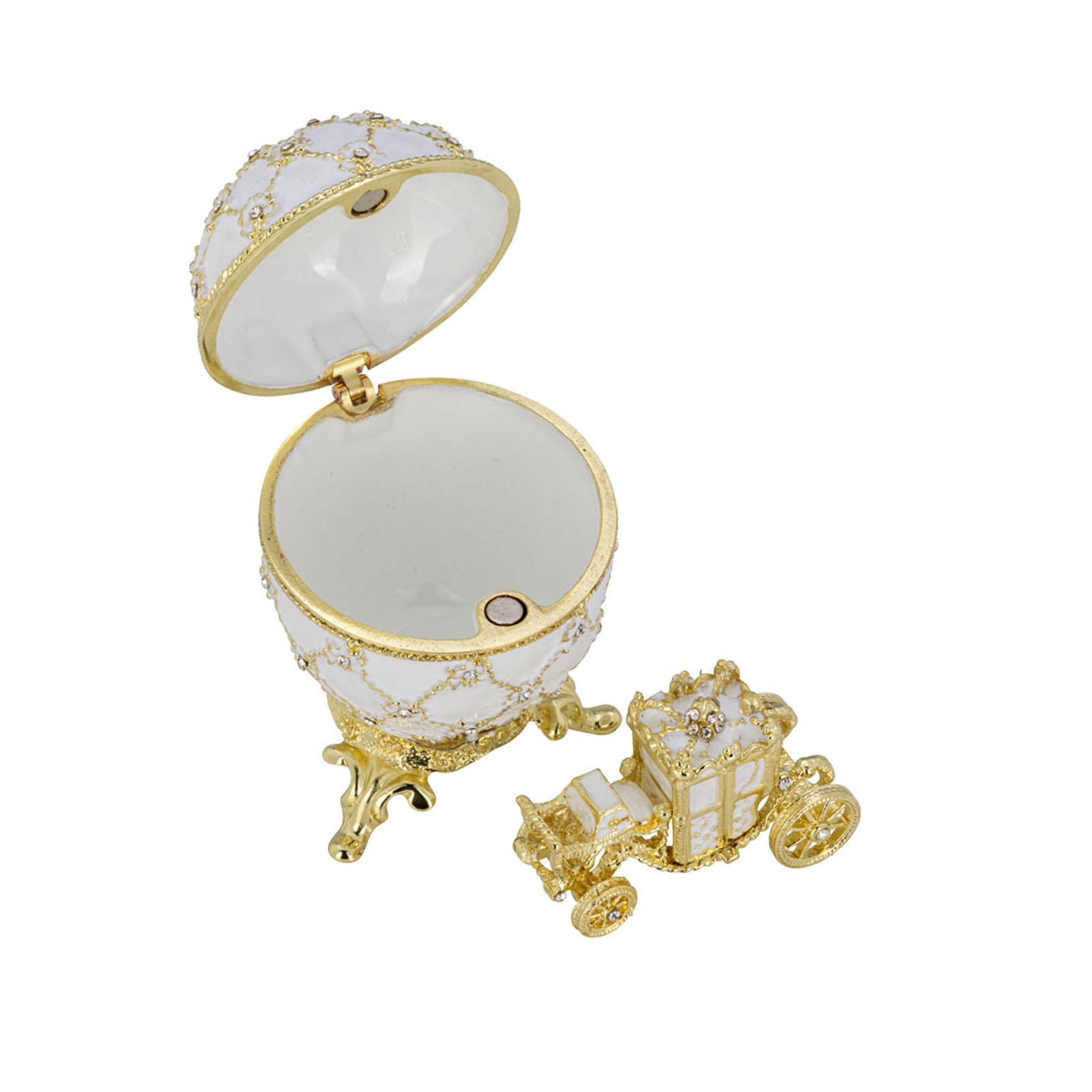 • Länge ca.: 7.0 cm • Höhe ca.: 7.0 cm • Durchmesser ca.: 4.8 cm • Detailmaß ca.: Höhe-Ei: 6.0 cm / Ø 4.8 cm • Material: Zinkdruckguss • Beschichtung: Emaille-Lack • Veredelung: vergoldet • Oberfläche Details: verziert • spülmaschinengeeignet: nein • Farbe: weiss • Ausstattung: mit Strasssteinen • Ausstattung 1: mit Kutsche innen • Funktionalität: Zum Dekorieren - aufklappbar & befüllbar • Platzierungsart: zum Aufstellen • Dimension: klein • Setumfang: 2-teilig