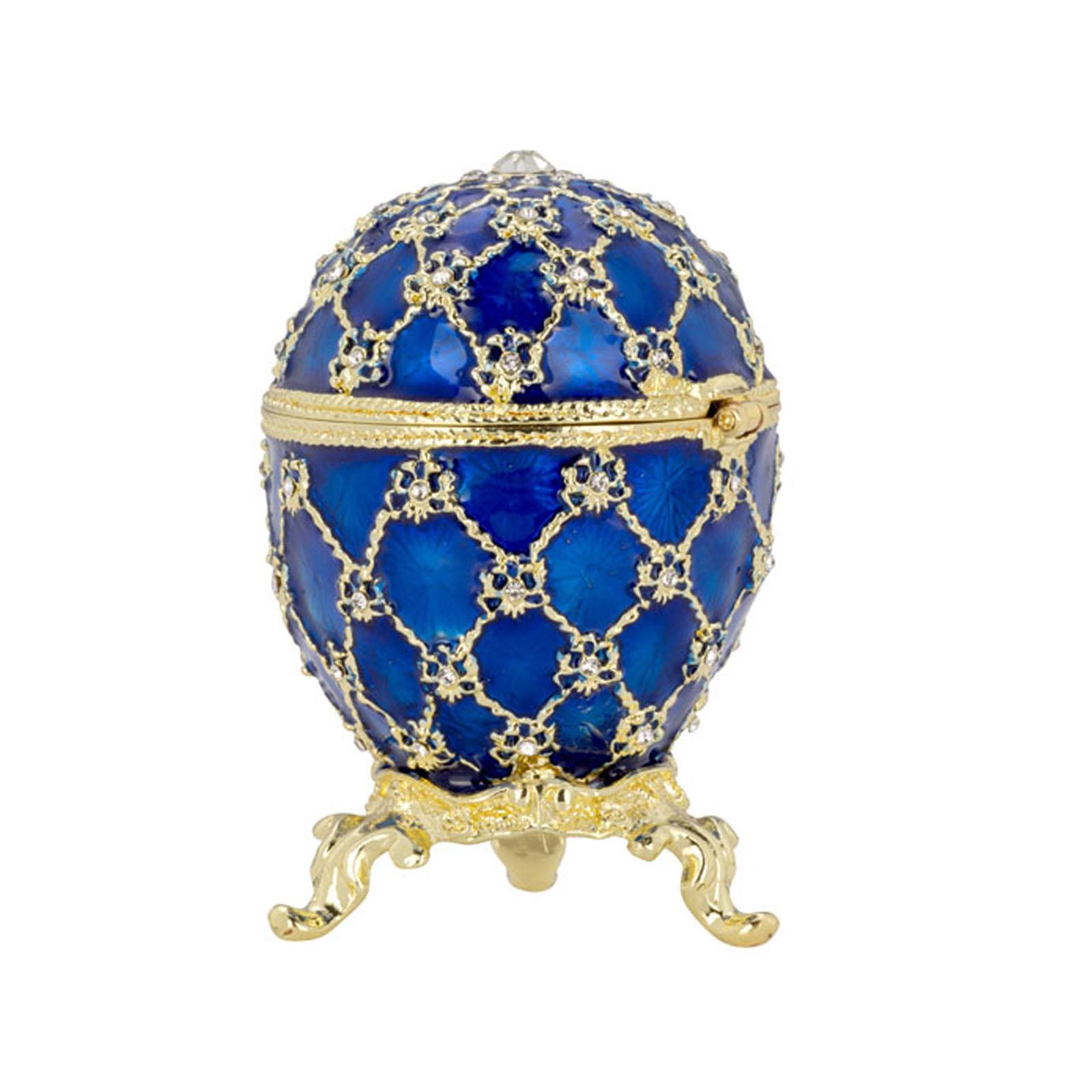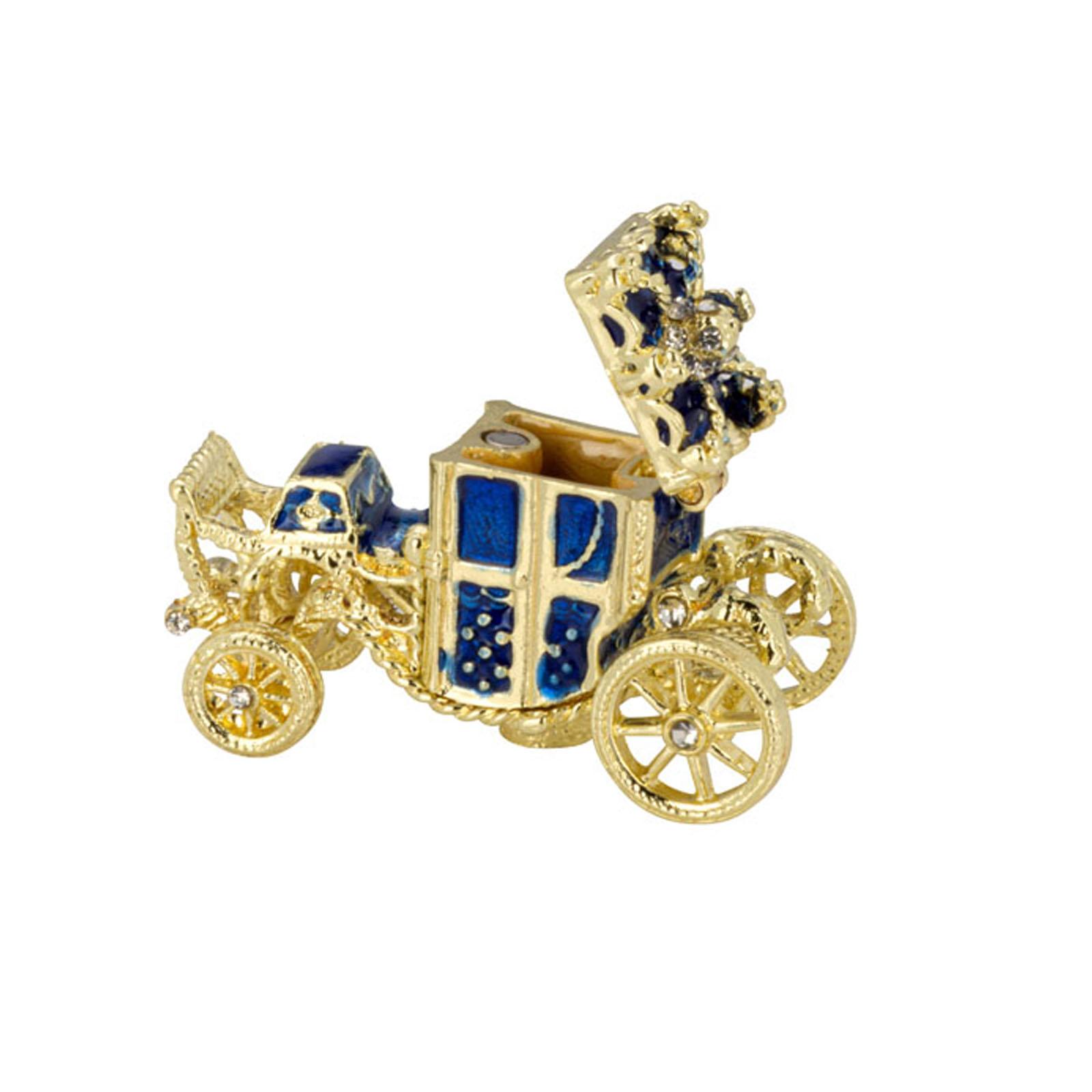 ✓ Stilvolle, kleine Schmuckdose in Blau mit goldfarbenen Details & Strasssteinchen als edler Blickfang ✓ Aufklappbare Aufbewahrungsdose aus emailliertem Zinkdruckguss für Ringe, Ohrringe & Halsketten ✓ Die kompakte Größe mit ca. 7 cm Höhe und drei Zierfüßchen findet auf Sideboards oder Regalen Platz ✓ Innenfach mit herausnehmbarer Mini-Kutsche, welche zum Öffnen ist - für eine separate Dekoration ✓ Vergoldete Mini Ei-Dose als Geschenkidee & stilvolle Dekoration für Wohn- & Präsentationsbereiche