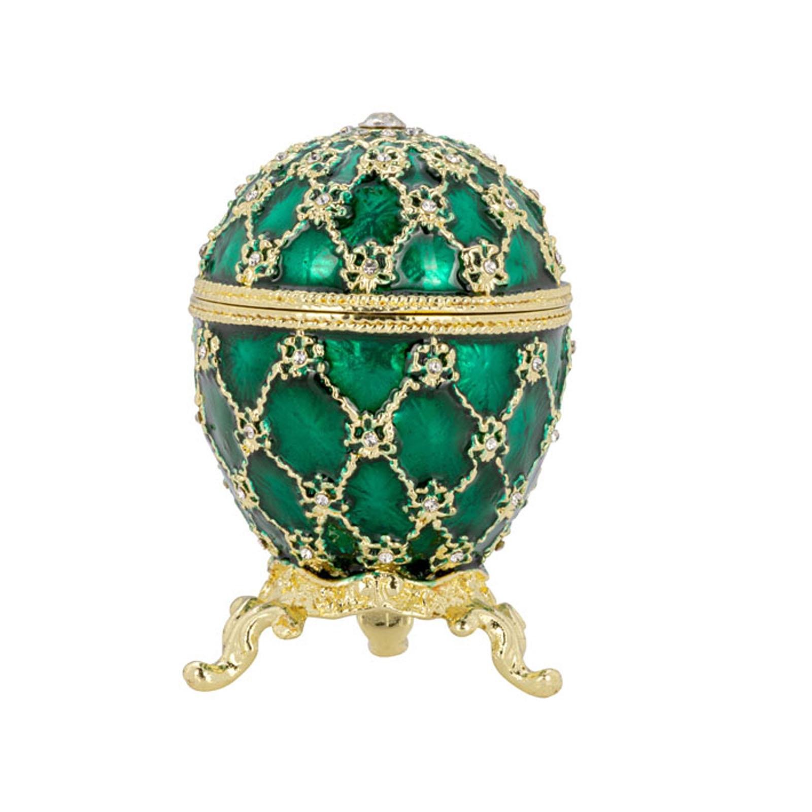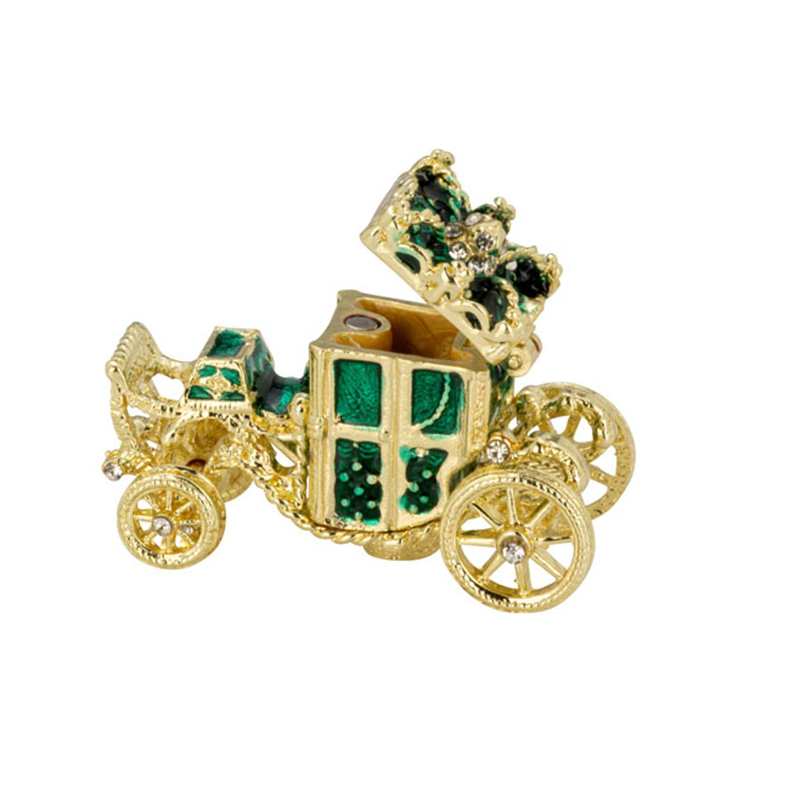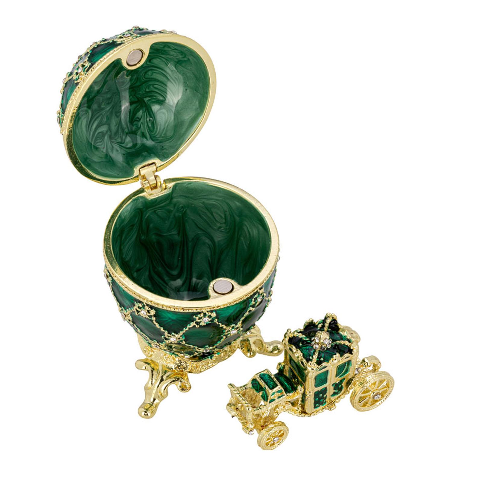 ✓ Stilvolle, kleine Schmuckdose in Grün mit goldfarbenen Details & Strasssteinchen als edler Blickfang ✓ Aufklappbare Aufbewahrungsdose aus emailliertem Zinkdruckguss für Ringe, Ohrringe & Halsketten ✓ Die kompakte Größe mit ca. 7 cm Höhe und drei Zierfüßchen findet auf Sideboards oder Regalen Platz ✓ Innenfach mit herausnehmbarer Mini-Kutsche, welche zum Öffnen ist - für eine separate Dekoration ✓ Vergoldete Mini Ei-Dose als Geschenkidee & stilvolle Dekoration für Wohn- & Präsentationsbereiche