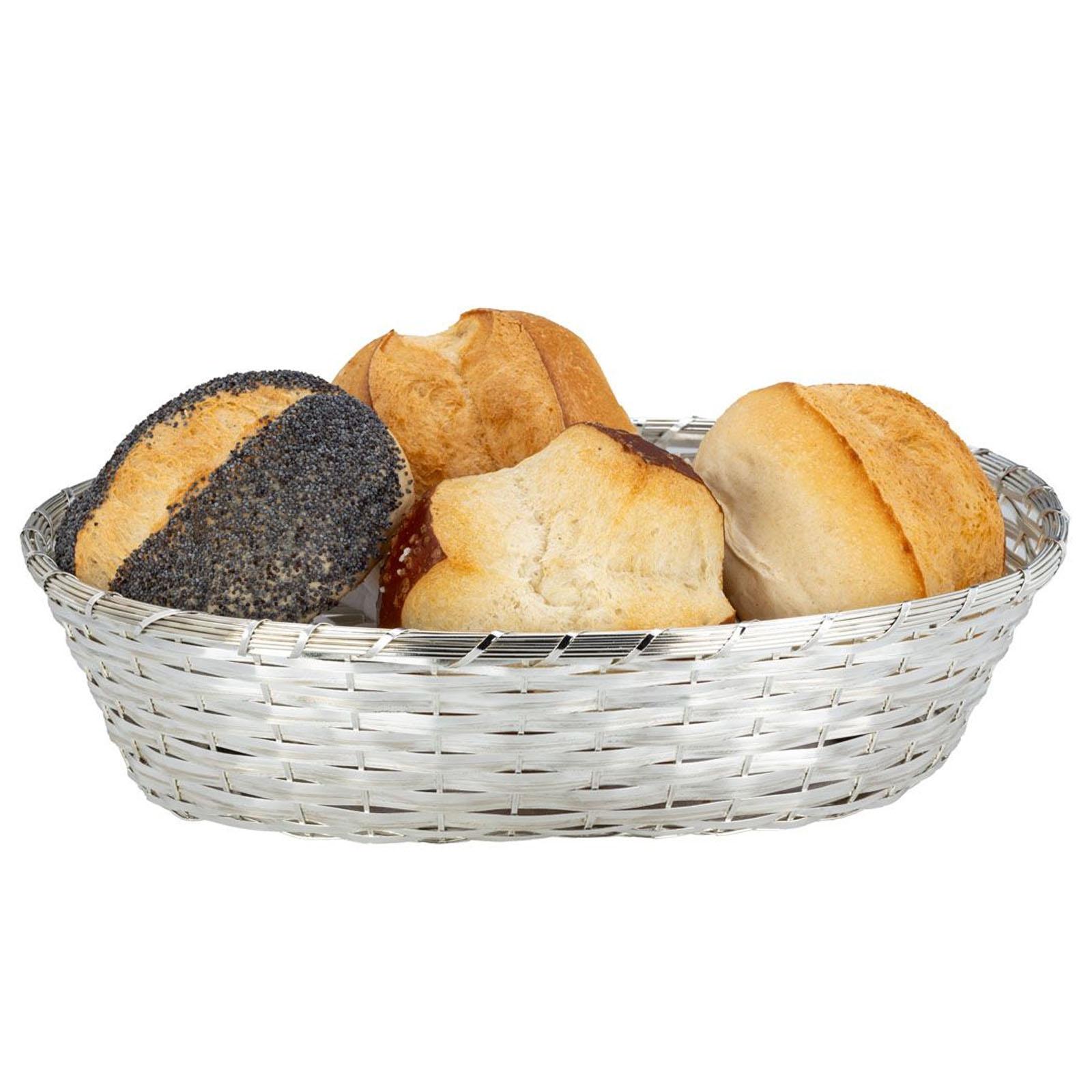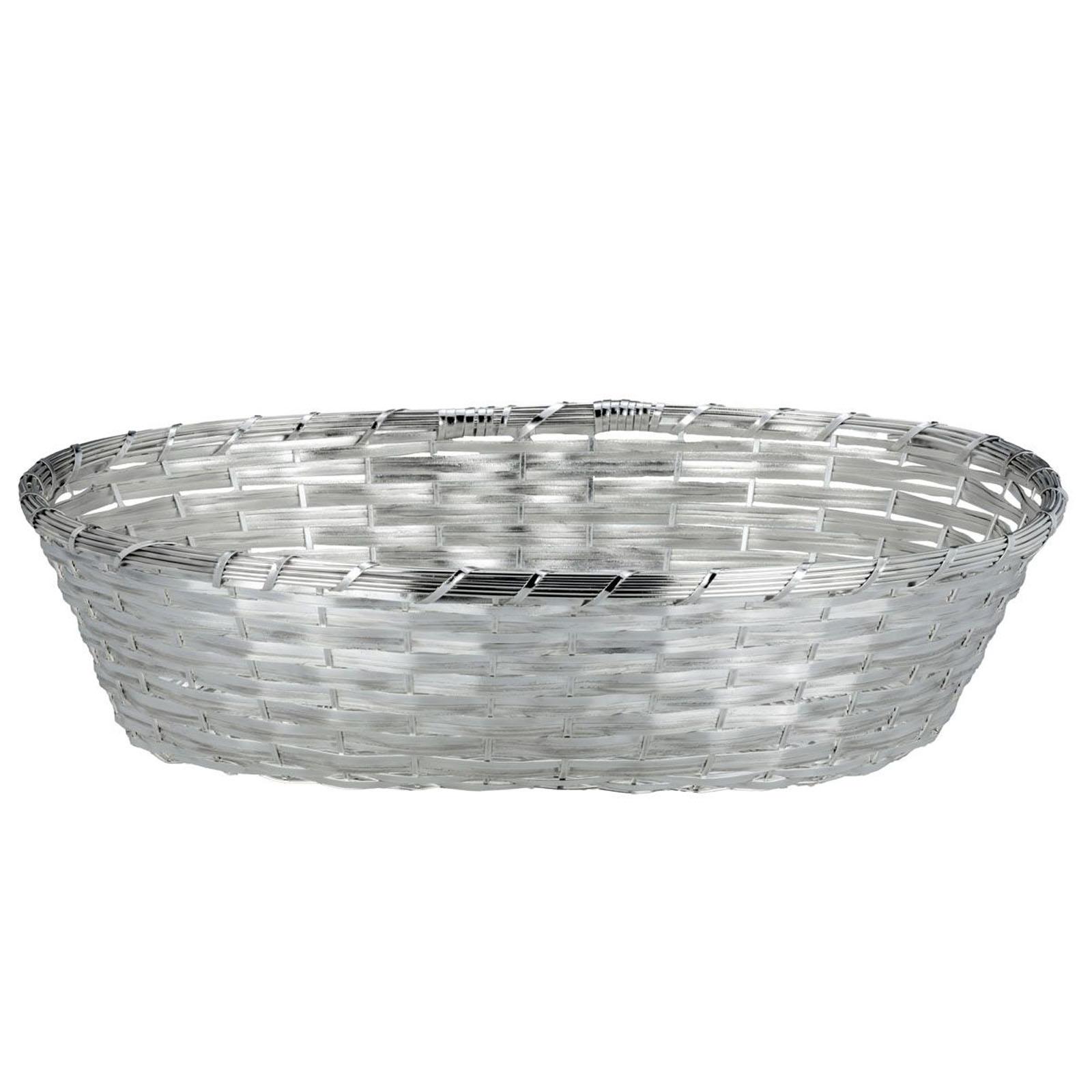 • Länge ca.: 30.5 cm • Breite ca.: 21.5 cm • Höhe ca.: 7.5 cm • Material: Metall • Beschichtung: versilbert • Veredelung: anlaufgeschützt • Oberfläche: geflochten • spülmaschinengeeignet: nein • Farbe: silber • Funktionalität: Zum Anrichten und Servieren von Backwaren • Platzierungsart: Zum Aufstellen bei Mahlzeiten • Form: oval • Dimension: groß