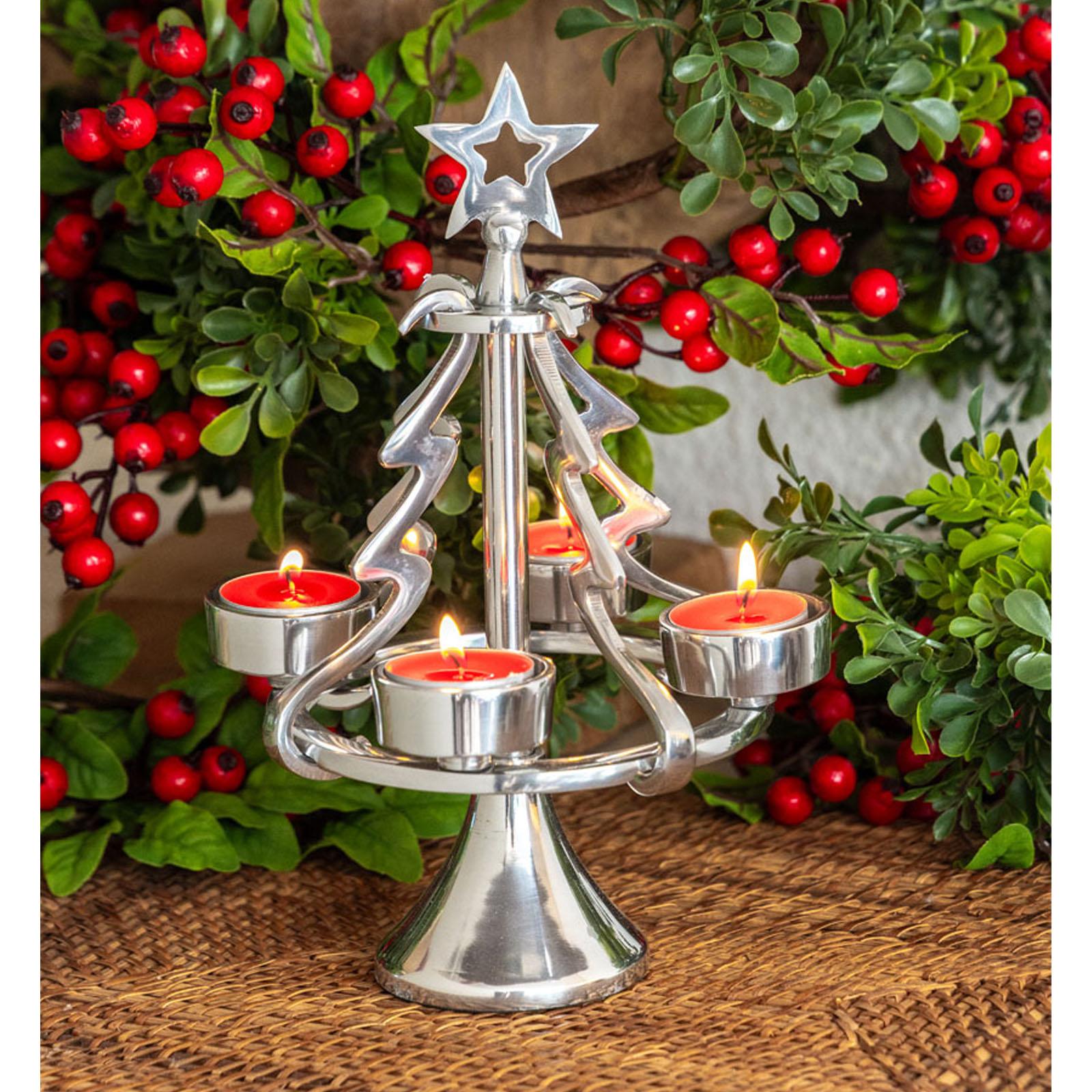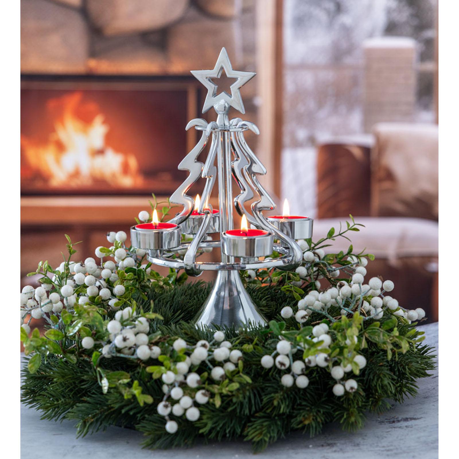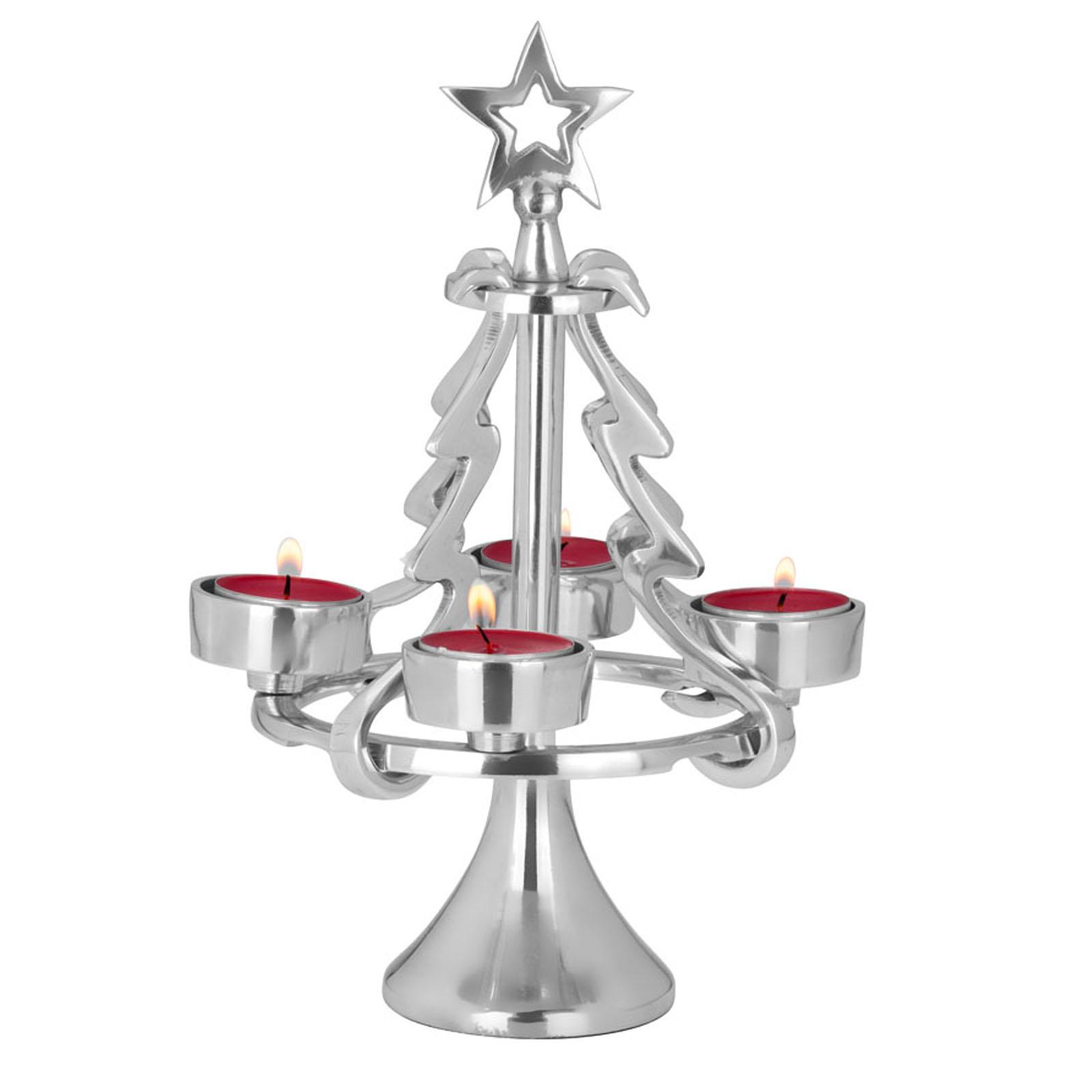 • Länge ca.: 18.0 cm • Breite ca.: 18.0 cm • Höhe ca.: 27.0 cm • Durchmesser ca.: 18.0 cm • Material: Aluminium • Beschichtung: Aluminium • Oberfläche: glatt poliert • spülmaschinengeeignet: nein • Farbe: silber • Ausstattung: für 4 Teelichter • Ausstattung 1: platzsparend zerlegbar • Funktionalität: Zum Halten von Teelichtern • Dimension: mittel • Motiv: Weihnachtsbaum