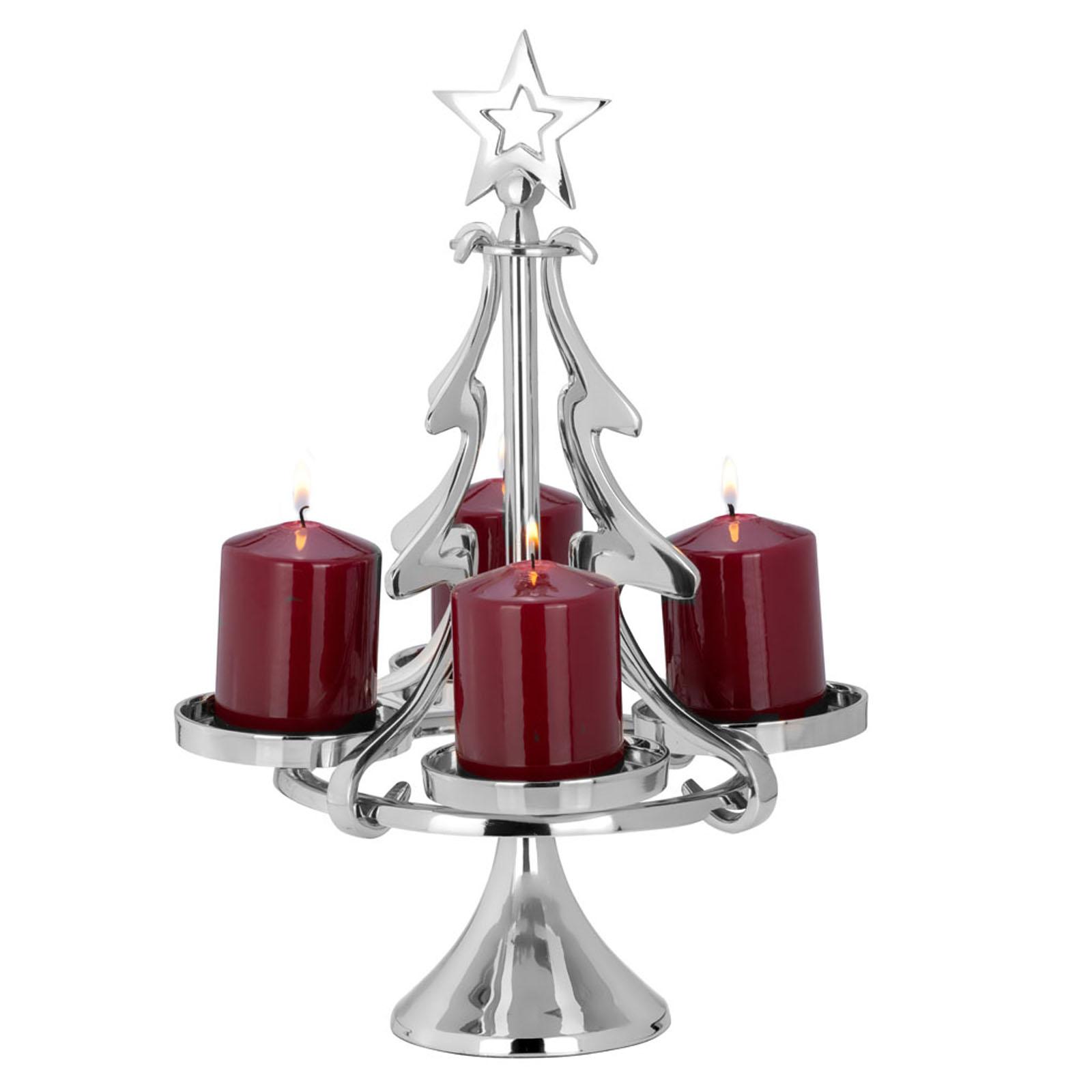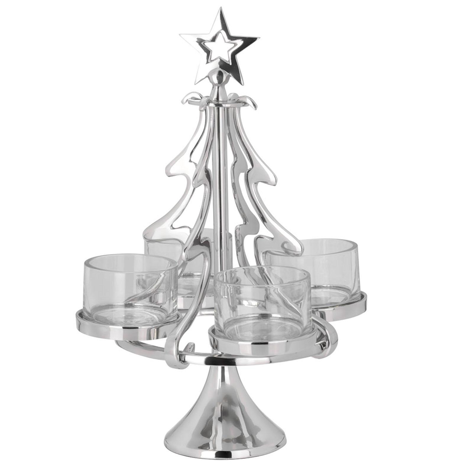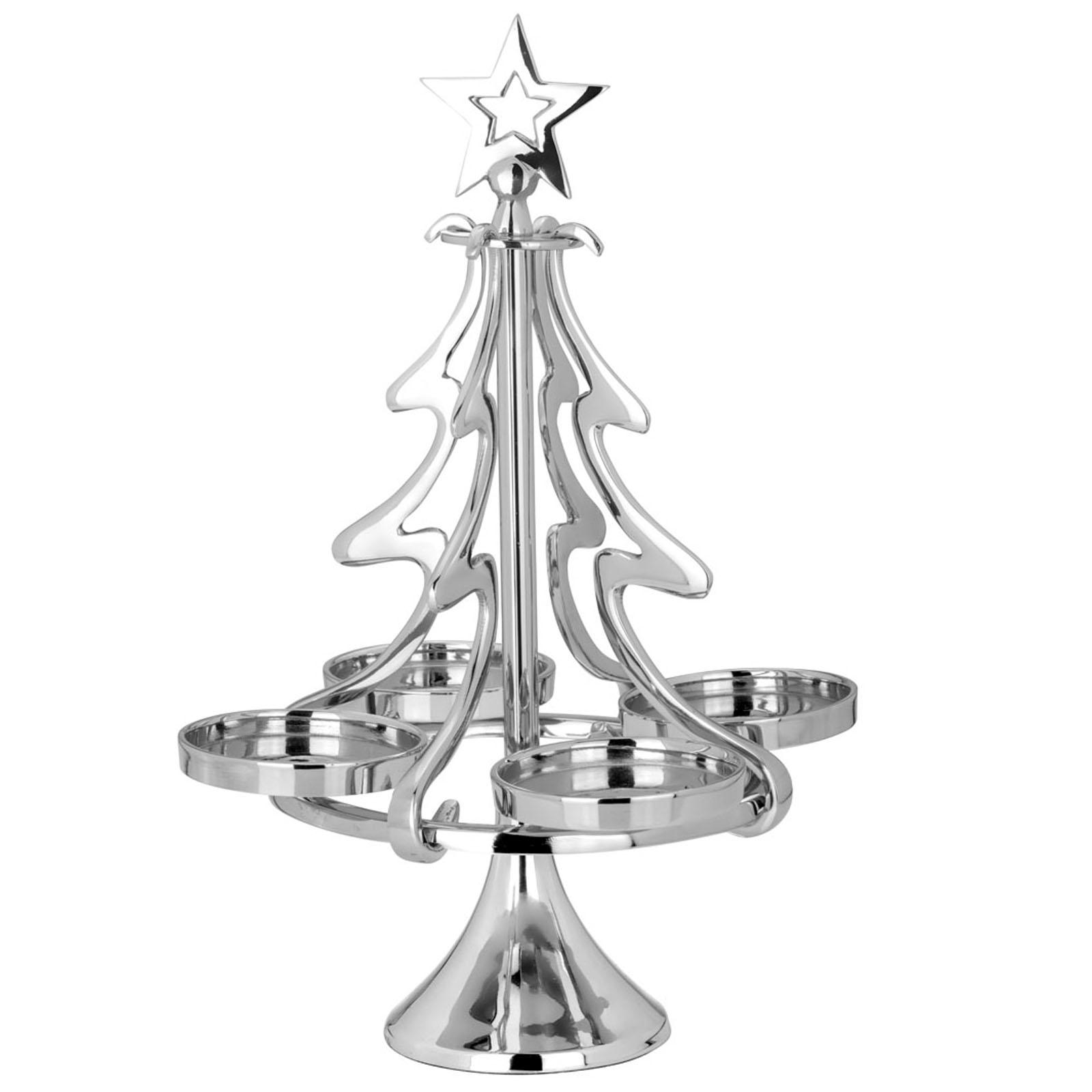 • Länge ca.: 25.0 cm • Breite ca.: 25.0 cm • Höhe ca.: 37.0 cm • Durchmesser ca.: 25.0 cm • Material: Aluminium • Beschichtung: Aluminium • Oberfläche: glatt poliert • spülmaschinengeeignet: nein • Farbe: silber • Ausstattung: für 4 Teelichter oder 4 Stumpenkerzen • Ausstattung 1: platzsparend zerlegbar • Funktionalität: Zum Halten von Teelichtern • Dimension: groß • Motiv: Weihnachtsbaum