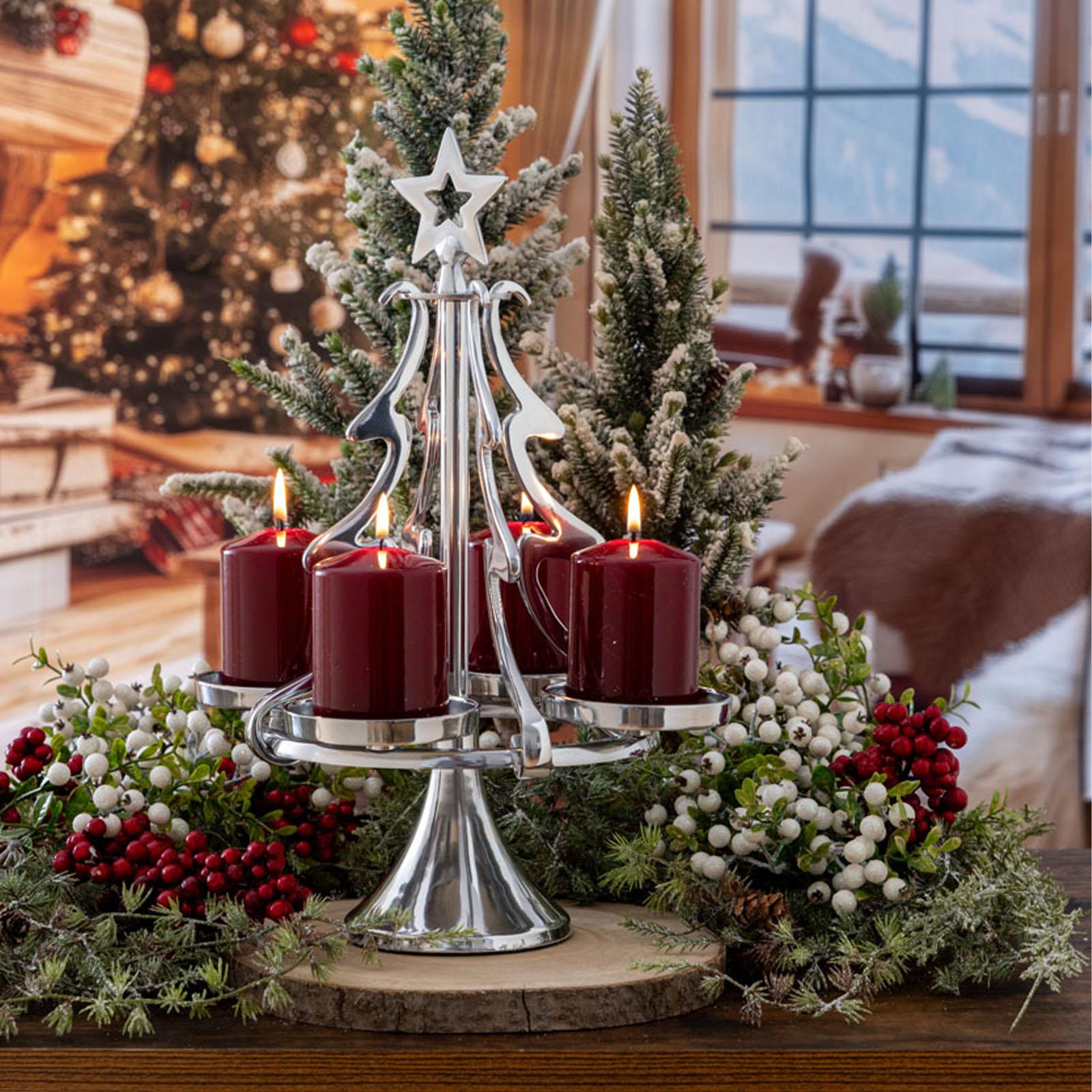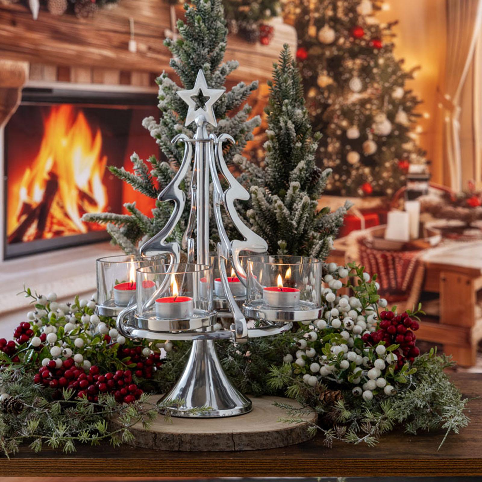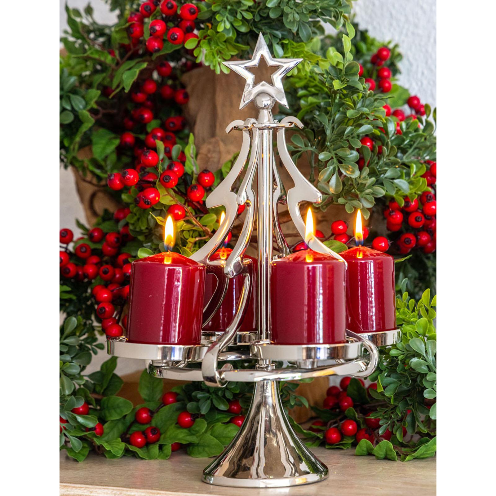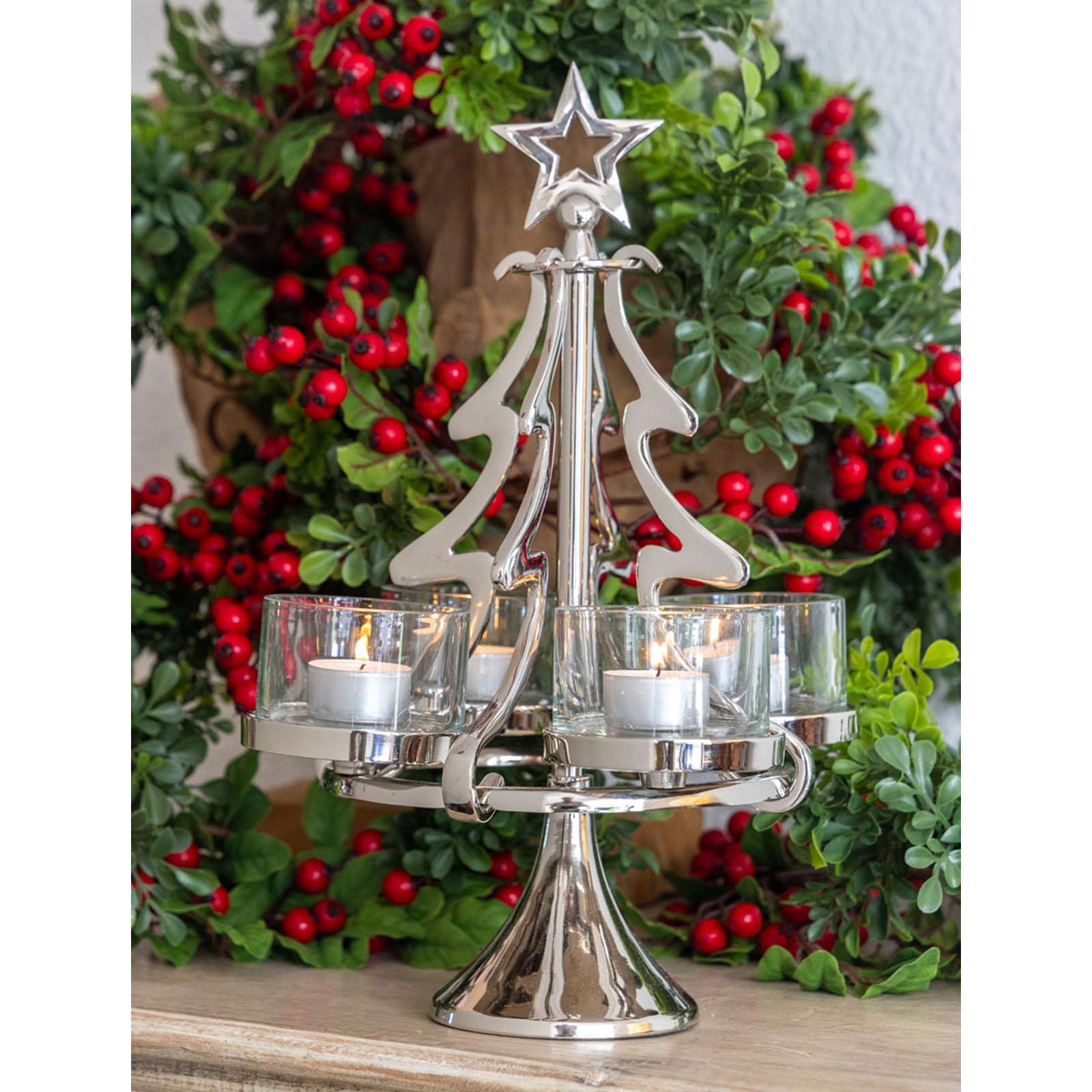 • Länge ca.: 25.0 cm • Breite ca.: 25.0 cm • Höhe ca.: 37.0 cm • Durchmesser ca.: 25.0 cm • Material: Aluminium • Beschichtung: Aluminium • Oberfläche: glatt poliert • spülmaschinengeeignet: nein • Farbe: silber • Ausstattung: für 4 Teelichter oder 4 Stumpenkerzen • Ausstattung 1: platzsparend zerlegbar • Funktionalität: Zum Halten von Teelichtern • Dimension: groß • Motiv: Weihnachtsbaum