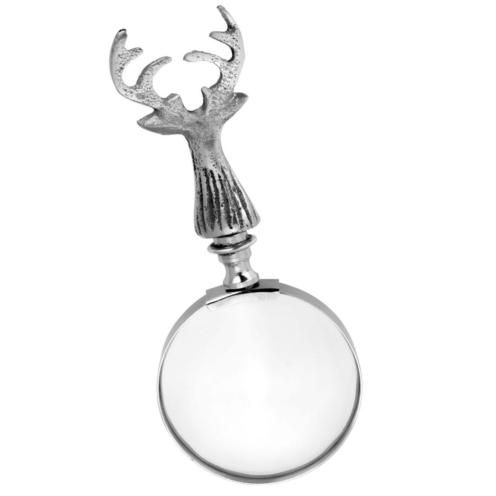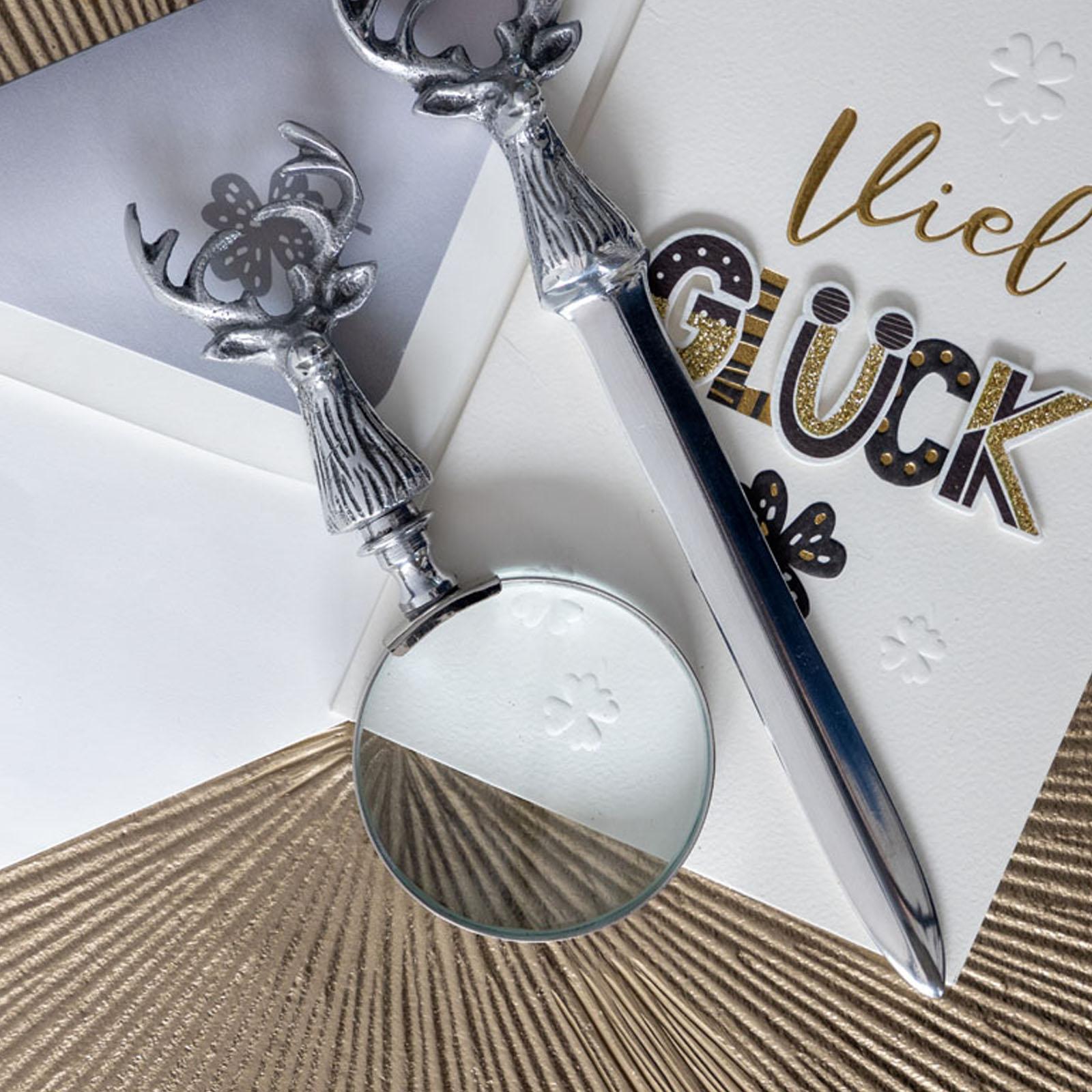 • Länge ca.: 15.0 cm • Breite ca.: 6.5 cm • Höhe ca.: 2.0 cm • Material: Aluminium • Material 1: Glas • Beschichtung: Aluminium • spülmaschinengeeignet: nein • Farbe: silber • Dimension: klein • Motiv: Hirschkopf