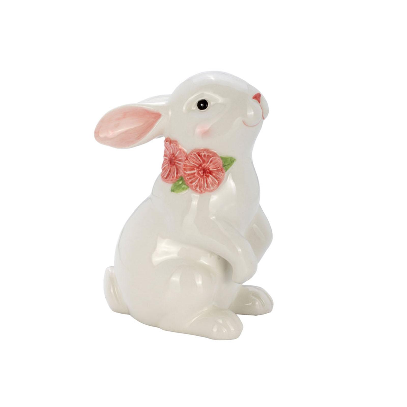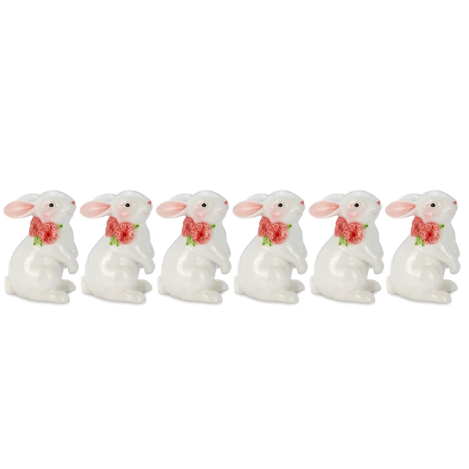 • Länge ca.: 5.7 cm • Breite ca.: 4.5 cm • Höhe ca.: 8.5 cm • Material: Keramik • Beschichtung: Keramik • Oberfläche: glatt • spülmaschinengeeignet: nein • Farbe: weiss • Ausstattung: mit rosa Blumen am Hals • Funktionalität: Zum Dekorieren in der Osterzeit • Platzierungsart: Zum Aufstellen • Dimension: klein • Motiv: Hase • Motiv-Design: stehende Häschen • Setumfang: 6-teilig
