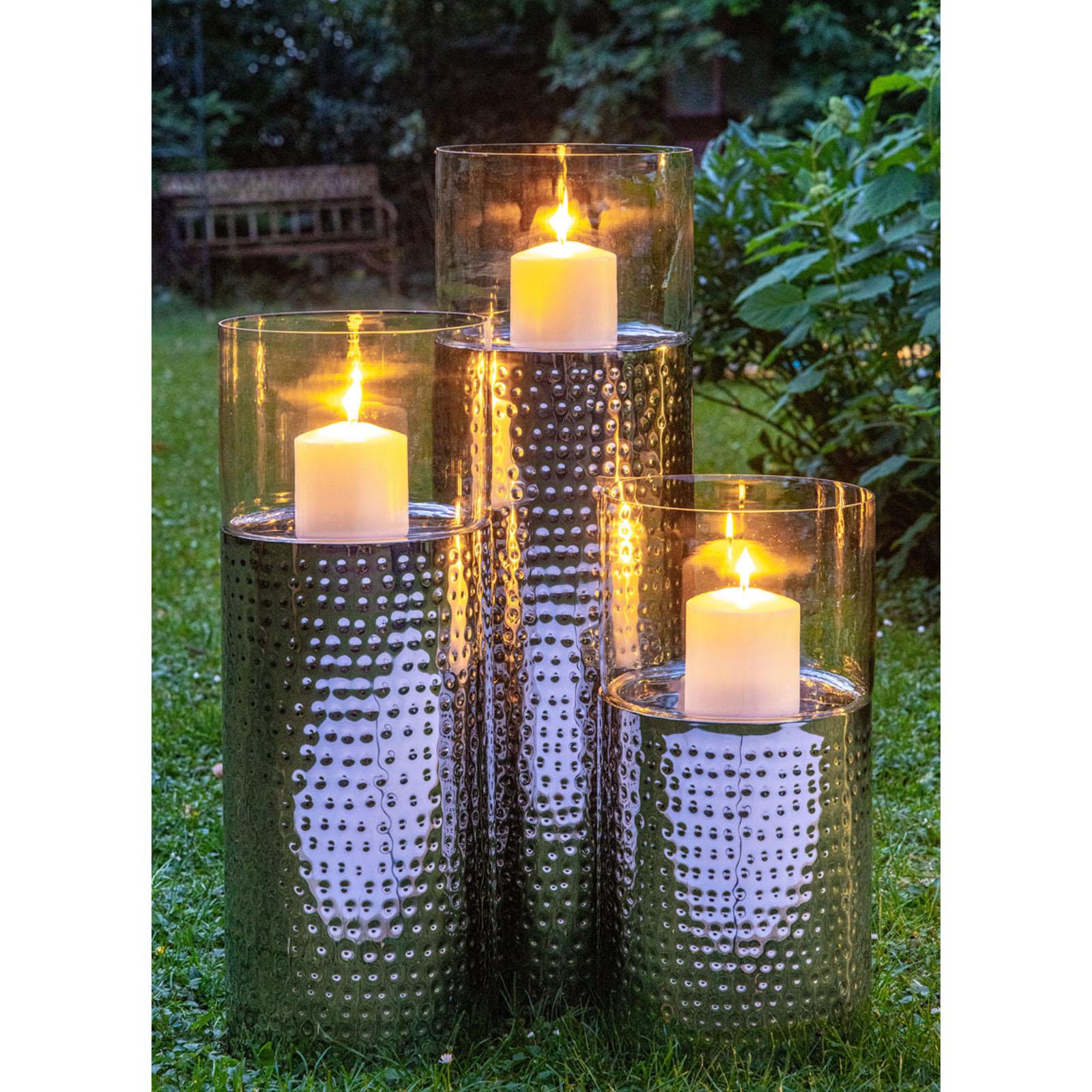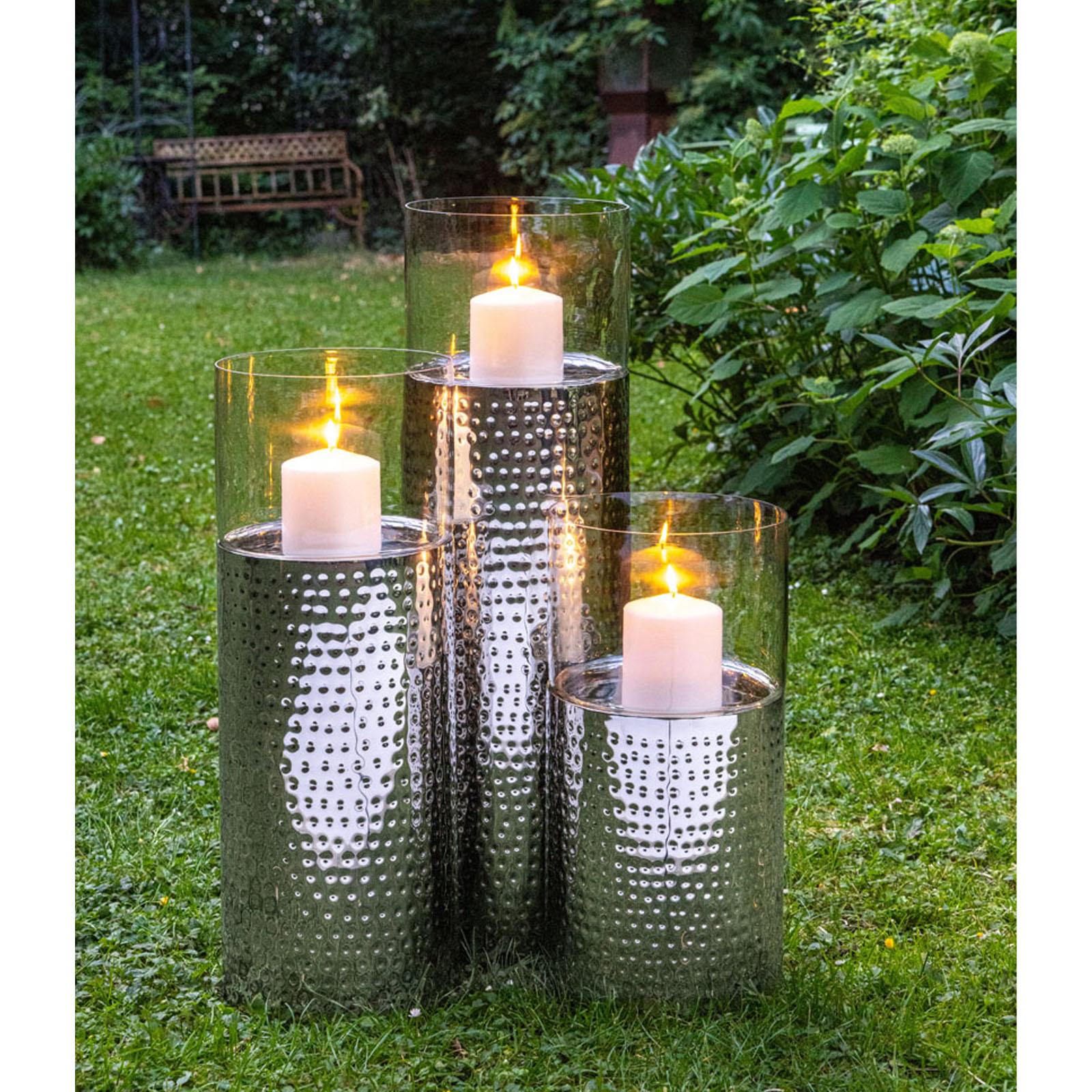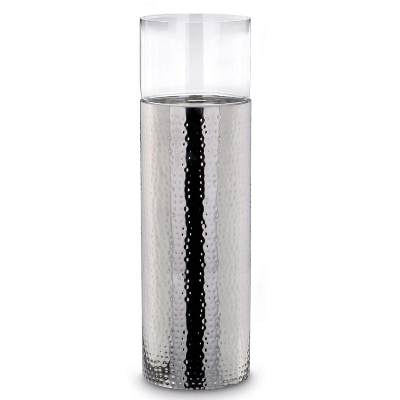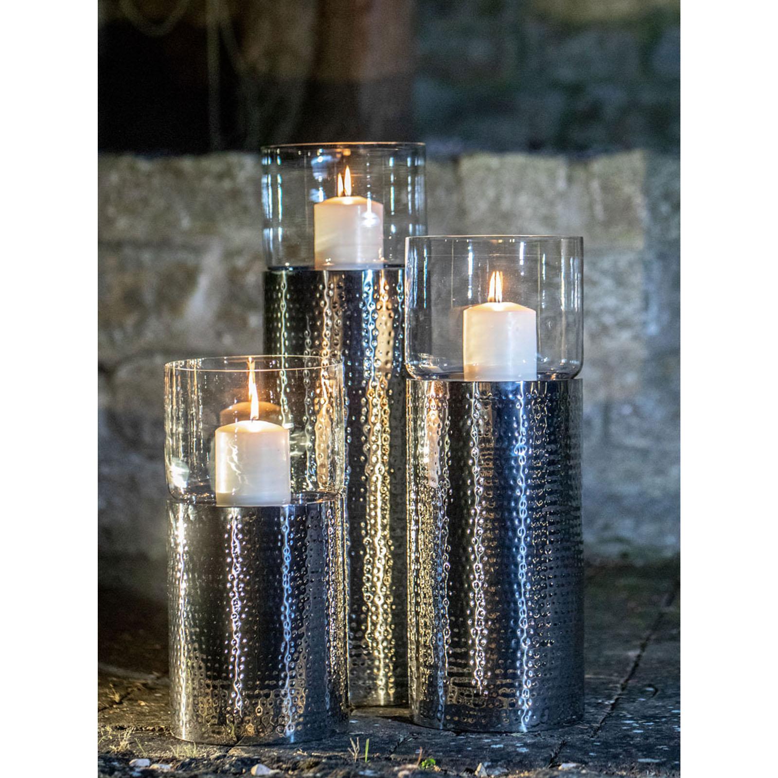• Länge ca.: 79.0 cm • Breite ca.: 24.0 cm • Höhe ca.: 79.0 cm • Durchmesser ca.: 24.0 cm • Detailmaß ca.: Metall-Höhe 61 cm / Glas-Höhe 18 cm • Material: Edelstahl • Material 1: Glas • Beschichtung: Edelstahl • Oberfläche: glatt poliert • Oberfläche Details: gehämmert • spülmaschinengeeignet: nein • Farbe: silber • Eigenschaft: Glaszylinder abnehmbar • Ausstattung: offener Glasboden • Funktionalität: Zum Dekorieren und Beleuchten mit Kerzen • Platzierungsart: Zum Aufstellen • Form: säulenform • Dimension: groß • Setumfang: 2-teilig