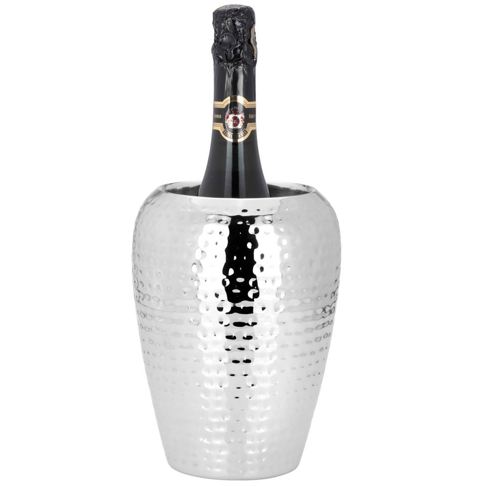 • Länge ca.: 20.5 cm • Breite ca.: 15.0 cm • Höhe ca.: 20.5 cm • Durchmesser ca.: 15.0 cm • Material: Edelstahl • Beschichtung: Edelstahl • Oberfläche: glänzend poliert • Oberfläche Details: gehämmert • spülmaschinengeeignet: nein • Farbe: silber • Eigenschaft: doppelwandig • Ausstattung: innen glatt & außen gehämmert • Funktionalität: Zum Kühlen & dekorativen Bereitstellen von Flaschen • Platzierungsart: Zum Aufstellen • Form: konisch • Dimension: groß • Besonderheit: auch als Vase verwendbar • Besonderheit I: für 1 Flasche oder Schnittblumen