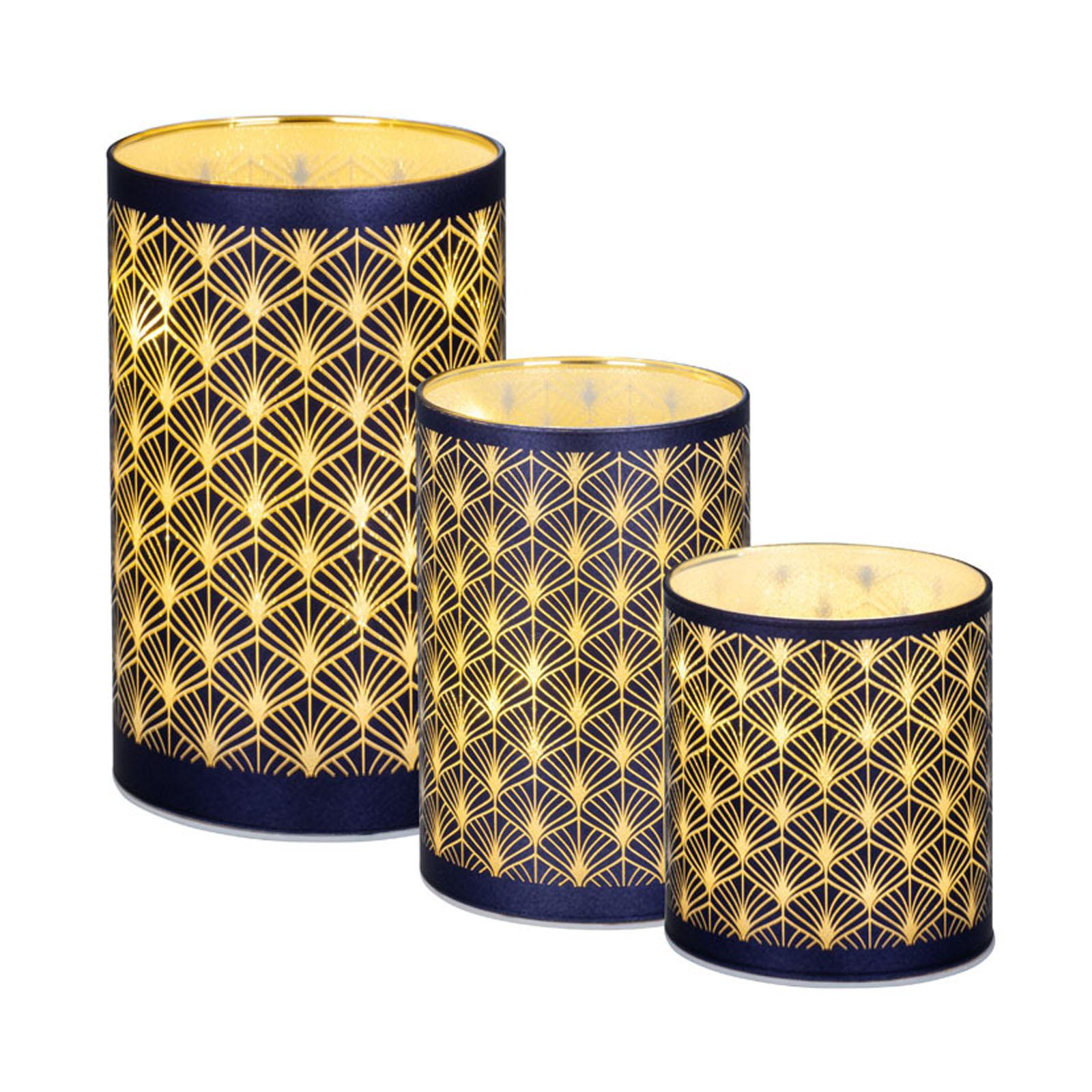 • Länge ca.: 9.0 cm • Breite ca.: 9.0 cm • Höhe ca.: 15.0 cm • Durchmesser ca.: 9.0 cm • Material: Glas • Oberfläche: glatt • Oberfläche Details: verziert • spülmaschinengeeignet: nein • Farbe: blau-gold • Eigenschaft: mit 10er LED-Lichterkette • Ausstattung: ohne Batterien (für 3xAA 1,5V Batterie) • Form: rund • Dimension: groß • Motiv-Design: blaue Ornamente