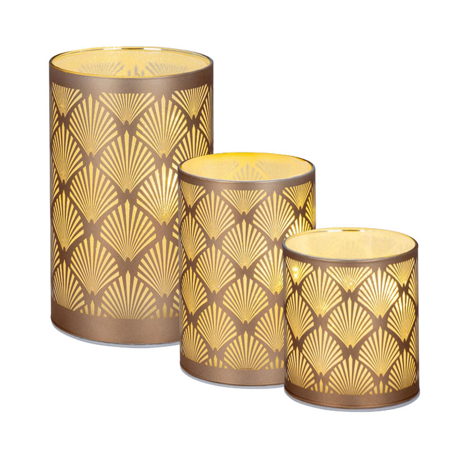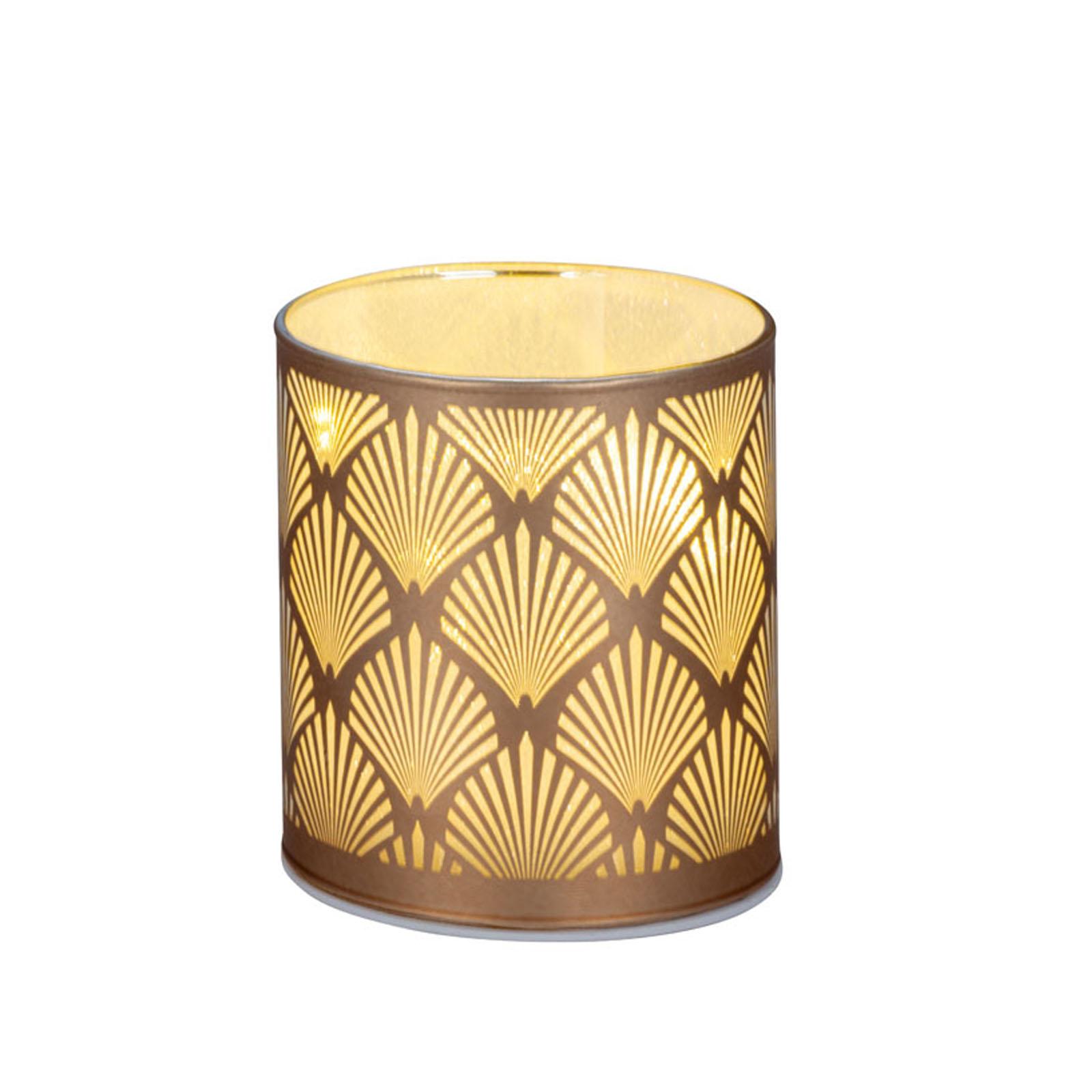 • Länge ca.: 7.5 cm • Breite ca.: 7.5 cm • Höhe ca.: 8.5 cm • Durchmesser ca.: 7.5 cm • Material: Glas • Oberfläche: glatt • Oberfläche Details: verziert • spülmaschinengeeignet: nein • Farbe: kupferfarben-gold • Eigenschaft: mit 6er LED-Lichterkette • Ausstattung: ohne Batterien (für 3xAAA 1,5V Batterie) • Form: rund • Dimension: klein • Motiv-Design: kupferfarbene Ornamente